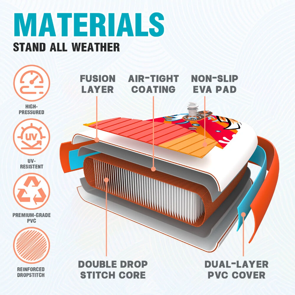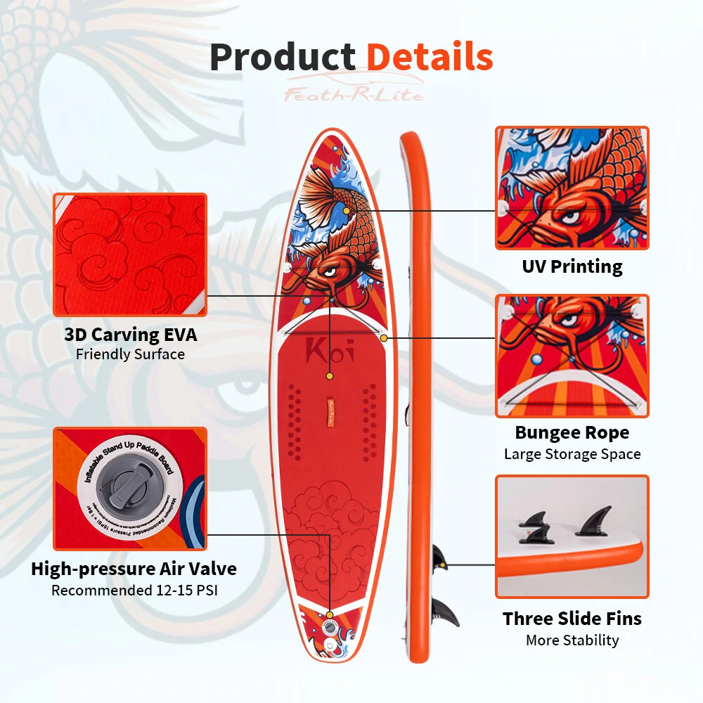 A D-gyűrűk és a prémium tartozékok gondoskodnak arról, hogy a SUP minden vízi kalandhoz ideális legyen, legyen szó paddle boardozásról, jógáról, túrázásról vagy horgászásról. A tetején csúszásgátlós felület segíti, hogy stabilabban megállj rajta, és a túrára, kirándulásra magaddal vitt cuccaidat is kényelmesen tárolhatod elöl, a bungee-ban. A színes dizájn (a 350 cm-es változat 3 dekoratív, a 335 cm-es deszka pedig további 2 tetszetős színben is elérhető) és a FunWatertől megszokott minőség garantálja, hogy bármelyik SUP-juk nemcsak praktikus, hanem stílusos választás is.