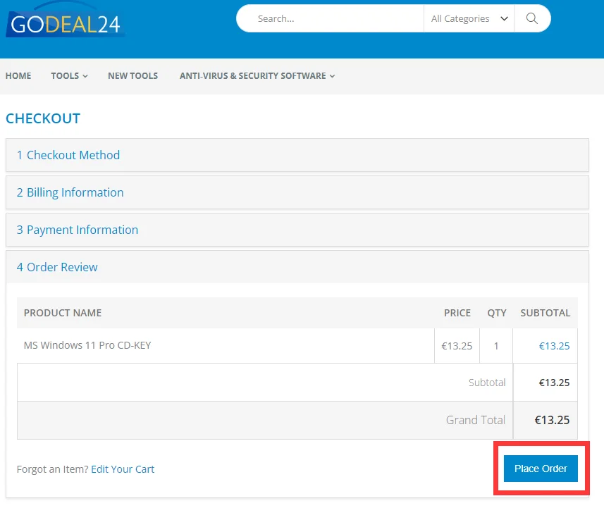 Ellenőrizzétek, hogy minden adat helyes-e és valóban csak az volt a kosárban, amire szükségetek van, majd nyomjátok meg a Place Order gombot.