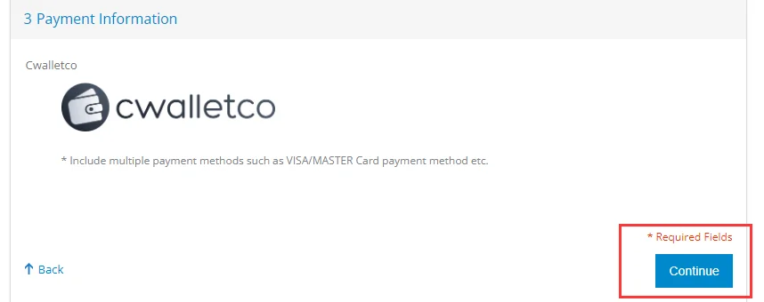 A következő lépésben válasszátok ki a Payment Information pontban a CWALLETCO opciót.