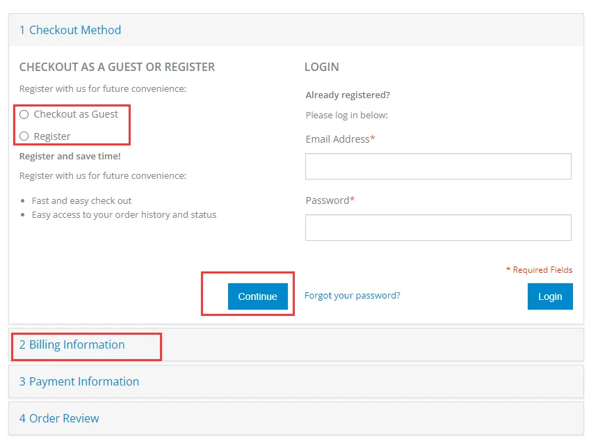 A termék kiválasztását és kosárba helyezését követően irány a Checkout oldal, ahol folytathatjátok a regisztrációval vagy regisztráció nélkül is a folyamatot. Ezután adjátok meg a számlázási adataitokat.