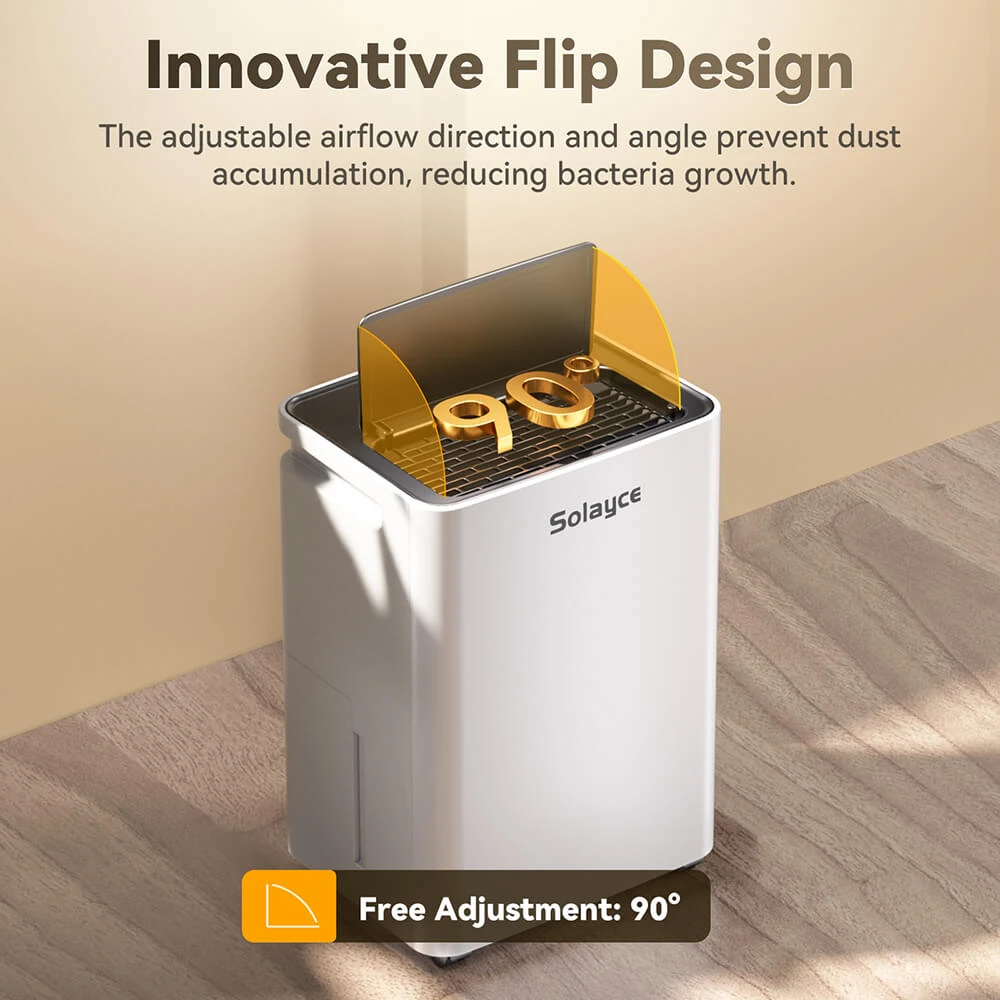 A Solayce PD12R-02EE modern, 90°-ban állítható légáramlási rendszerrel rendelkezik, amely segít a levegő egyenletesebb eloszlásában, csökkenti a por felhalmozódását, és még a kiteregetett ruháidat is gyorsabban megszárítja.