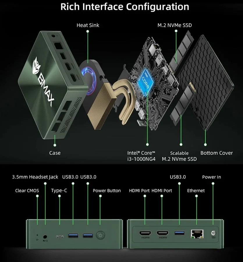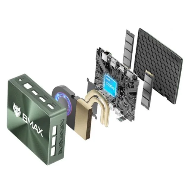A BMAX B6 Plus megjelenése fiatalosabb, modernebb lett a régebbi típusokhoz képest, nekem ez a zöldes szín nagyon bejön. Kompakt, hordozható kialakítású, mindössze 370 g és könnyen felszerelhető a monitorok hátuljára. Egy Intel Core i3-1000NG4 processzorral érkezik, ami egy 10. generációs központi egység. 12 GB DDR4 memóriát kapott, az adattárolásról az 512 GB-os gyors SSD gondoskodik.