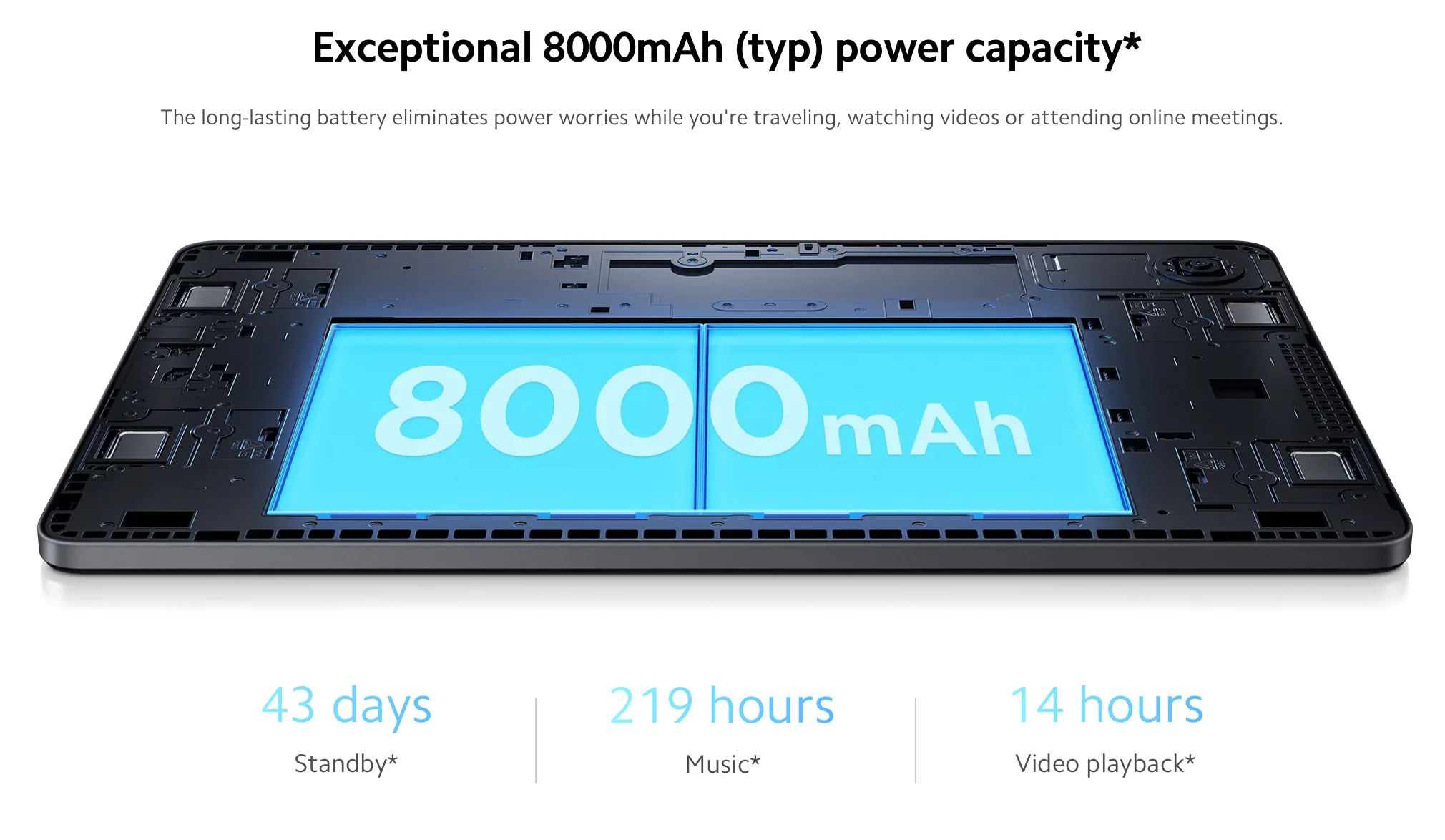 A tablet energiaellátásáról a 8000 mAh-s akkumulátor gondoskodik, amit maximum 10 wattal, Type-C porton keresztül lehet tölteni. Nagyjából 43 nap készenléti időt biztosít, de 14 óra videólejátszásra is elegendő.Utóbbi egy ekkora kijelzőn és a 4 darab, sztereóban megszólaló hangszóróval kimondottan jó élmény is lesz, hiszen még Dolby Atmos támogatással is felvértezték a Redmi Pad SE-t.