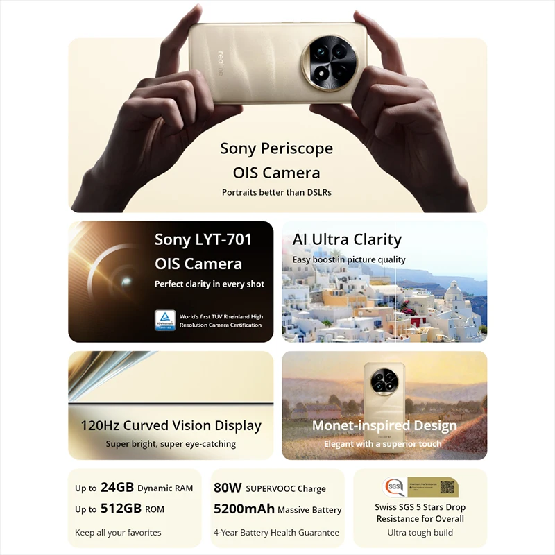 Ha még egy szinttel magasabbra vágysz, akkor a Realme 13 Pro Plus a tökéletes választás számodra. A Snapdragon 7s Gen 2 processzor itt is jelen van, de 80 W-os SUPERVOOC gyorstöltéssel párosul, amely lehetővé teszi, hogy a 5200 mAh-s akkumulátort mindössze 20 perc alatt 50%-ra töltsd. Ez a fajta töltési sebesség igazán hasznos, ha kevés az időd, de szükséged van a maximális teljesítményre.