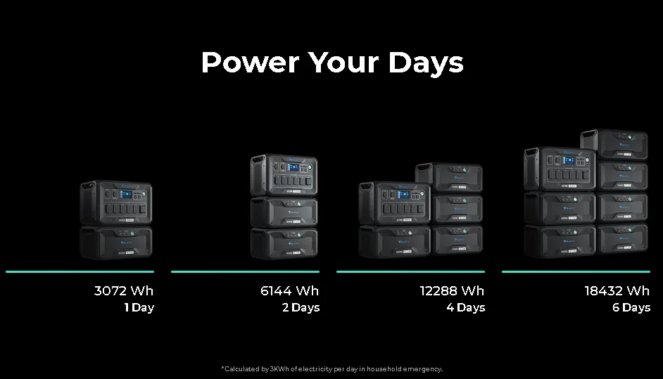 ami nem tűnik olyan soknak, ezért találták ki a moduláris bővíthetőséget – ezt szokták stackelésnek is hívni -, amivel nemcsak a kapacitás bővíthető tetszés szerint, hanem a terhelhetőség is nő az újabb modulok csatlakoztatásával. Ezeket a modulokat hívja a BLUETTI B300S-nek – de a sima B300-zal is bővíthető – ami további 3072 órás telepeket jelent, ezekből maximum 6 darabot lehet összefűzni, így jön ki a 18 432 Wh-s kapacitás. A terhelhetőség pedig az alábbiak szerint alakul: 1 darab AC500+1 db B300S terhelhető 3000, míg +2 darab B300S terhelhető 5000 W-tal. Van az oldalukon egy remek ábra, ahol állítgathatjátok a terhelési értékeket, és a funkció pedig visszaadja, hogy a berendezéseiteket adott terhelés mellett meddig szolgálná ki a rendszer. A rendszer kiegészíthető egy úgynevezett „transfer switch”-csel is, ilyenkor 2 darabb AC500 a mögé kötött 6 darab akkumulátorral összekapcsolható, így a végső kapacitás 36 000 wattórára emelkedik.