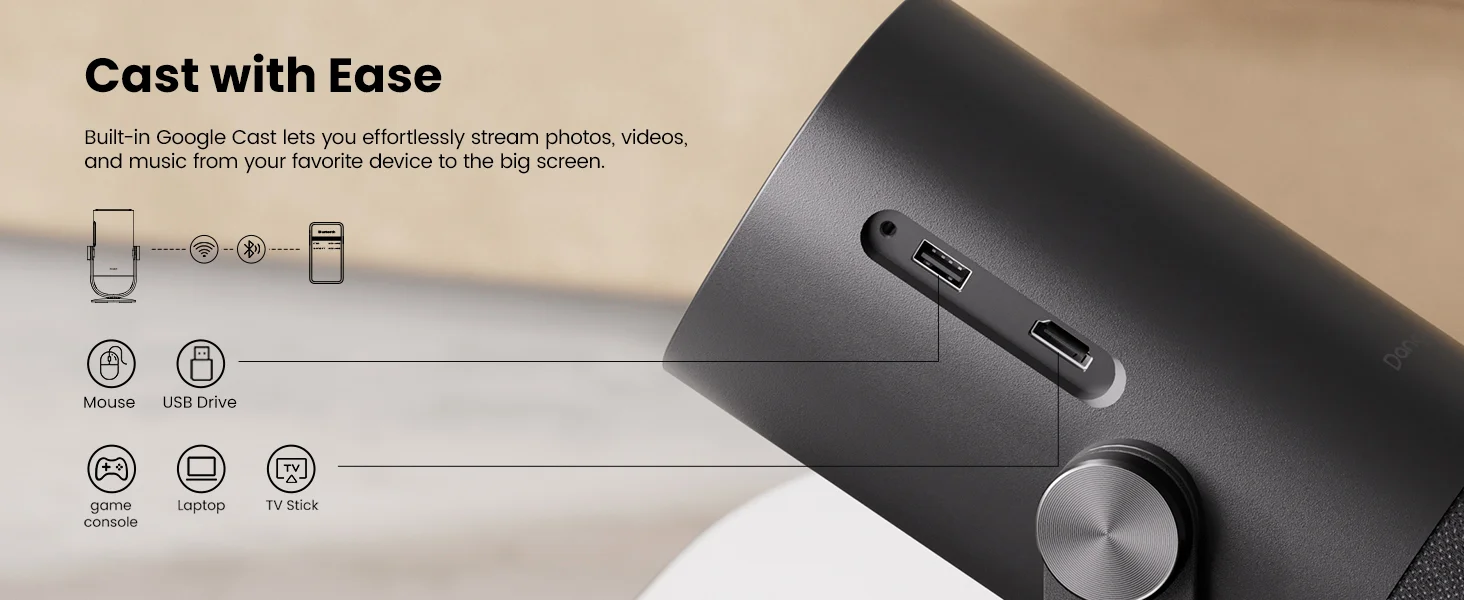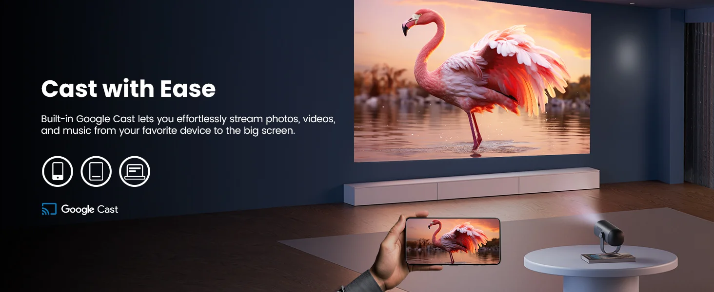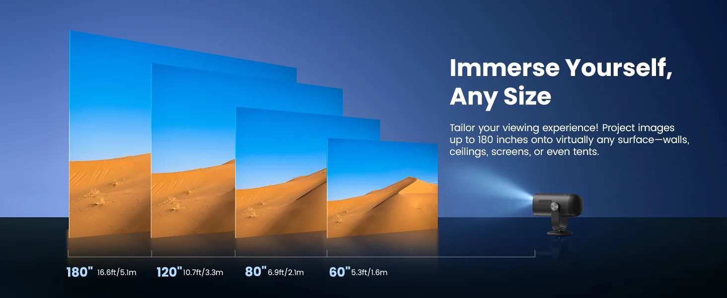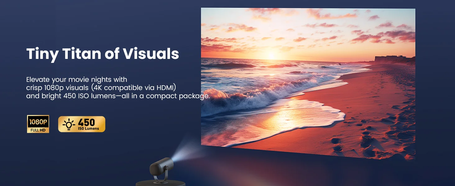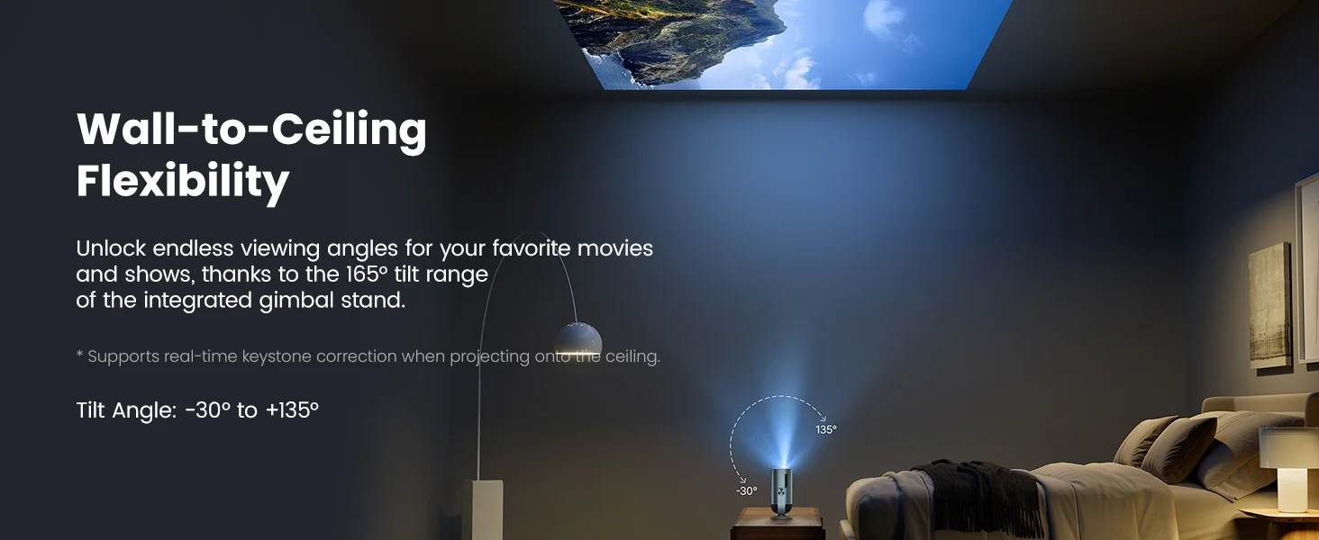 A kompakt méret (239x131x109 mm) és a könnyű tömeg (1,4 kg) miatt akár a táskádban is elfér, ráadásul a mellékelt állvánnyal pillanatok alatt beállíthatod a tökéletes szöget, hisz 135 fokig dönthető, így 40″-tól 180″-ig terjedő kijelzőméret akár a plafonon is megjelenhet.
