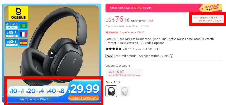 - 11.11-kor csekkolom az összes már előre bekészített terméket, hogy mennyire tudom levinni az árát. Ugye ezt előre nem lehet pontosan tudni, de a fenti kuponkódok ismertek, illetve 16$ kedvezményig minden egyes 20$ után ad az Aliexpress 4$ engedményt. Továbbá már most ki van írva minden termék esetében a 11.11-es alapár, ami ad némi támpontot, de a valóságban ezeket az árakat sokkal lejjebb lehet még vinni.