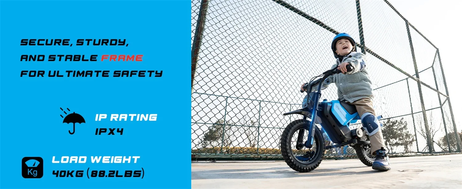 A 40 kilós terhelhetőségű motort egy hátsó tengelyen lévő dobfékkel lehet lassítani, ami kézi karral húzható be. Emellett természetesen mindenképp legyen a gyerkőcön bukósisak, térd- és könyökvédő, hogy megelőzzétek a komolyabb baleseteket.