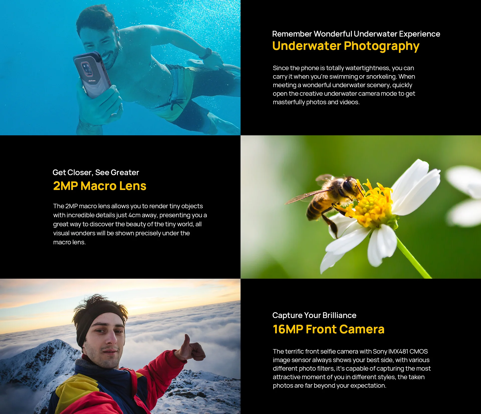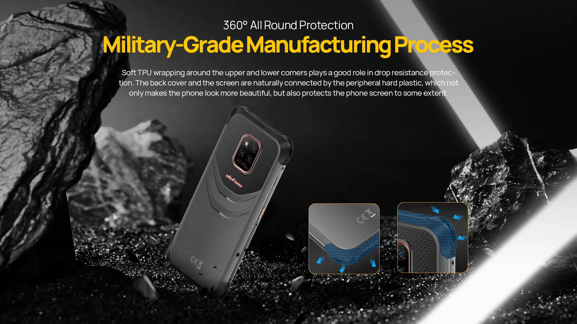 Az Ulefone Power Armor 14 egy strapatelefon, ennek megfelelően a készülék minden sarkát gumibevonatos erősítéssel látta el a gyártó, illetve a kijelző is Gorilla Glass-szal védett, bár az nem derül ki a hivatalos specifikációkból sem, hogy melyik verzió. Ezen felül az IP68 és IP69K szabványok szerint víz- és porálló, és még a MIL-STD-810G certifikációt is megkapta, ami egy katonai szabvány, így kibírja az 57 kPa-os nyomást, a magas páratartalmat, a tartós meleget, de még az enyhén savas környezetben sem megy tönkre. Ezeken felül az oldalán található egy extra, programozható gomb, amelyre három különböző feladatot is feltaníthattok, ugyanis a szoftver megkülönbözteti a rövid, hosszú és dupla gombnyomást is. 6 különböző funkció végrehajtását vagy bármilyen applikáció megnyitását megoldhatjátok egyetlen gomb megnyomásával.