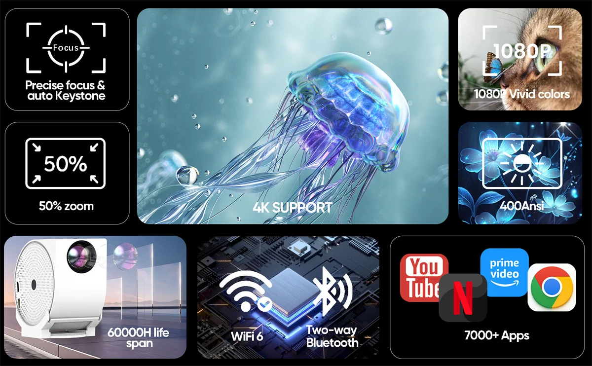 A projektor izzója brutális, 60 000 óra élettartamot ígér, ami simán kibír akár egy évtizednyi napi vetítést is. A csendes működés pedig külön ajándék, főleg ha egy nyári éjszakán, a csillagok alatt néznéd a kedvenc filmedet anélkül, hogy a ventilátor zaja elrontaná a hangulatot. Formátumtámogatás terén sem lehet panasz: videóból jöhet a HEVC, VP9, AVS2, AVC 4K@60fps, MPEG1, MPEG2, vagy akár az új AV1 1080p/60fps is. Képek közül a JPG, BMP és PNG formátumokat szereti, méretezési lehetőséggel együtt. A kezelőfelület pedig soknyelvű, beleértve az angolt, németet, spanyolt, franciát, koreait, oroszt, hébert, arabot és még sok más nyelvet is.