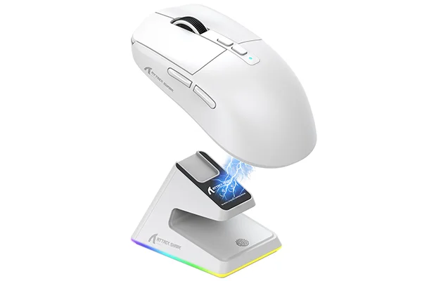 Az Attack Shark X6 a piac egyik legolcsóbb, töltőállomással is rendelkező gamer egere. Kifejezetten látványos, ahogyan a levegőben “lebegve” töltődik az egér, ráadásul a műszaki paraméterei is impozánsak a szettnek.