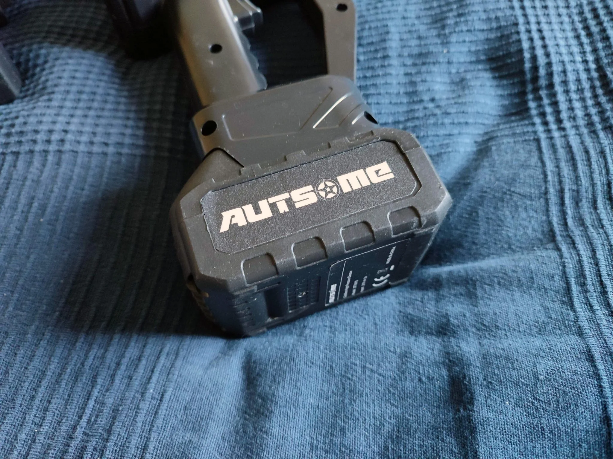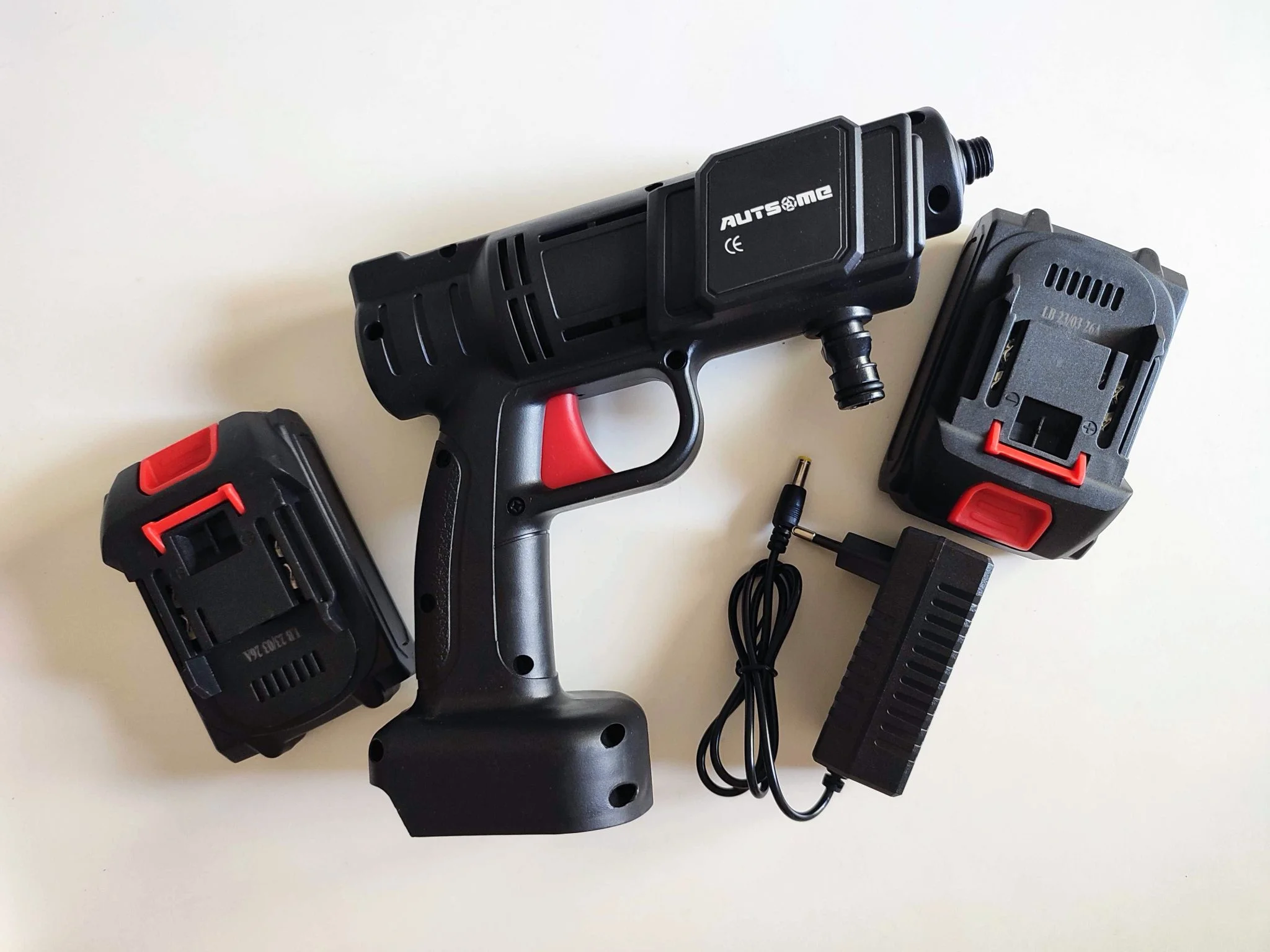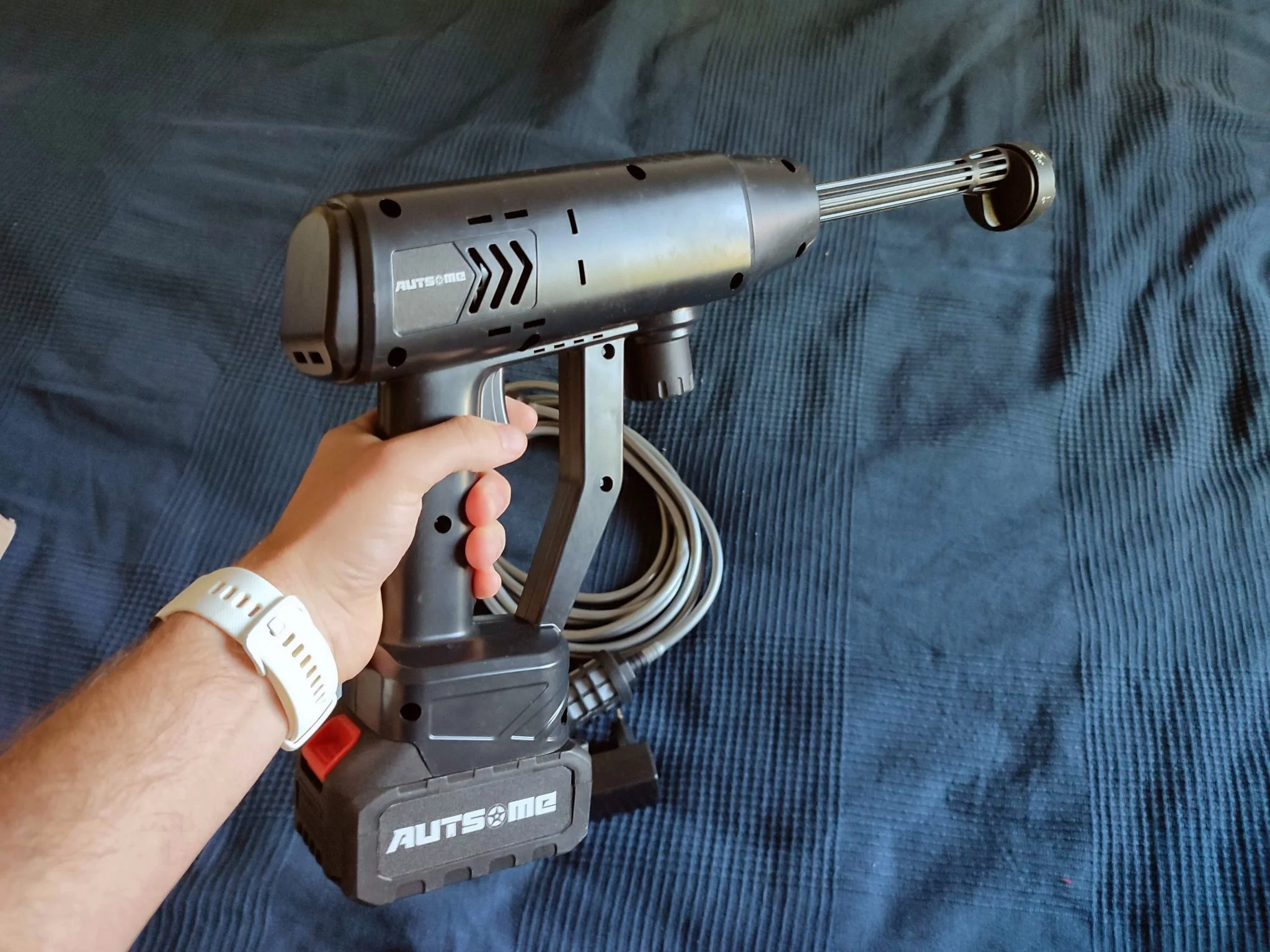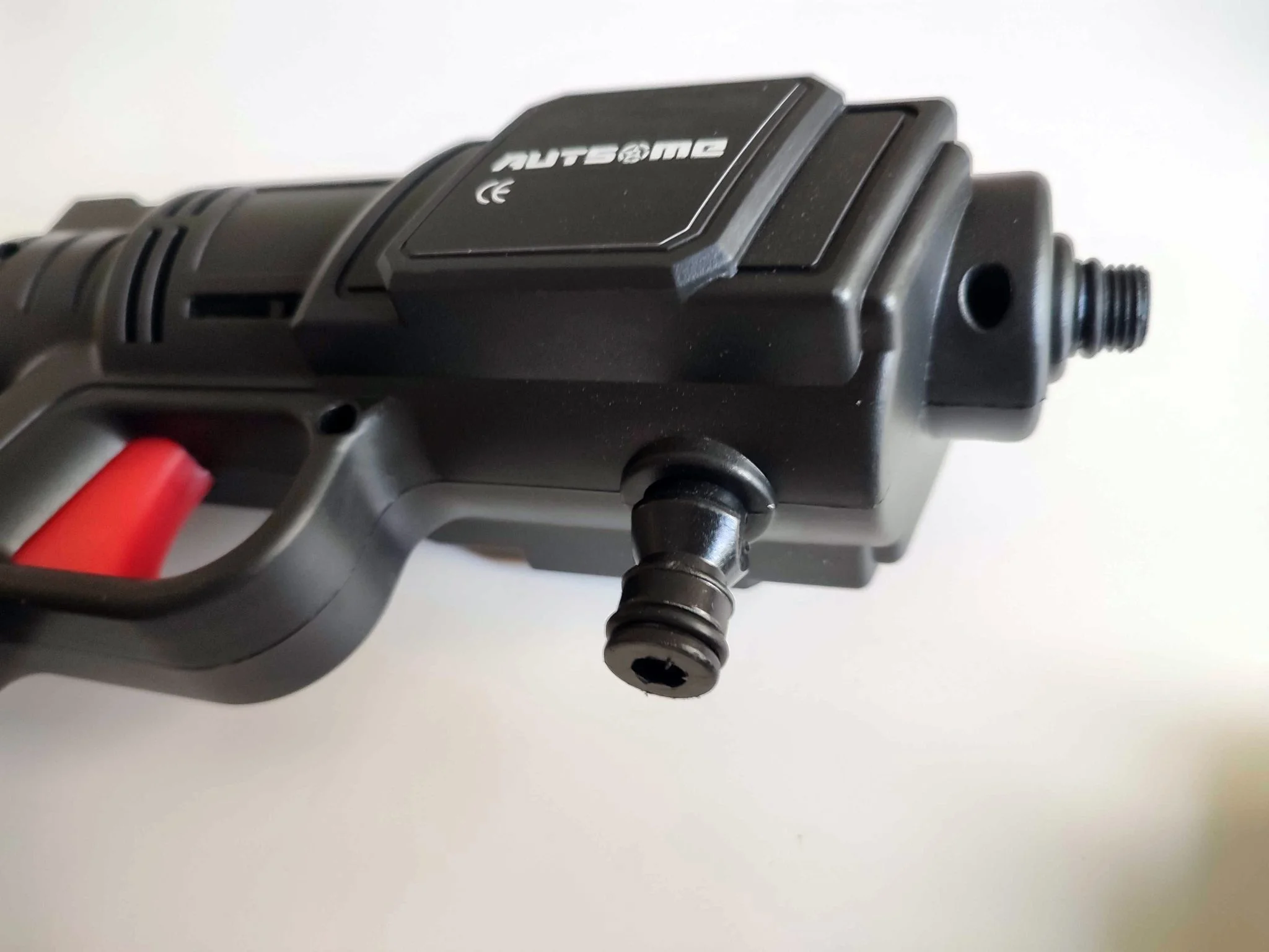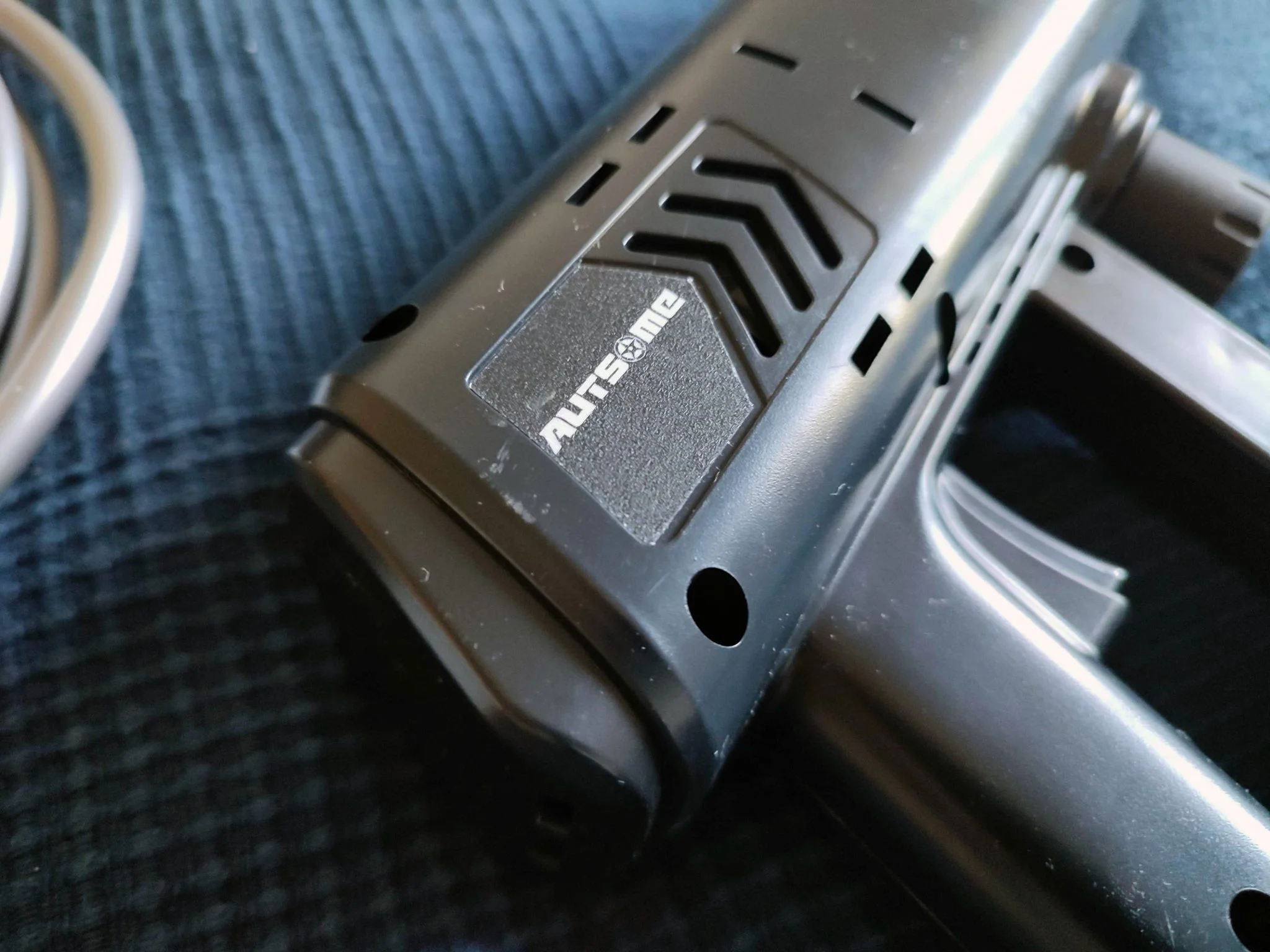 A méretre kisebb AUTSOME pisztoly kicsit komolytalanabbnak tűnik, mint a nagyobb. A csöve sokkal puritánabb, nem lehet tekeréssel változtatni a vízsugarat és van rajta egy gumi elem, ami olyan, mintha rá kéne húzni a gépre, de nem lehet, ezért csak lóg bánatosan. Viszont két aksit is adnak hozzá, de ezek is kisebbek, így ezekkel igazából nem biztos, hogy jobban járunk.