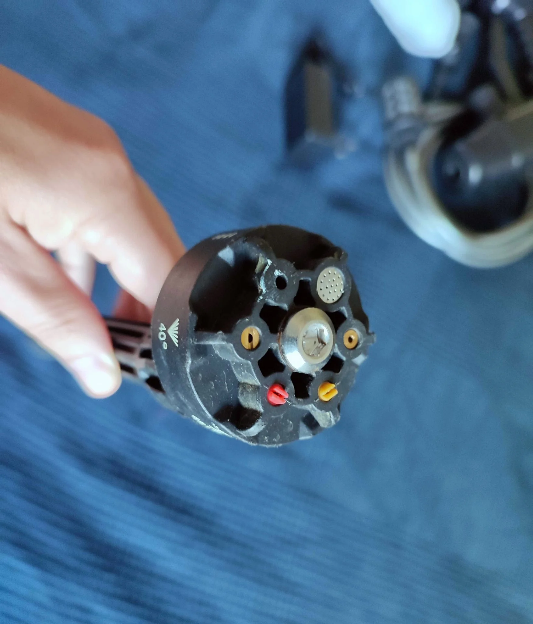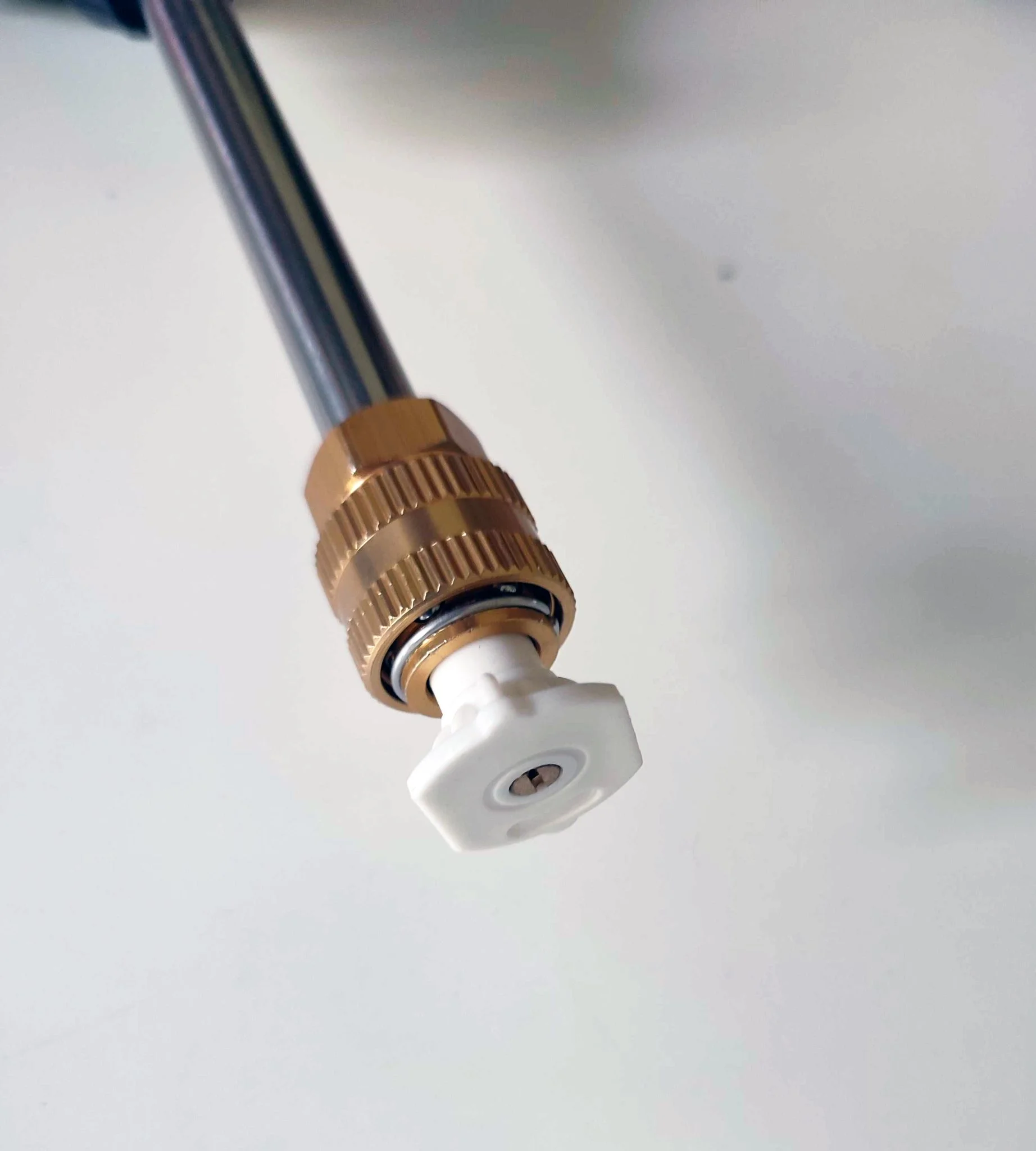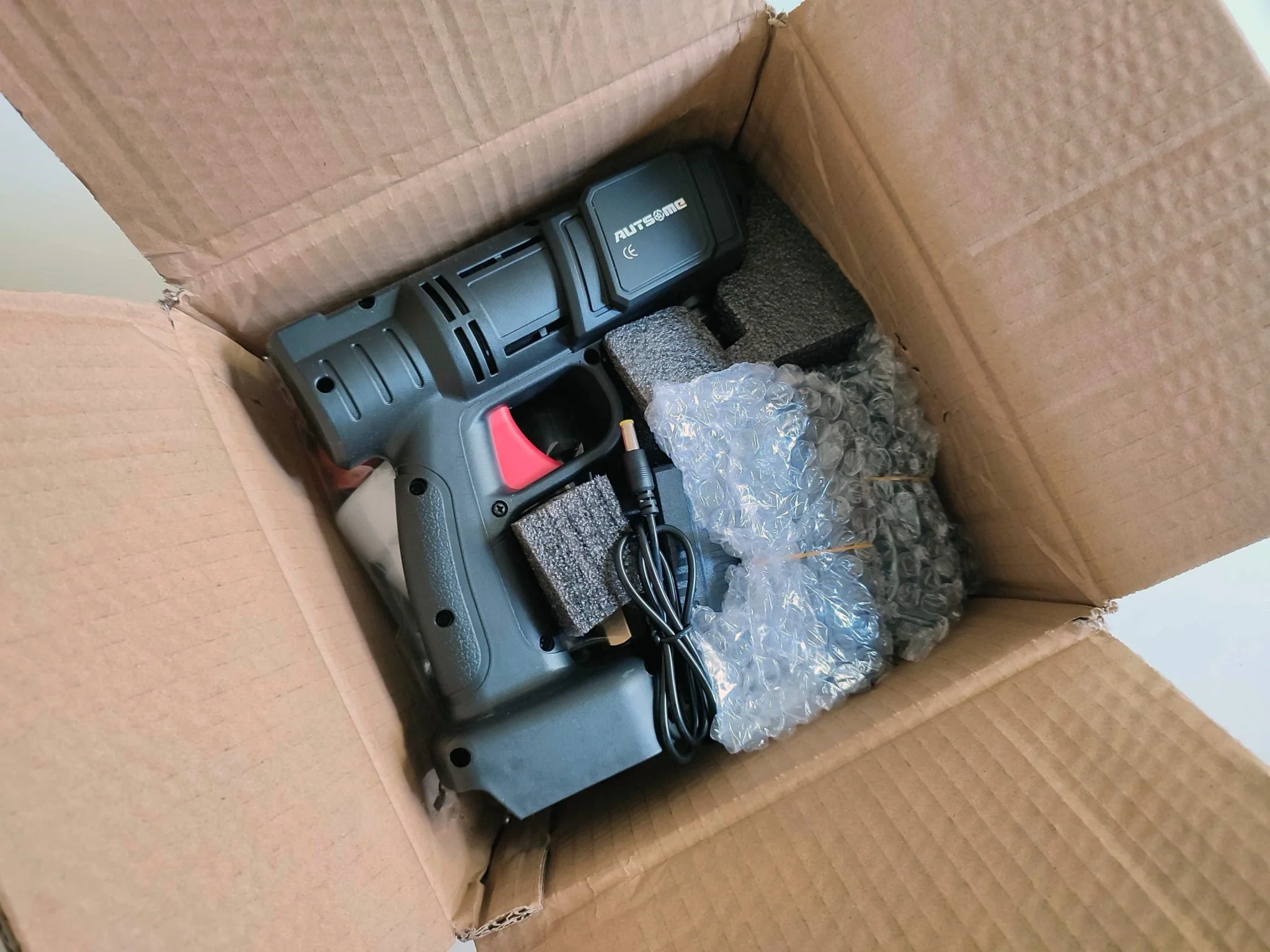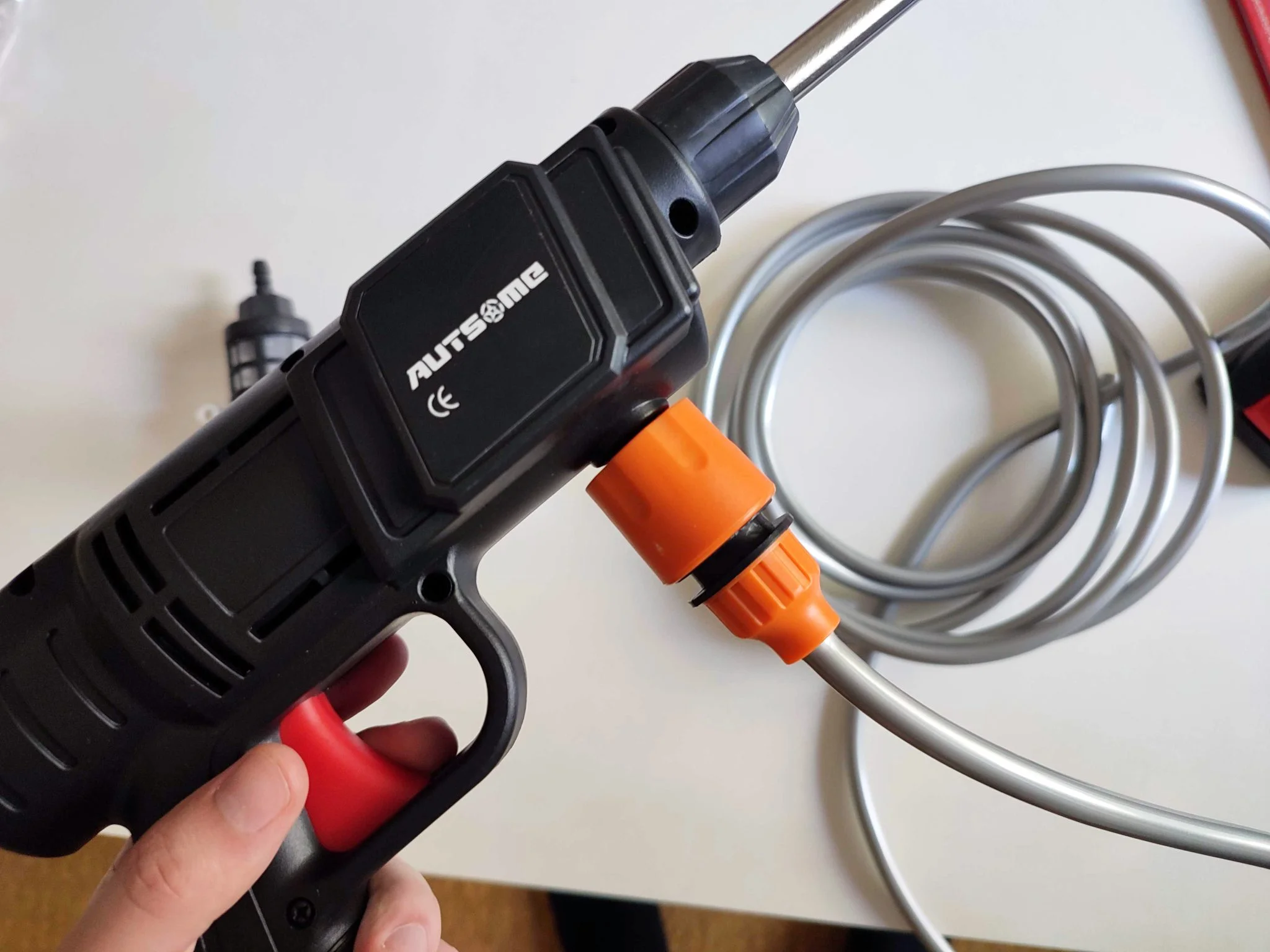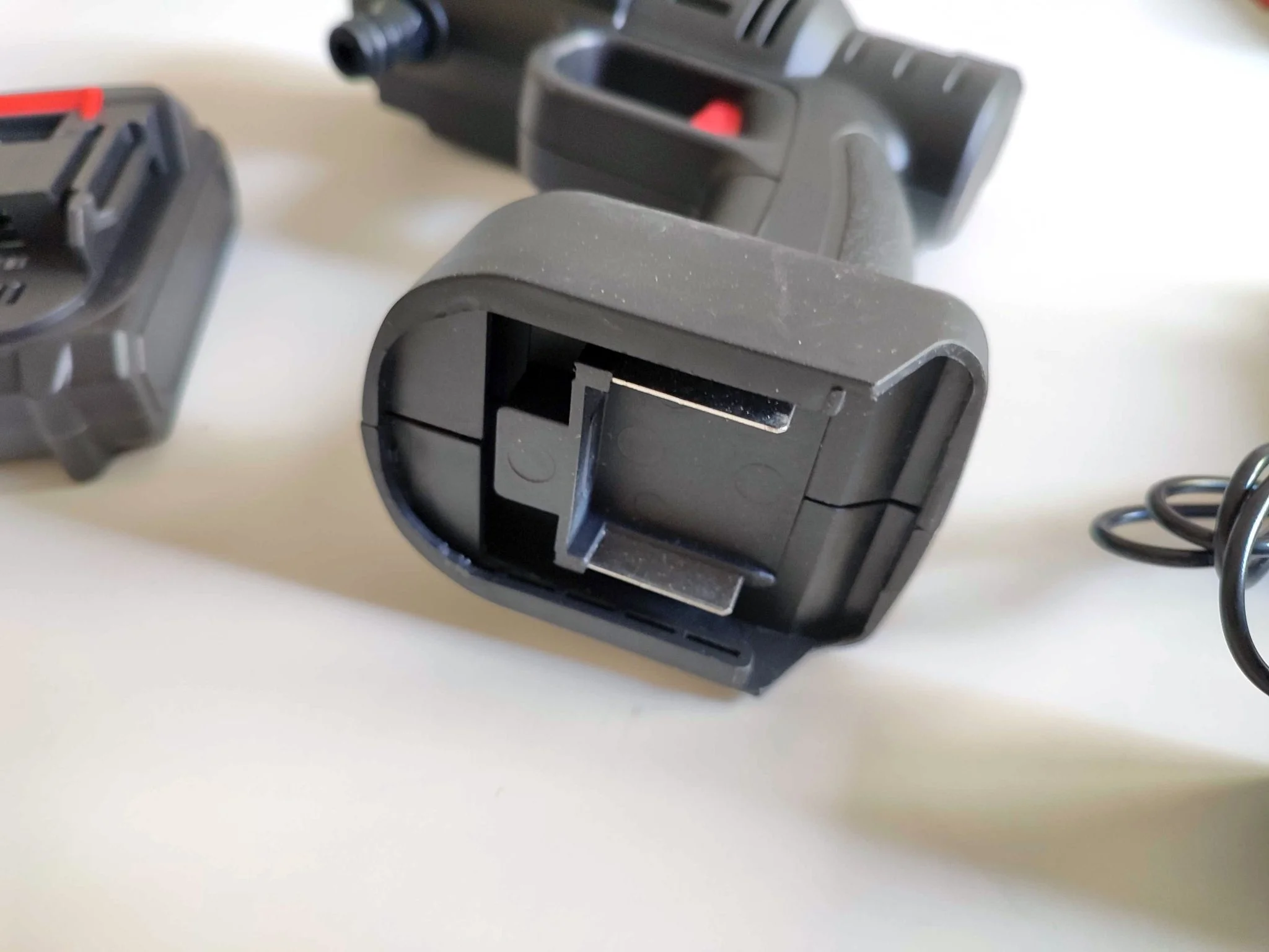 A méretre kisebb AUTSOME pisztoly kicsit komolytalanabbnak tűnik, mint a nagyobb. A csöve sokkal puritánabb, nem lehet tekeréssel változtatni a vízsugarat és van rajta egy gumi elem, ami olyan, mintha rá kéne húzni a gépre, de nem lehet, ezért csak lóg bánatosan. Viszont két aksit is adnak hozzá, de ezek is kisebbek, így ezekkel igazából nem biztos, hogy jobban járunk.