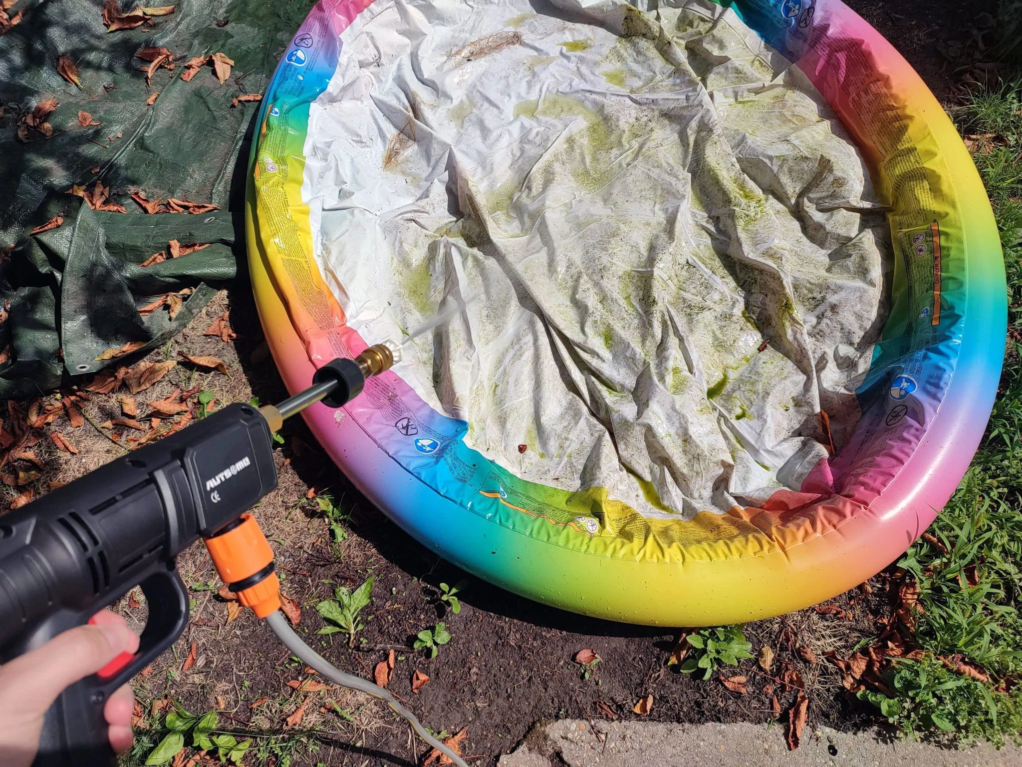 Beindítva nem éreztem, hogy erősebb lenne, mint a másik, sőt, kifejezetten sokat vártam, mire megérkezett a csőbe a víz. Meg sem próbáltam vele az autót lecsapatni, mert éreztem, hogy erőtlenebb, mint az előző. Viszont azt gondoltam, hogy az egy hónapja kint felejtett, bealgásodott gyerekmedencét fogom vele kitisztítani. Elnyomtam rá egy nagy vödörnyi vizet, de az eredmény nem volt nagy „wasistdas”.