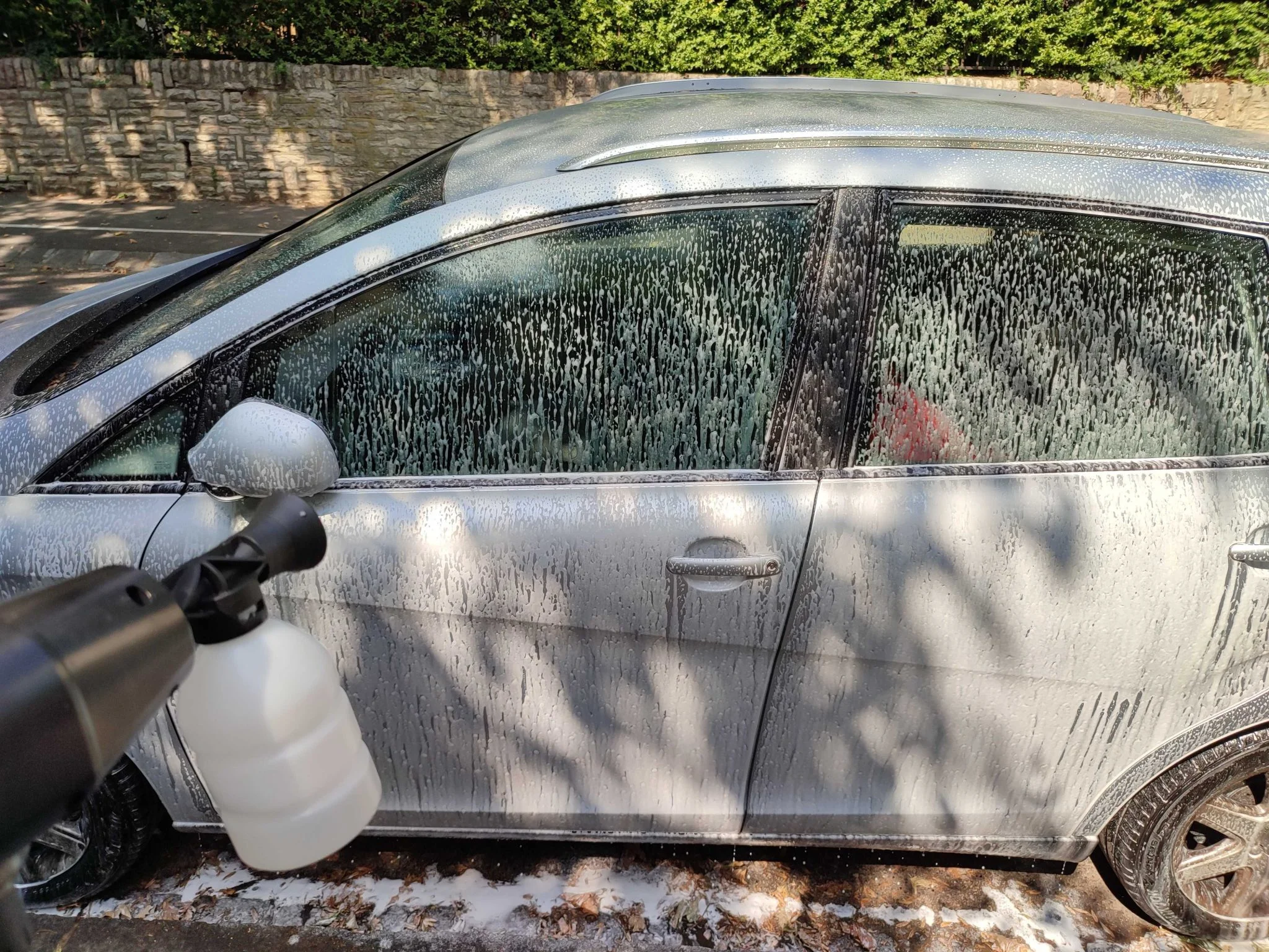 Elsőnek a nagyobbik variáns került alaposabb teszt alá. Rögtön a nagy falattal kezdtem, megtöltöttem egy nagy Vileda felmosó vödröt tiszta vízzel és kimentem kocsit mosni. Némi szappanos vizet is töltöttem a habosítóba, hogy majd profi módon csináljam a műveletet. Szerencsére a családi csapatszállító jármű kellőképpen homokos, saras volt, az elején pedig egy komplett szúnyog és muslica világháború áldozatainak a nagy része megtalálható volt az autópályázásoknak köszönhetően. Így tehát a feladat adott, minden mást az AUTSOME pisztolyra hagytam.