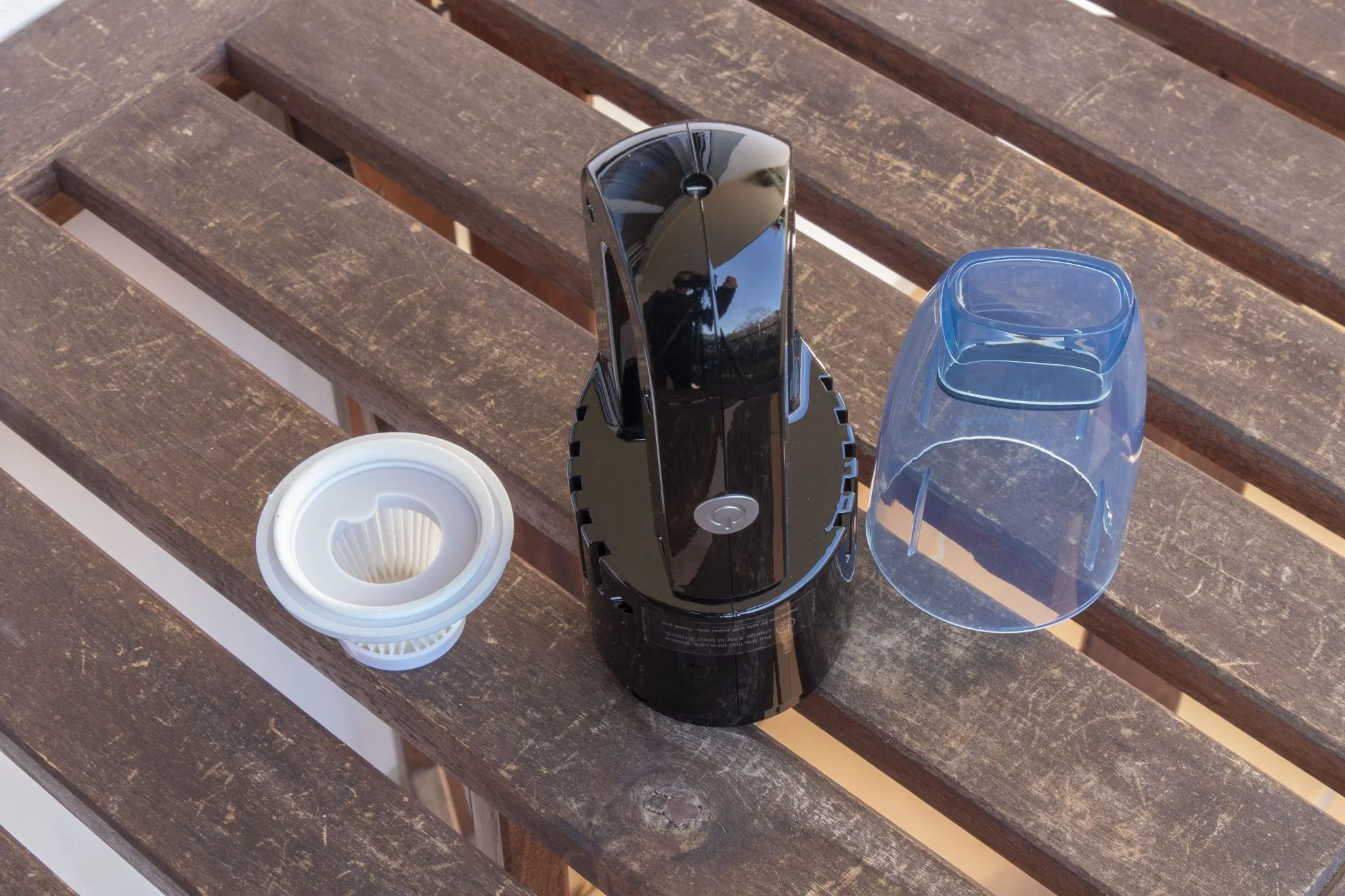 Az eszköz elején helyezkedik el a portartály, ami lecsavarható, itt találjátok a HEPA filtert,