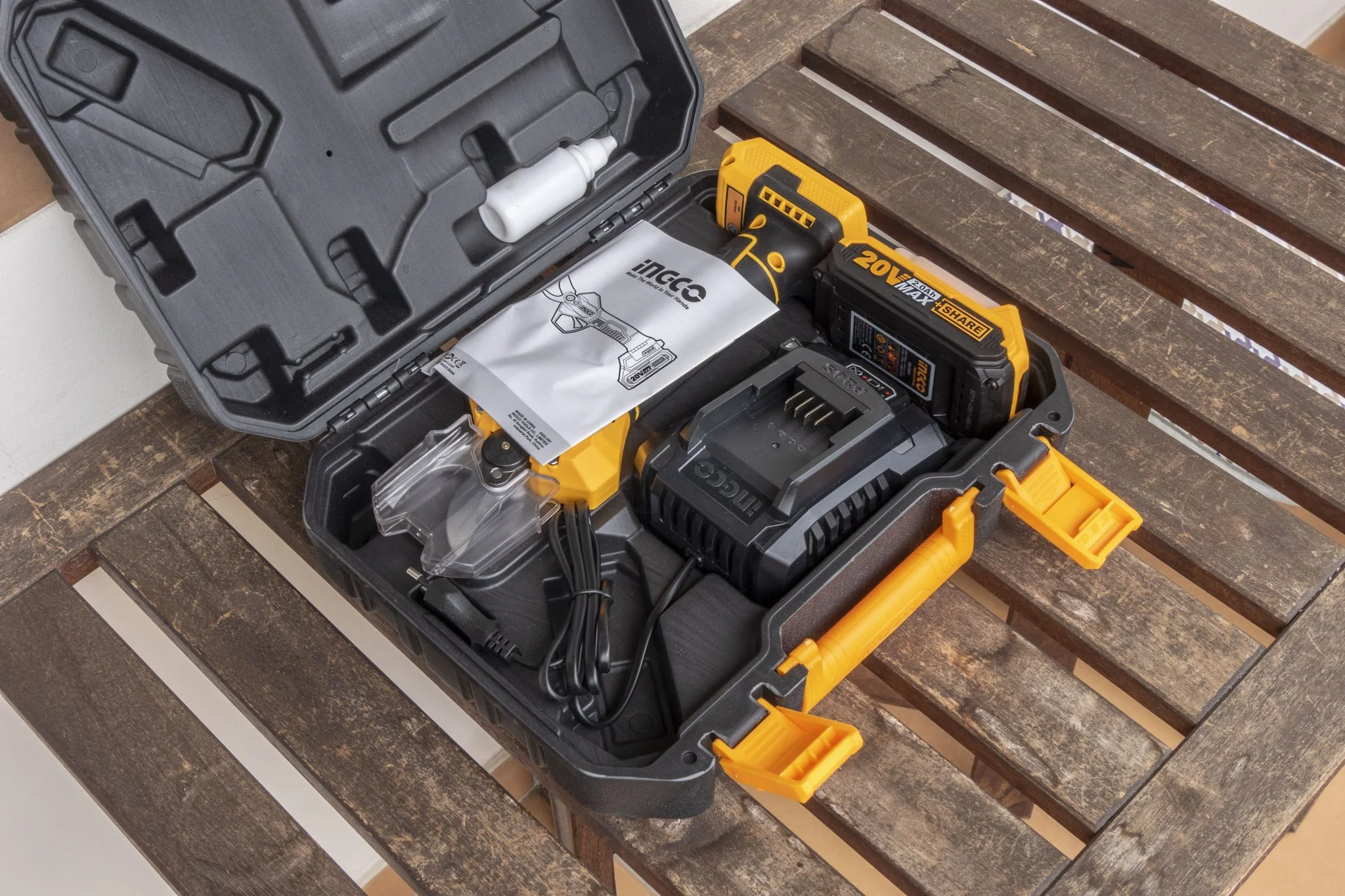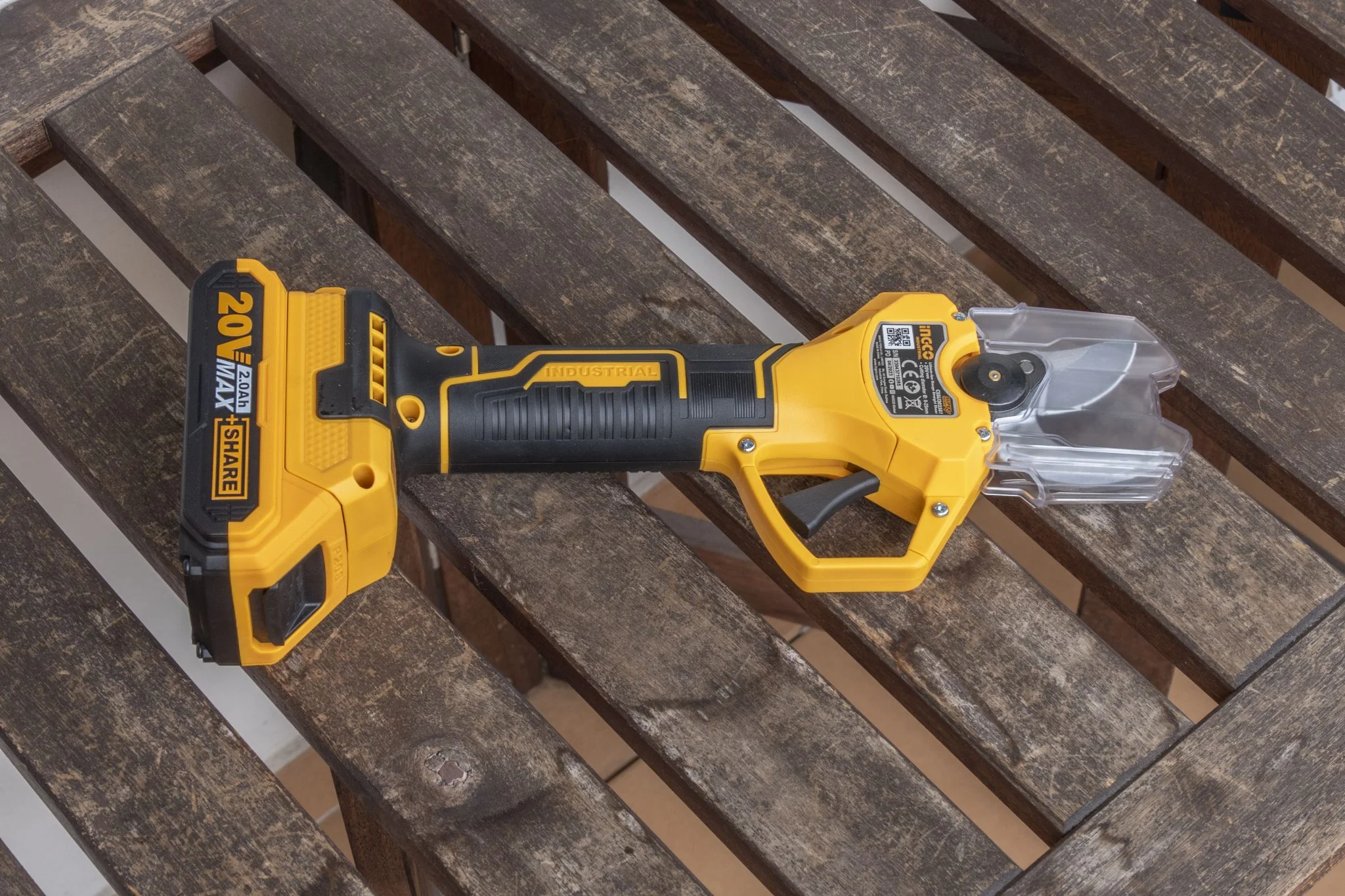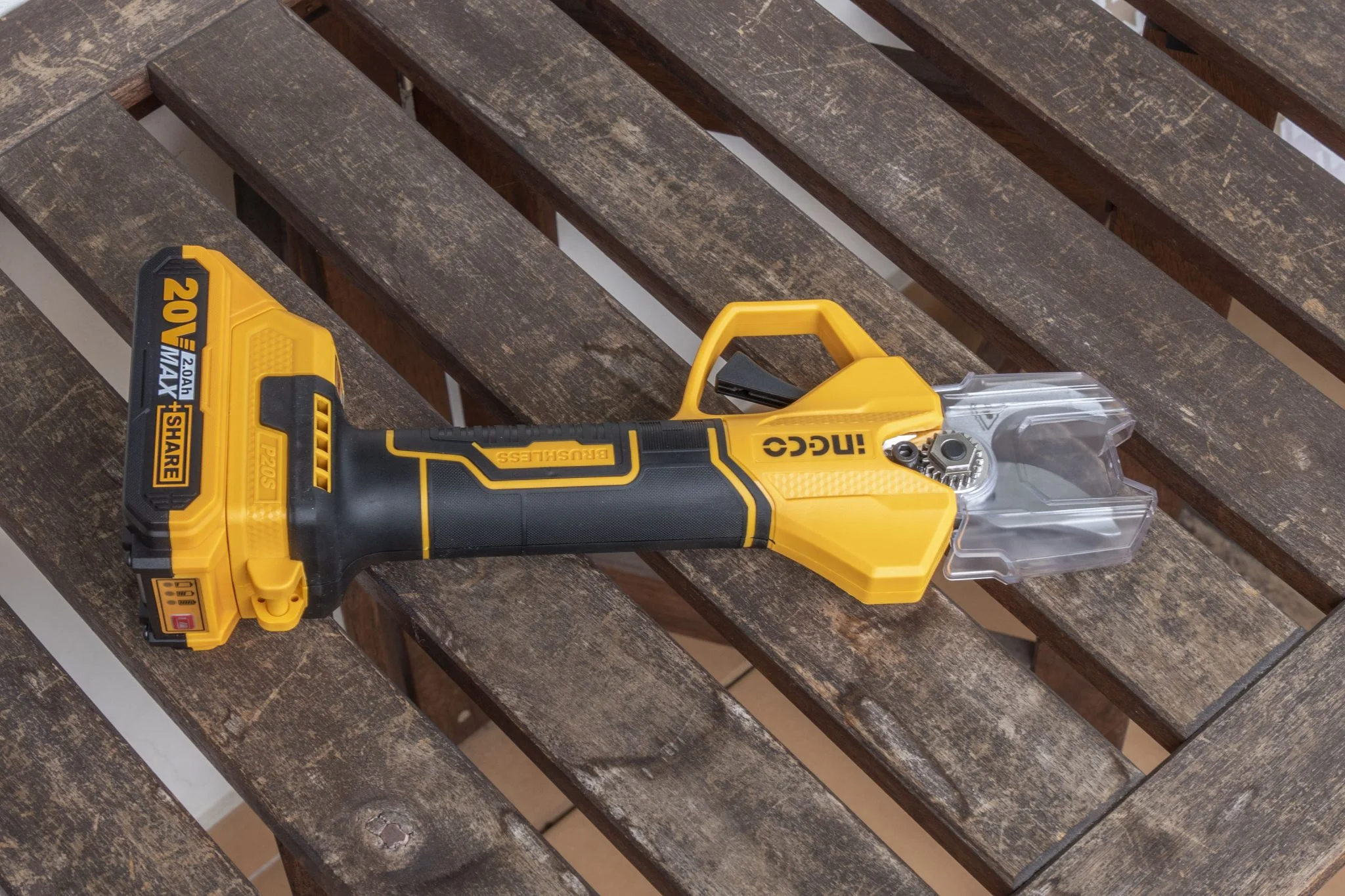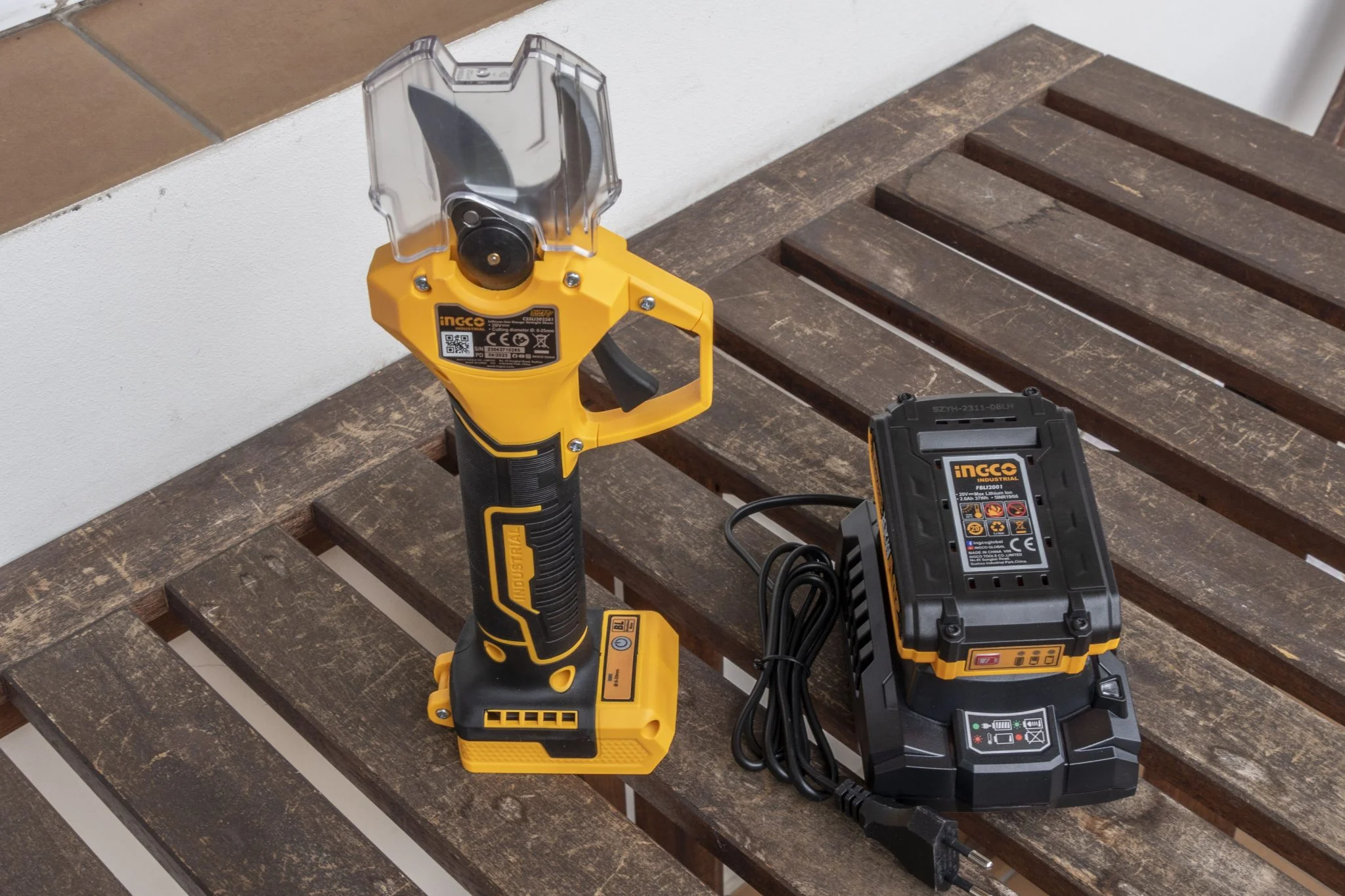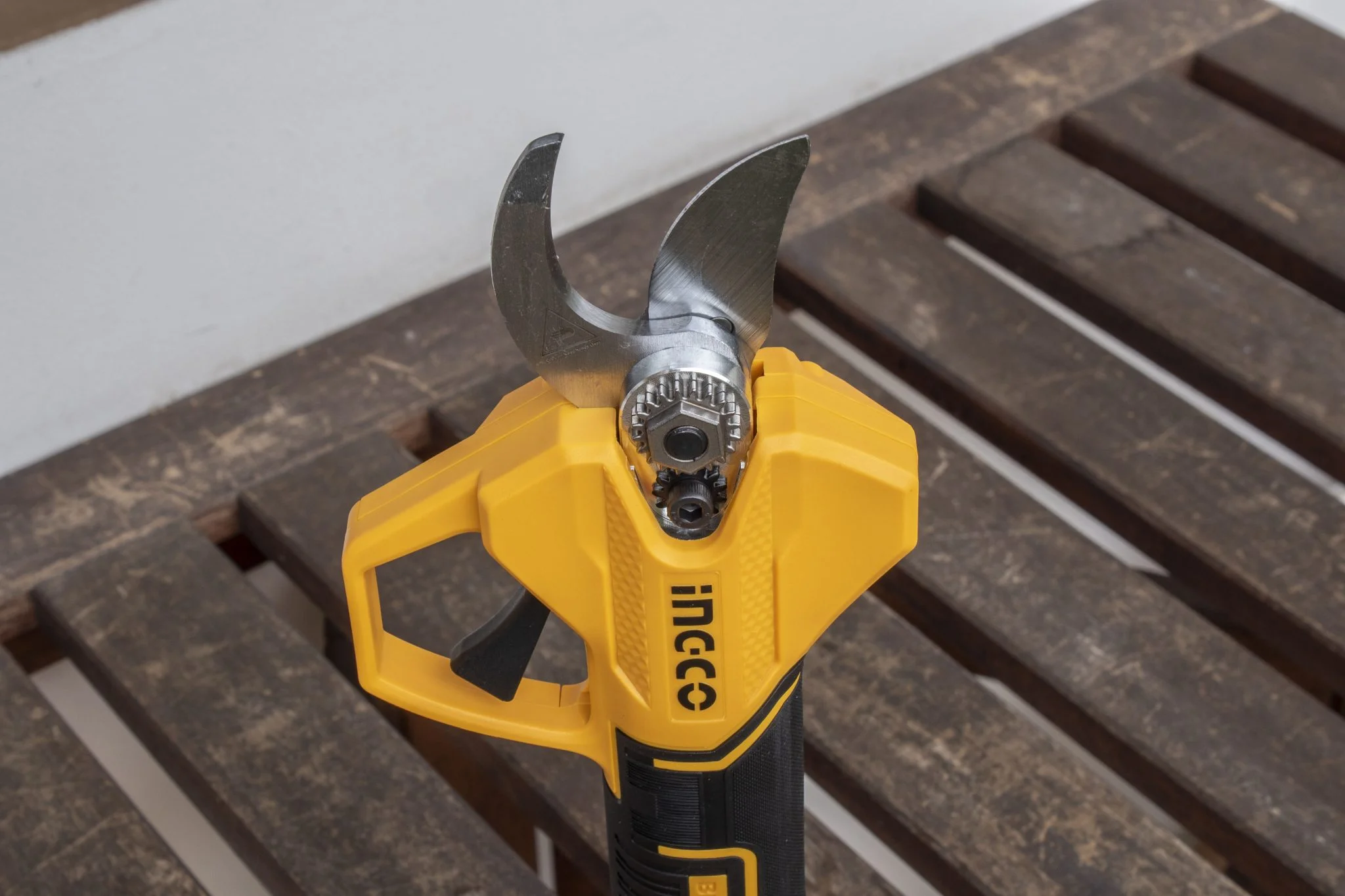 De ne ragadjunk le a metallurgiai szakkifejezéseknél, hiszen az eszközt gyerekjáték használni. Mivel a brushless motoros metszőolló egy elég veszélyes szerszám, hiszen akár 25 mm-es faágakat – legalábbis puha fából – is át tud vágni, ezért az ujjatokat is simán lenyisszantja, ha felelőtlenül forgatjátok. Éppen ezért van hozzá egy műanyag élvédő elem, ami blokkolja a mechanika működését, illetve a bekapcsolást külön gombbal kell megtenni, aminek megtörténtére külön hangjelzéssel is figyelmeztet az Ingco. A fogása kifejezetten jó, a nyele gumírozott, eléggé indusztriális, de jó minőséget sugall az összhatás. Ez a narancs-fekete kombó pedig jól jön a jellemzően zöld színekkel telített szőlődombon, mert ha lerakjátok valahova, akkor utána könnyű megtalálni.