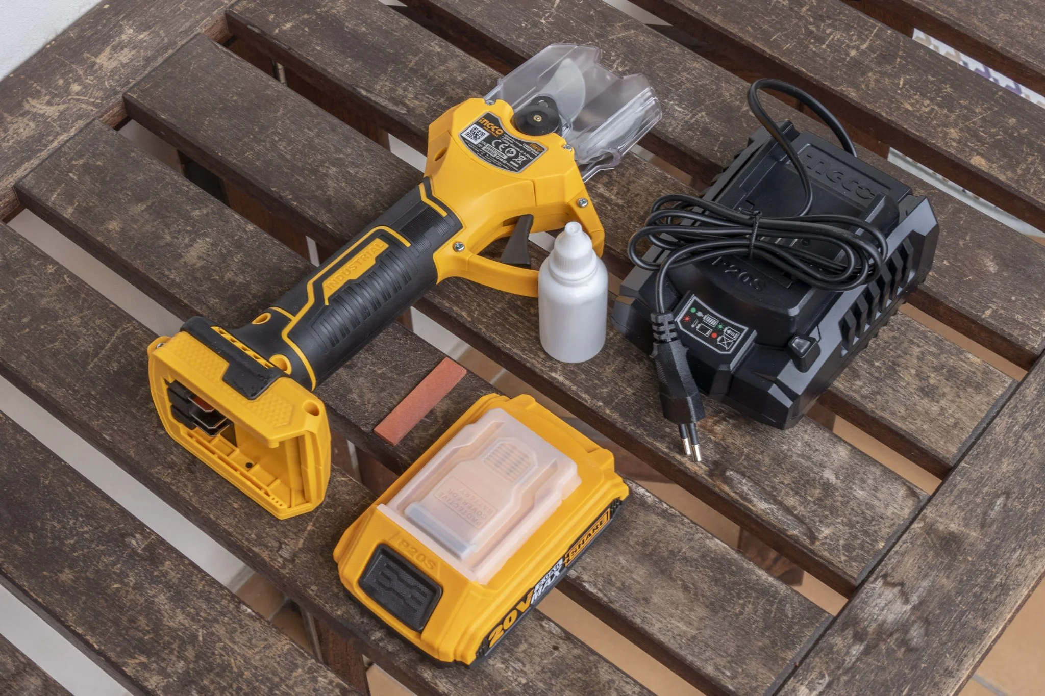 a műanyag táska is nagyon „ütvefúrós”, szóval egy igazi jóféle szerszámtáskát kaptok. Kár, hogy műanyag csatos, jobb lenne egy fém, de a plasztik fajtából legalább a masszívat kapjátok. A beltartalomban semmi meghökkentő nincsen, az elektromos metszőollón kívül van egy 2 Ah-s, 20 V-os akku és egy töltőállomás a dobozban, némi műszerészolaj egy pici tartóban, illetve egy fenőkő és egy leírás, ami a használatot taglalja.