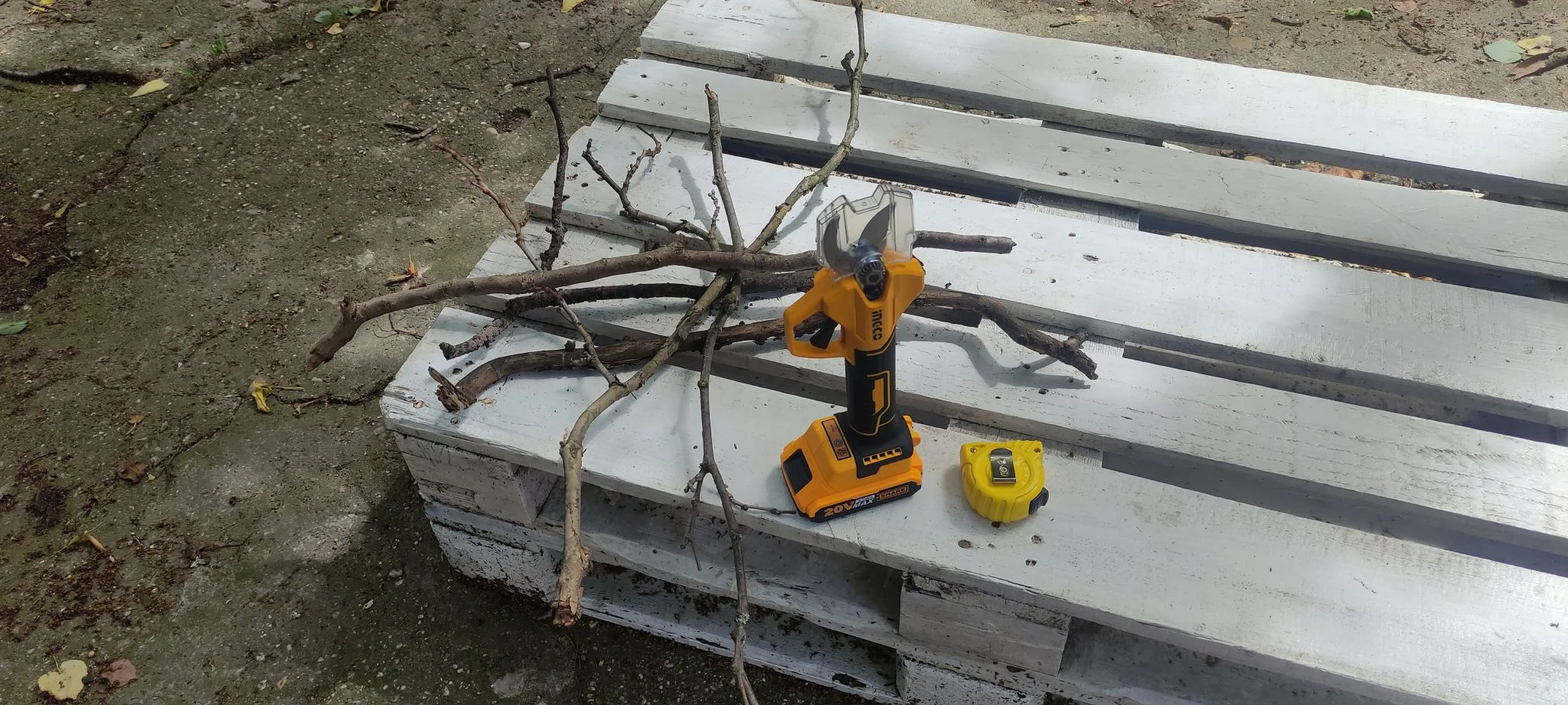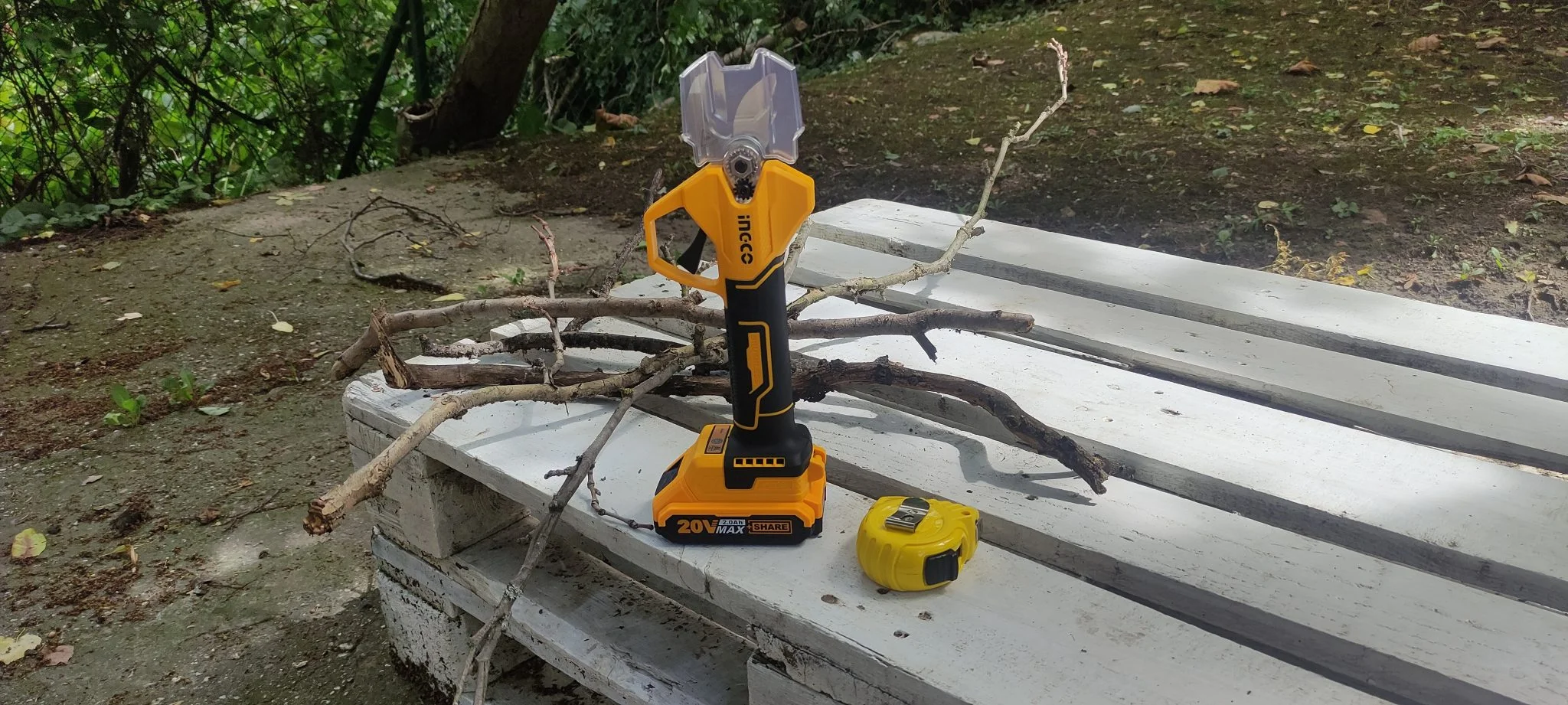 illetve, hogy az Ingco harcra kész. Egyetlen kallantyú van rajta, ennek meghúzása zárja a pengéket, vagyis ekkor vág a szerkezet. Van továbbá egy fül a nyelén, ahová be lehet fűzni csuklópántot, de ilyet nem adnak hozzá, így ezt kicsit értelmetlennek éreztem. Mivel ez a szerkezet nem egy ördöglakat, jöhetett a teszt, de mivel messze van még a szüret, a metszési időszak meg már elmúlt, a kertben összeszedett ágak felaprításával teszteltem, igazat mondott-e a gyártó a keresztmetszet-átvágó képesség kapcsán.