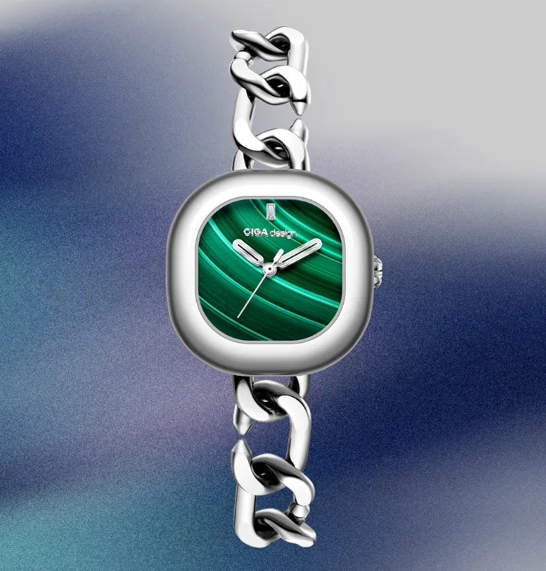 A CIGA Design Aglaia kollekciójának legkülönlegesebb vonása, hogy a számlap valódi, természetes féldrágakő. Ez önmagában is ritkaság a női karórák világában, különösen ebben az árkategóriában, de az igazi varázslat ott kezdődik, amikor kézbe veszed az órát, és látod, hogy nincs két teljesen egyforma darab. Minden egyes számlap megismételhetetlen, mert a természet rajzolta meg.