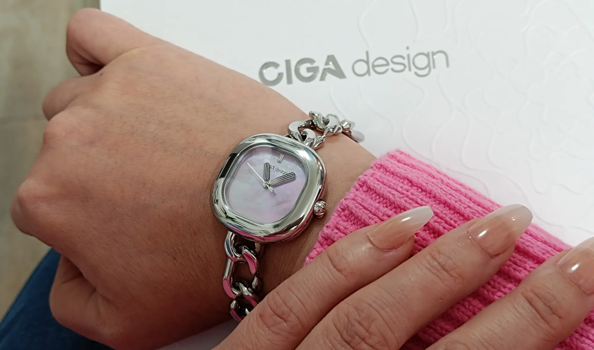 Egy mechanikus vagy automata, teljesen acélszíjas óra simán lehet 120-180 gramm, sőt a nagyobb, búvár jellegű modellek akár 200 gramm fölé is mehetnek. Egy átlagos karóra tömege jellemzően 40-50 gramm körüli, de a könnyű, vékony kvarcmodellek még ennél is légiesebb érzetet adnak a csuklón. Ehhez képest a CIGA Design Aglaia jóval határozottabb jelenléttel bír: 62 grammot nyom, ami az első pillanattól azt az érzetet kelti, hogy itt valódi anyag és minőség van. Törékeny alkatok esetében viszont már nem biztos, hogy egy egész napos viselés során ez nem lesz kényelmetlen.