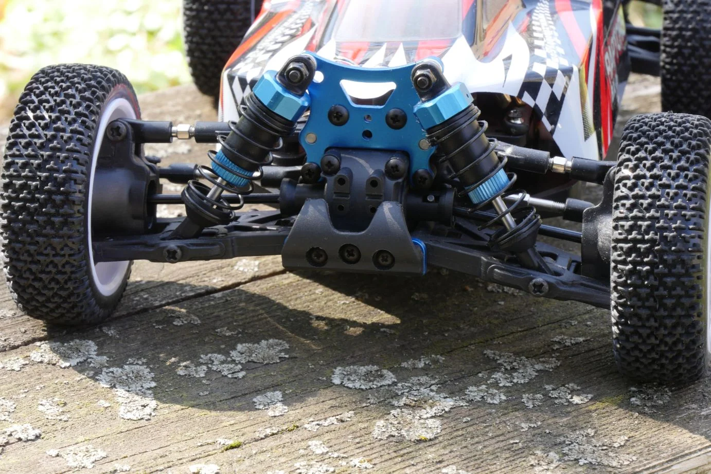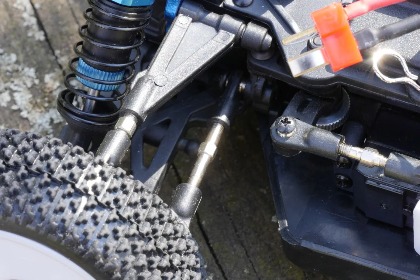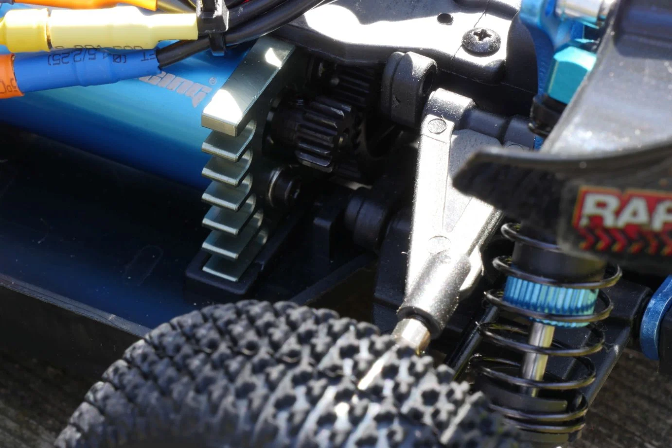 Szerintem már laikusként is viszonylag jól látható, hogy ez egy viszonylag normálisan összerakott gépezet. Érdemes a futómű elemeit szemügyre venni – a legtöbb részen alu, a bekötési pontok körül pedig fém elemeket találunk -, normális rugóstagokkal rendelkezik, kellemesen rugózik az 1/16 arányú modell. A „motorháztetőt” felpattintva két dolgot érdemes szemügyre venni: a motort, ami brushless, illetve az 1.500 mAh kapacitású akkumulátort, ami Lipo, ezek tipikusan a „jó jel” kategóriába tartozó dolgok.