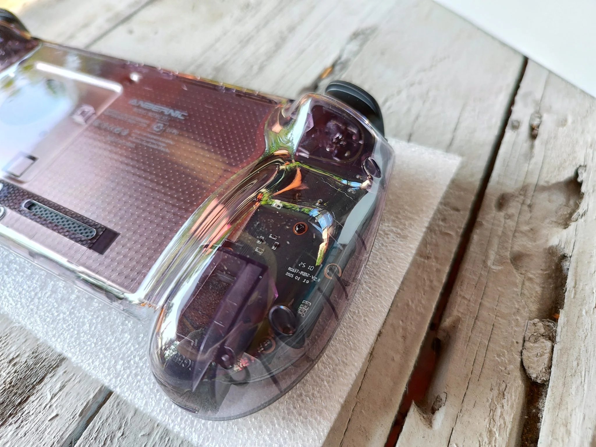 Maga a konzol első ránézésre nagyon jól néz ki – a „Transparent Purple” változat élőben talán még látványosabb, mint képeken. A burkolaton keresztül látható, belső elektronika kellemes retró hatású, miközben a forma és az elrendezés modern és ergonomikus. Az analóg karok első pillantásra meglepően aprónak tűnnek és az is feltűnik, hogy a D-pad, valamint a gombok fényes műanyagból készültek – ezekről később bővebben.