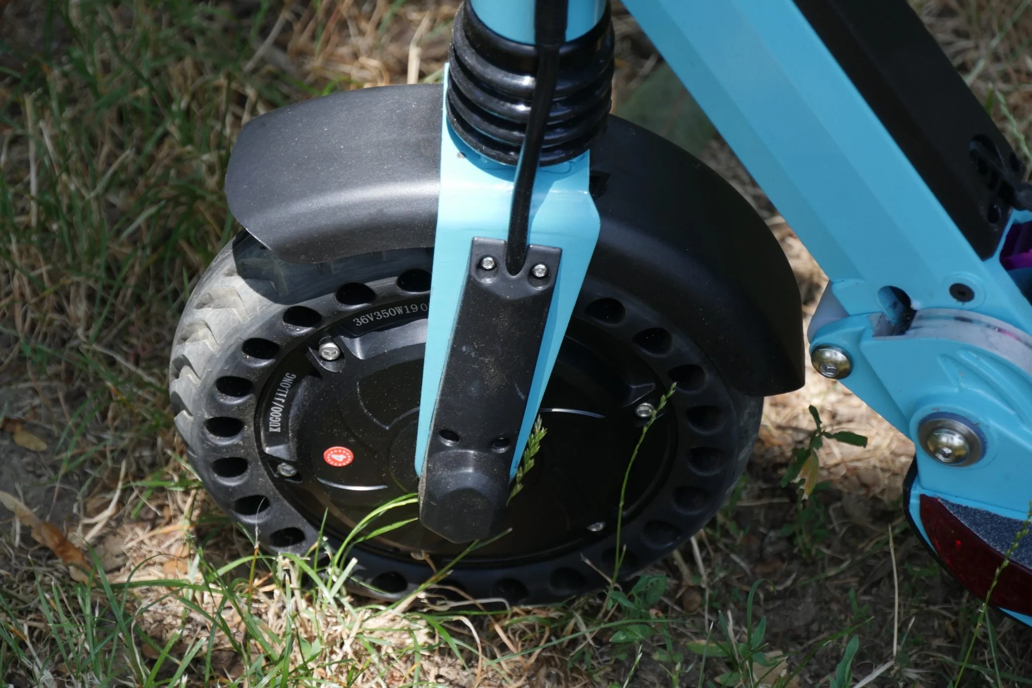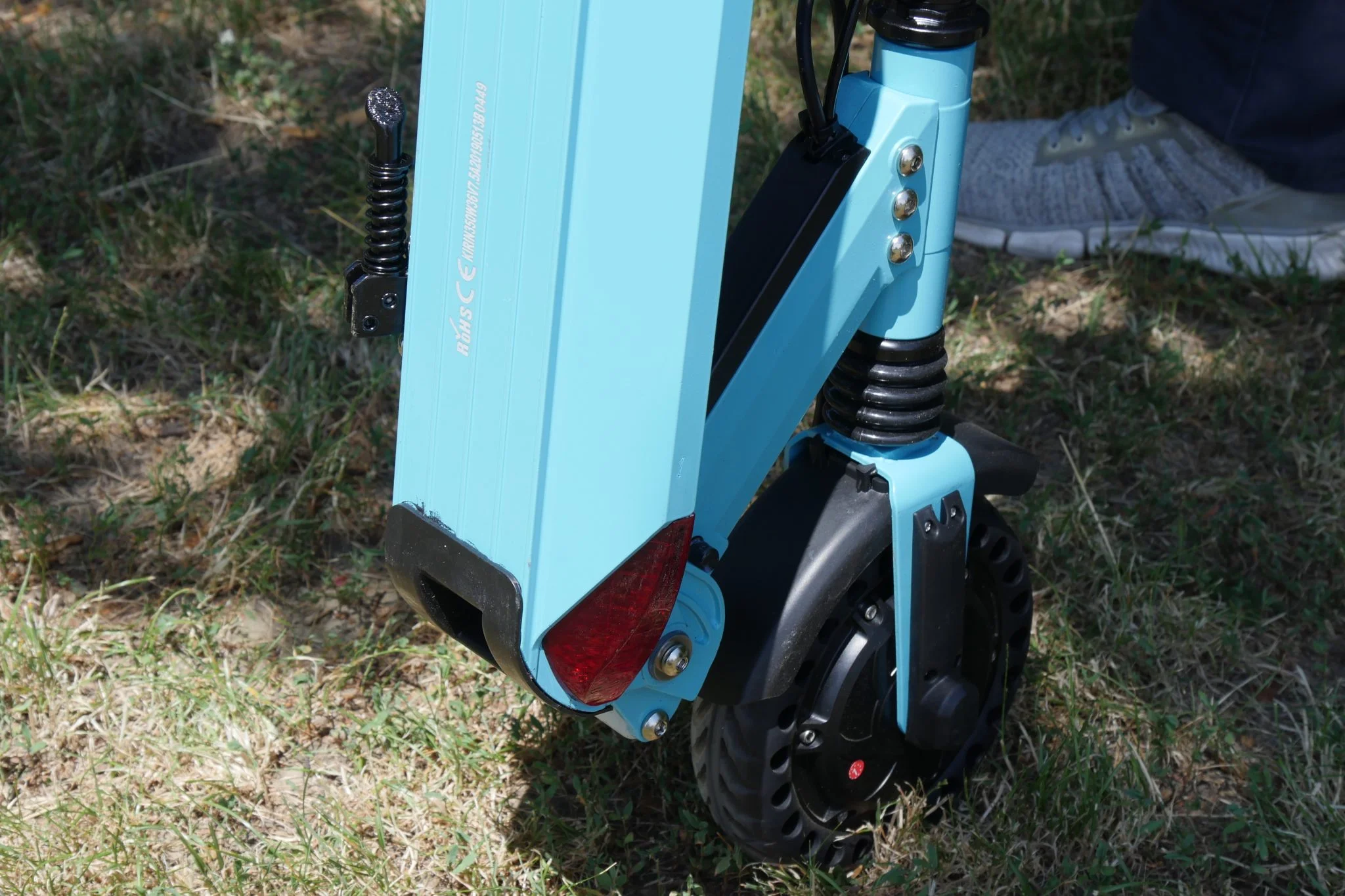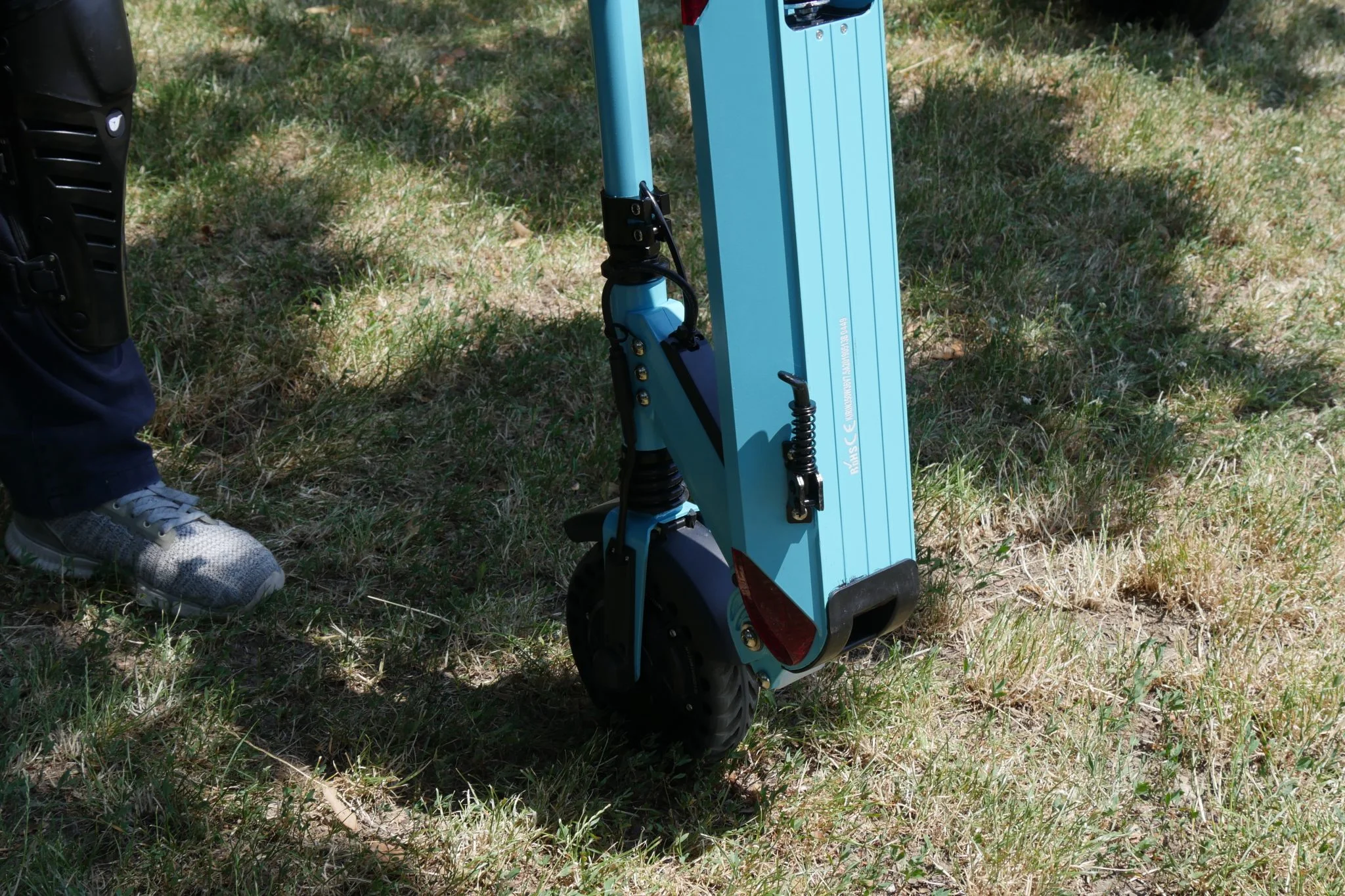 Jobb lett a fellépő, kapott egy csúszásgátló felületet, ami helyenként púpos, de az első Ninebot ES1-em is ilyen volt, ez az „occó” kategória sajnálatos sajátossága. A kerekeket tömör „méhsejt rácsos” megoldásra cserélték, ami időtállóbb, mint az előző megoldás, kilyukadni nem tud, fújni sem kell, ráadásul a hátsó gumi jóval vastagabb lett. Ennek a gyakorlati hasznát esőben fogjátok megtapasztalni, az S1 hátulja ugyanis hajlamos volt vizes felületen megindulni. A színe szerintem nagyon király, a Blöff féle babakék, amit Brad Pitt is nagyon komázott, ha van merszetek, ti is ilyenben kéritek, élőben sokkal dögösebb, mint a képeken.