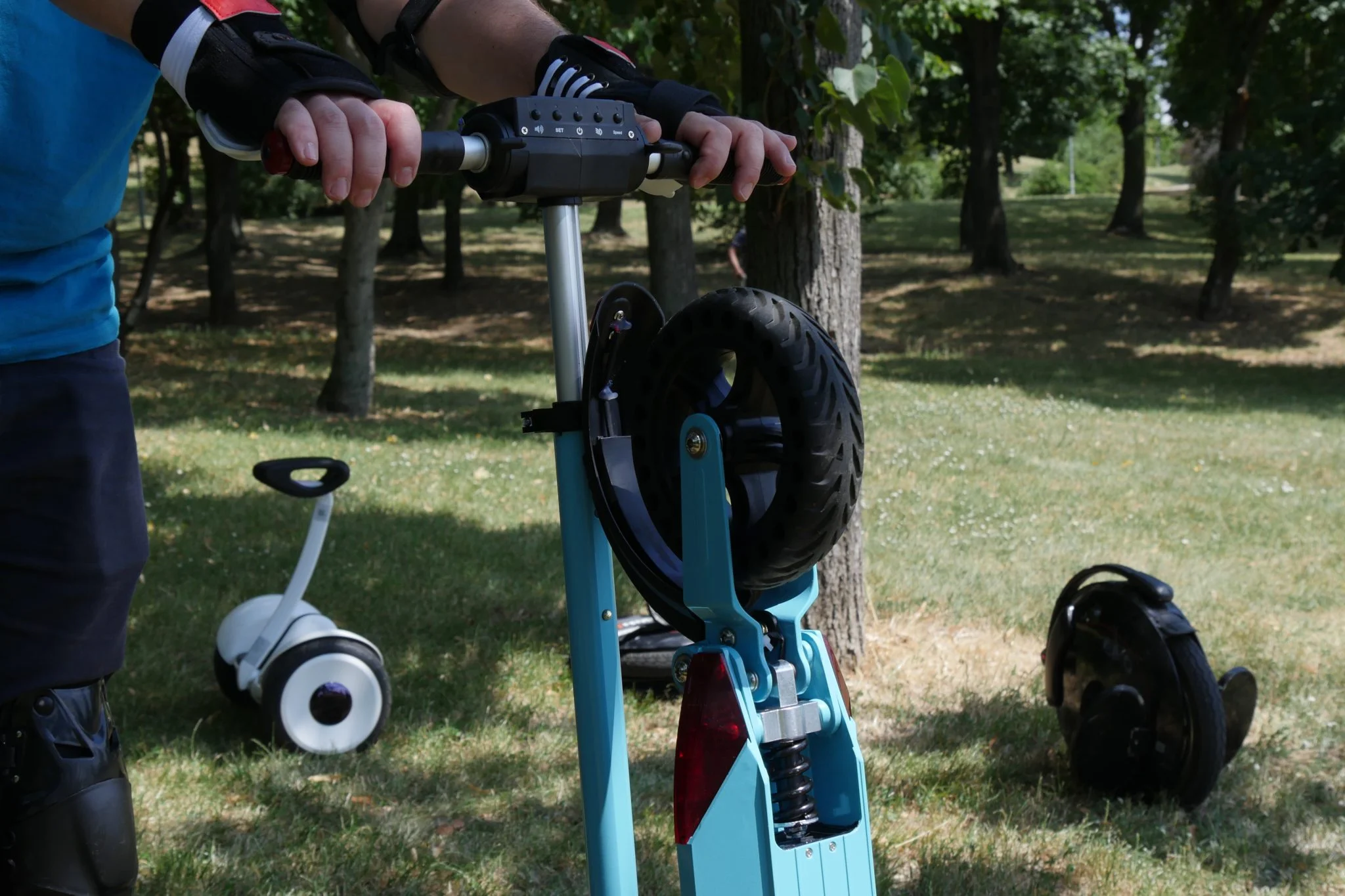 Az állítható magasságú kormány és a lecsukható markolat még mindig nagyon hordozhatóvá teszi az egyébként sem túl nehéz, durván 12 kg-os járművet. Az már nem annyira fasza, hogy csúszkál a markolat a rúdon. Kis kezűeknek ráadásul messze esik a gáz és a fékkar, szóval itt pont kapóra jön, hogy mozog a gumifelület, így a megfelelő helyre tolhatjátok.