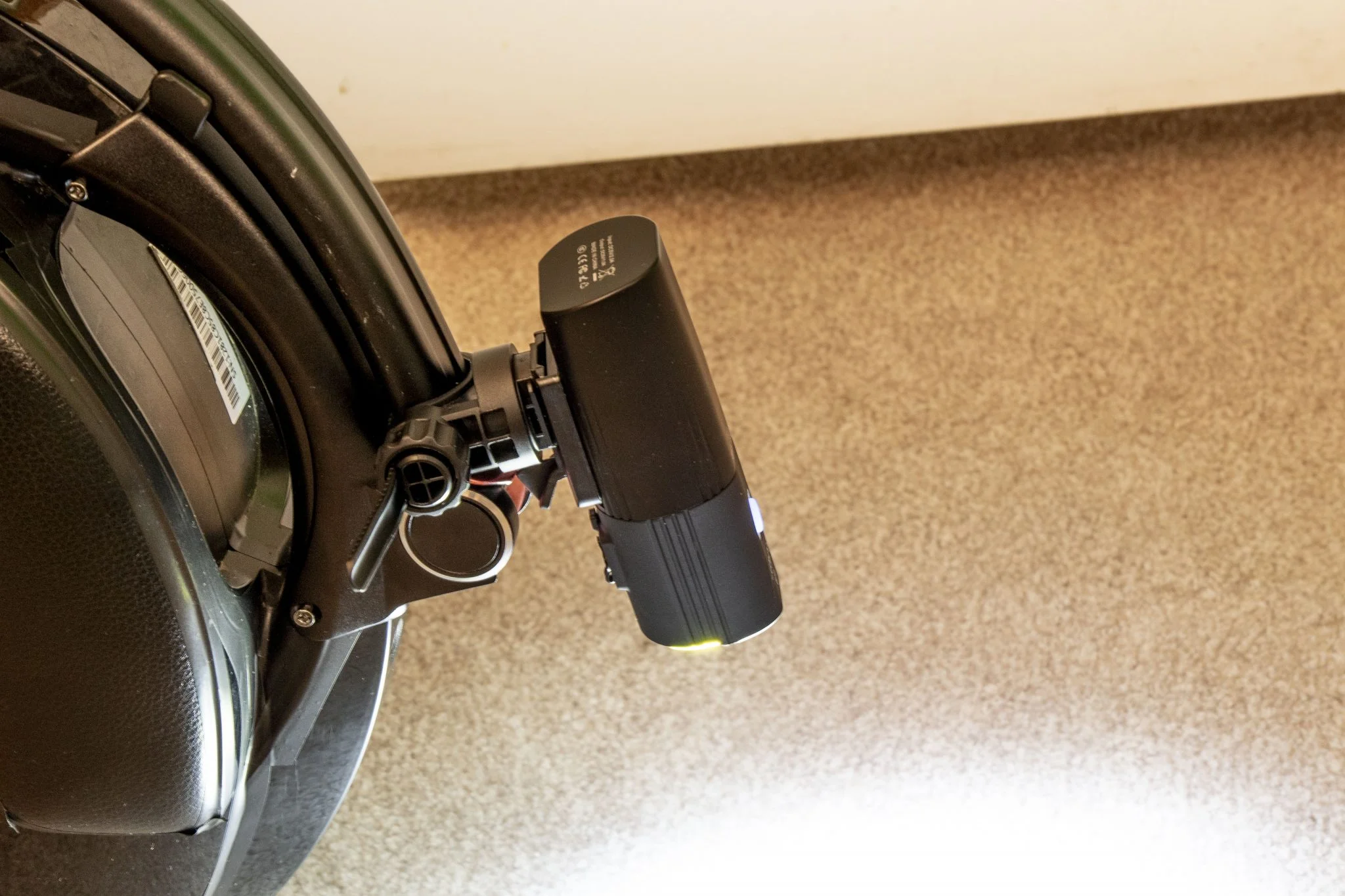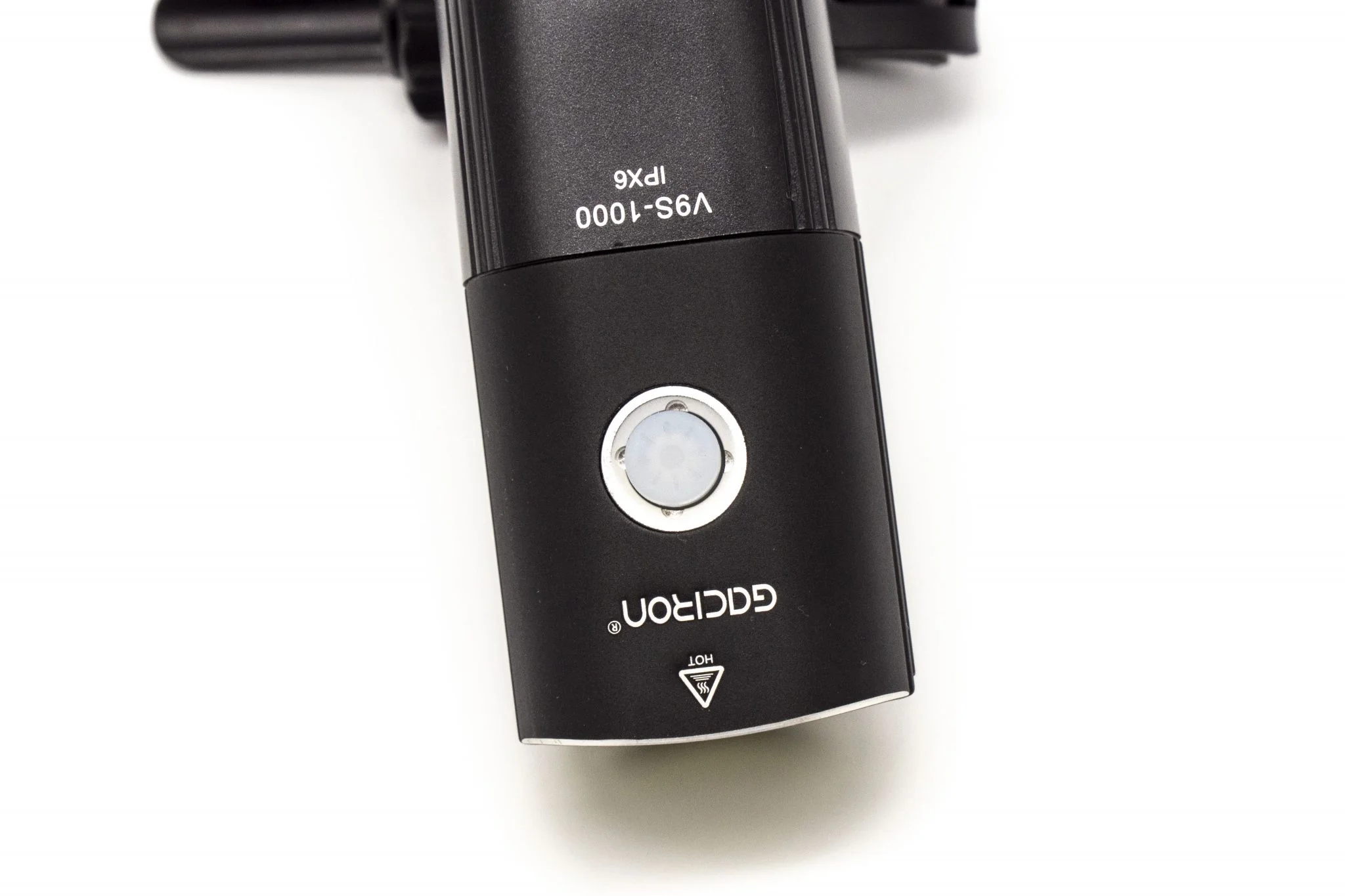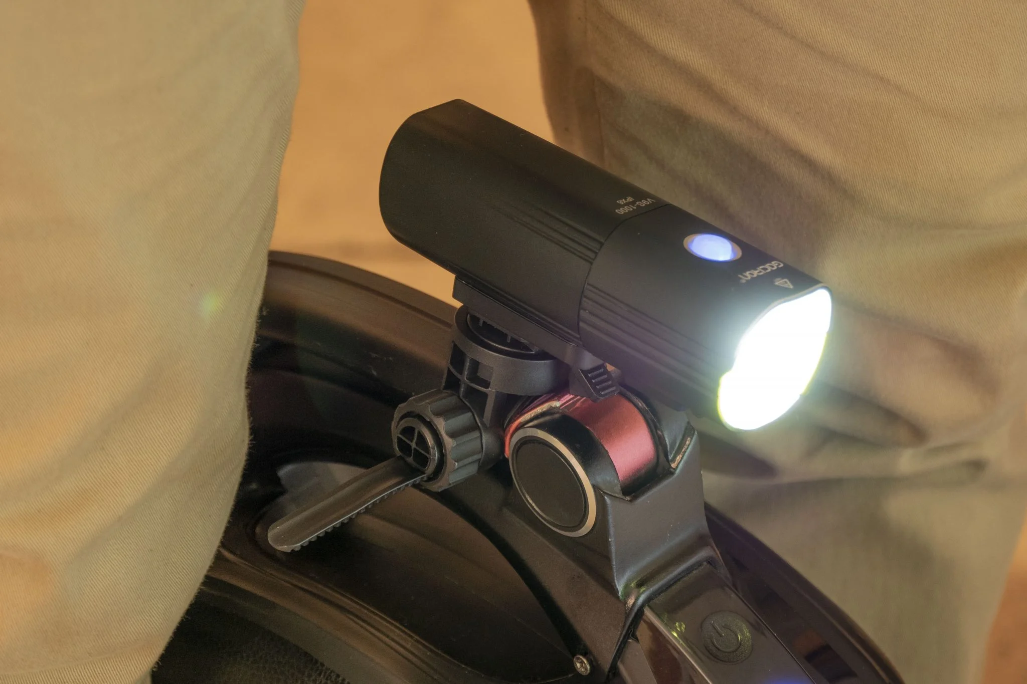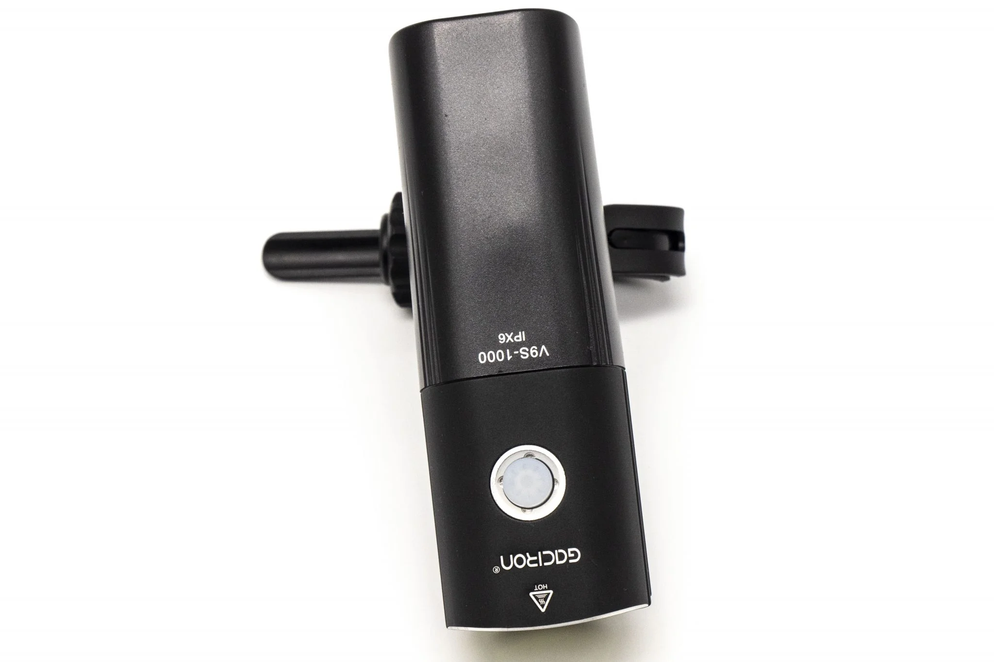 Itt található a felfogató sín is, és természetesen a doboz egy meghúzható műanyag bilincset is rejt, amivel a bringakormányra – vagy éppen uniciklire vagy rollerre, ahogy mi csináltuk – lehet felfogatni. Ezt is körbelengi a jó minőség, szerintem a fogakból álló rögzítőmechanika sem leverődni, sem elszakadni nem fog. Középen forgatható talp található, amivel finomhangolhatjátok a fénysugár irányát. Szerencsére az alapcsomag része a Gaciron V9S-1000-hez tartozó kormánypánt, amiről külön is vezérelhető az eszköz, így menet közben nem kell a lámpát babrálni, elég az USB-vel beköthető gombot nyomogatni.