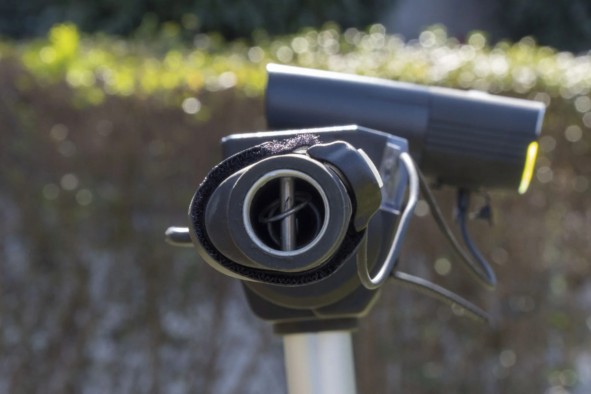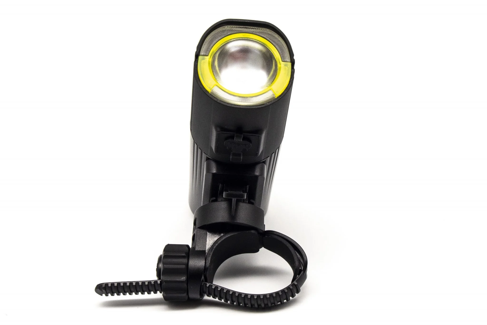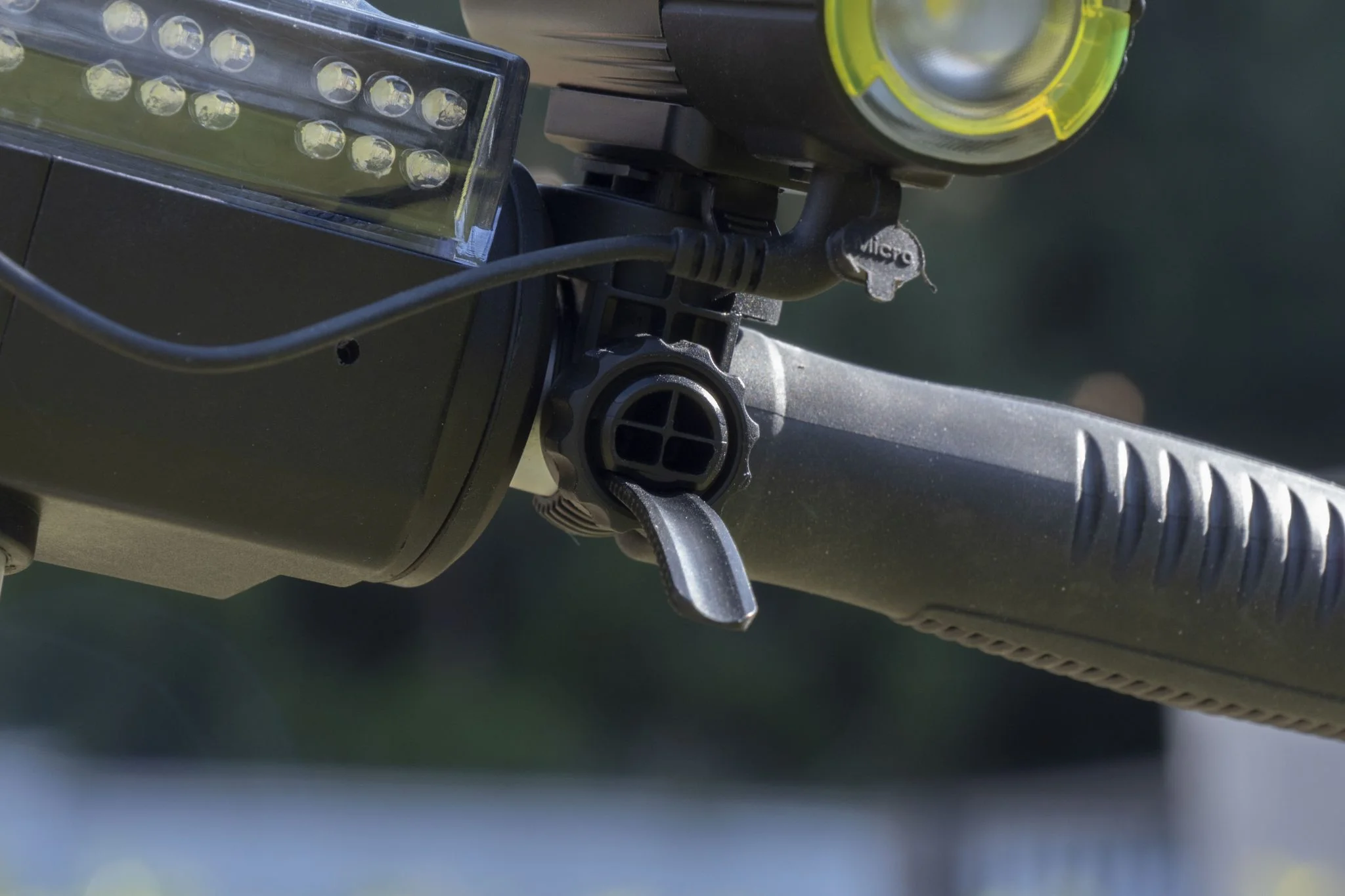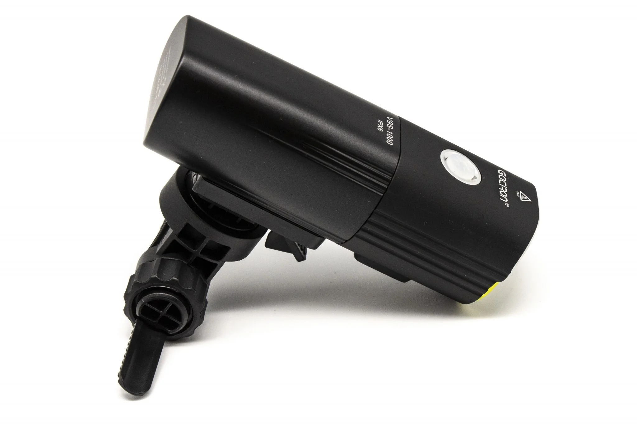 Itt található a felfogató sín is, és természetesen a doboz egy meghúzható műanyag bilincset is rejt, amivel a bringakormányra – vagy éppen uniciklire vagy rollerre, ahogy mi csináltuk – lehet felfogatni. Ezt is körbelengi a jó minőség, szerintem a fogakból álló rögzítőmechanika sem leverődni, sem elszakadni nem fog. Középen forgatható talp található, amivel finomhangolhatjátok a fénysugár irányát. Szerencsére az alapcsomag része a Gaciron V9S-1000-hez tartozó kormánypánt, amiről külön is vezérelhető az eszköz, így menet közben nem kell a lámpát babrálni, elég az USB-vel beköthető gombot nyomogatni.