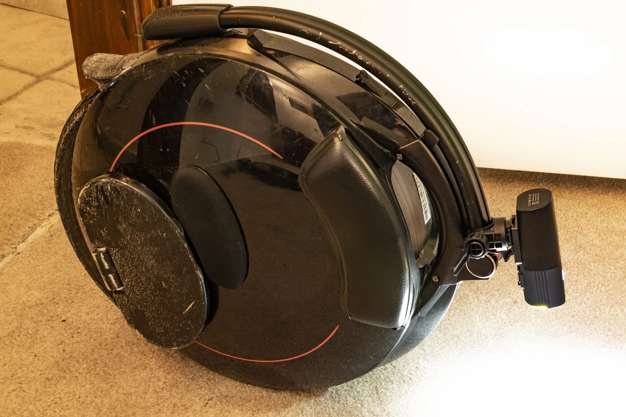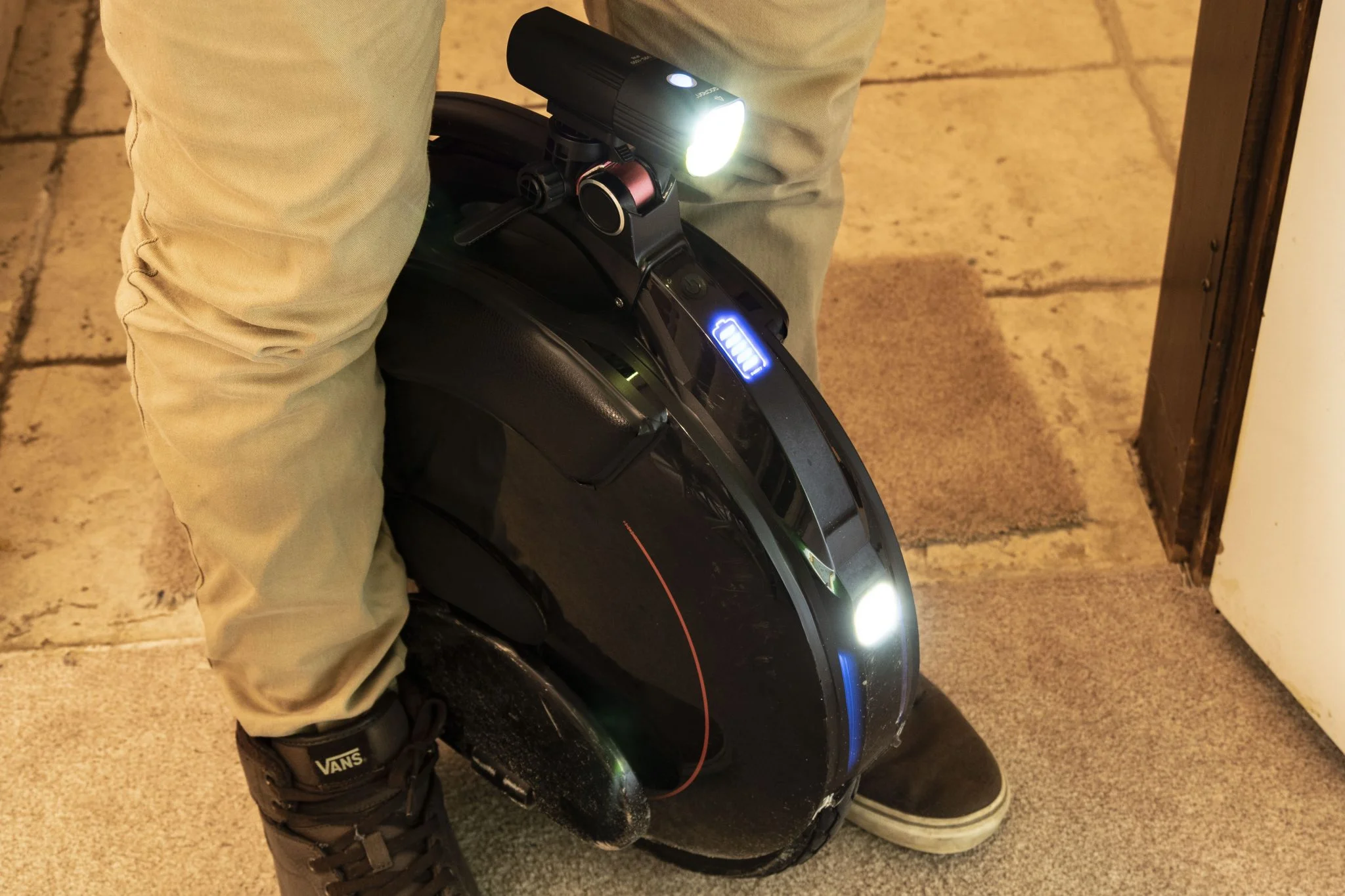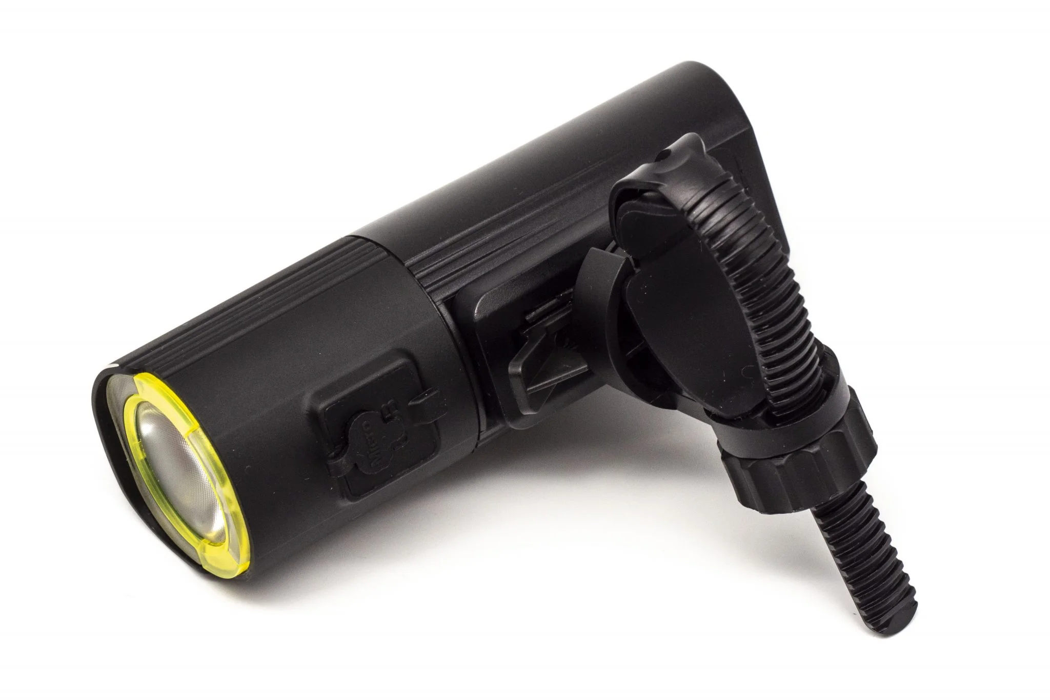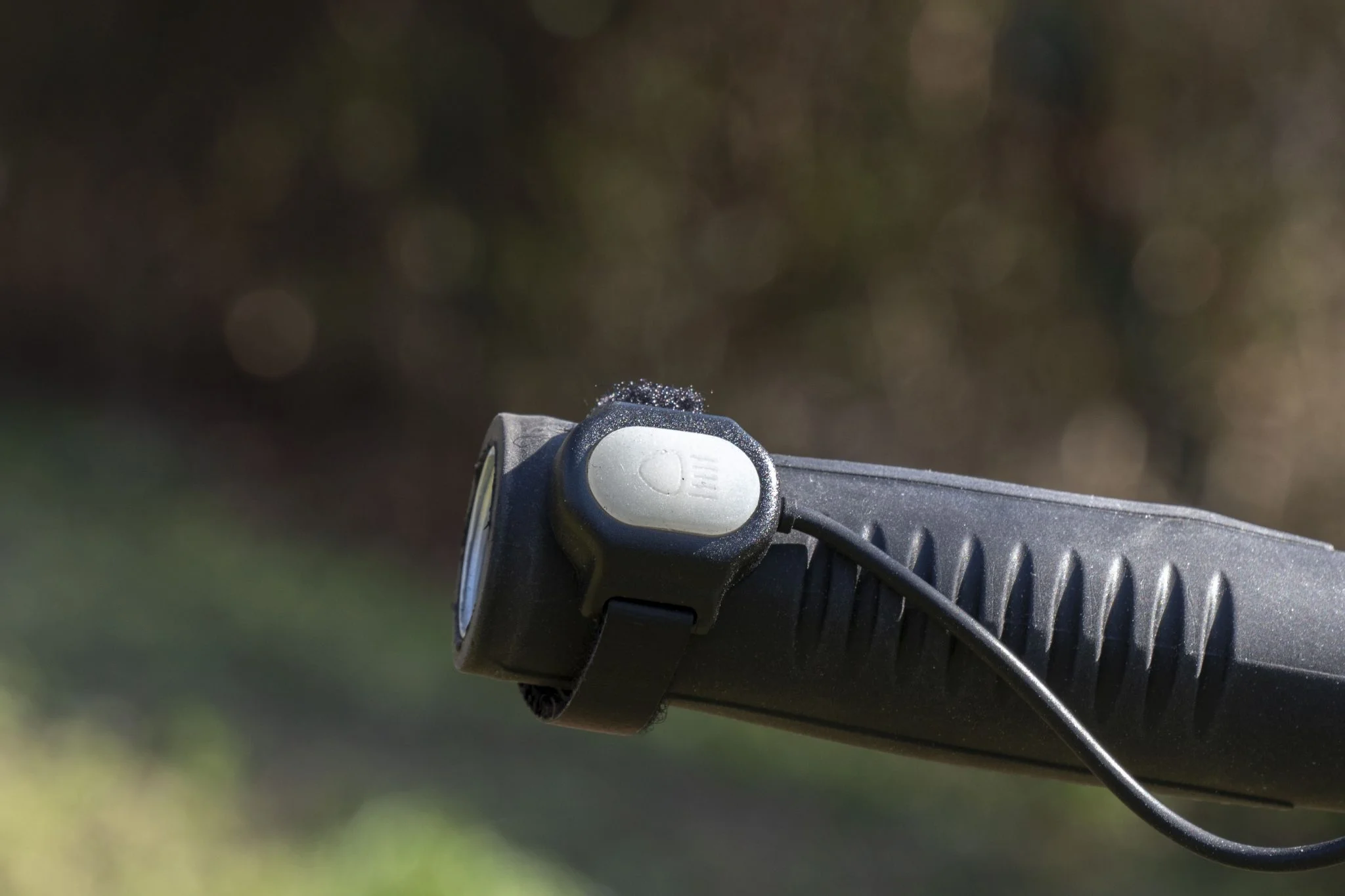 Itt található a felfogató sín is, és természetesen a doboz egy meghúzható műanyag bilincset is rejt, amivel a bringakormányra – vagy éppen uniciklire vagy rollerre, ahogy mi csináltuk – lehet felfogatni. Ezt is körbelengi a jó minőség, szerintem a fogakból álló rögzítőmechanika sem leverődni, sem elszakadni nem fog. Középen forgatható talp található, amivel finomhangolhatjátok a fénysugár irányát. Szerencsére az alapcsomag része a Gaciron V9S-1000-hez tartozó kormánypánt, amiről külön is vezérelhető az eszköz, így menet közben nem kell a lámpát babrálni, elég az USB-vel beköthető gombot nyomogatni.