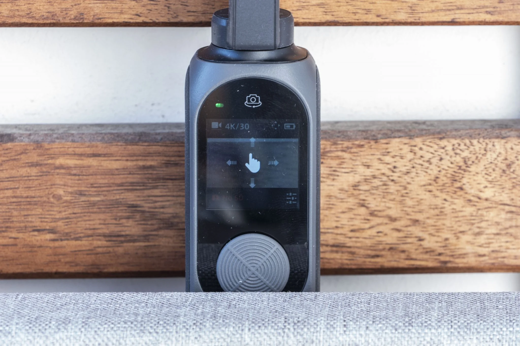 A piros gomb funkcióját mindenki ki fogja találni, de ha nem menne: hosszú nyomásra be- és kikapcsol, rövidre elindítja az aktuális funkciót. Itt hívnám fel a figyelmet arra a rejtett gombra, ami a kijelző fölött található és a kamerát tenné szelfi módba – vagyis felétek fordítaná a fejet -, már amennyiben működne. Többen is próbáltuk, de sajnos nem csinál semmit, egyedi hiba lesz, mert a YT videókon másoknál gond nélkül ment.