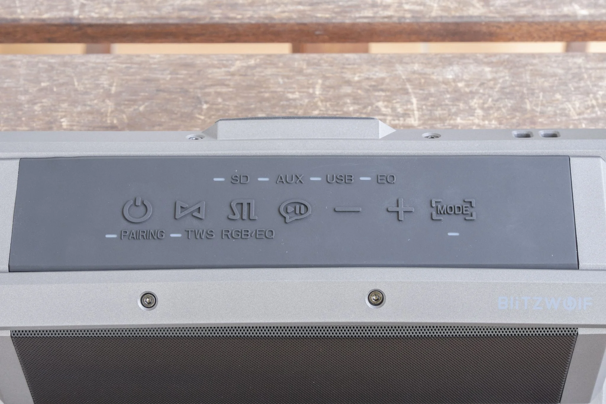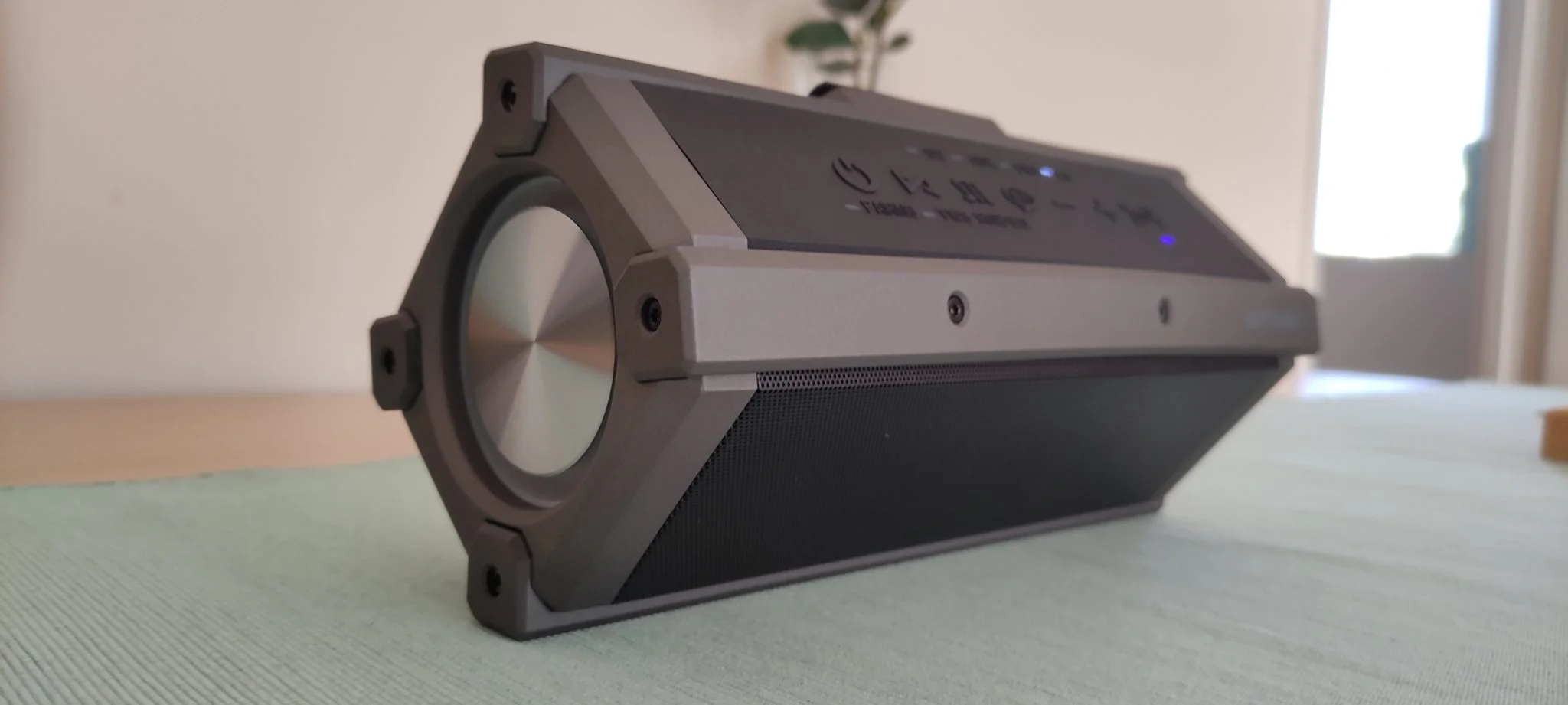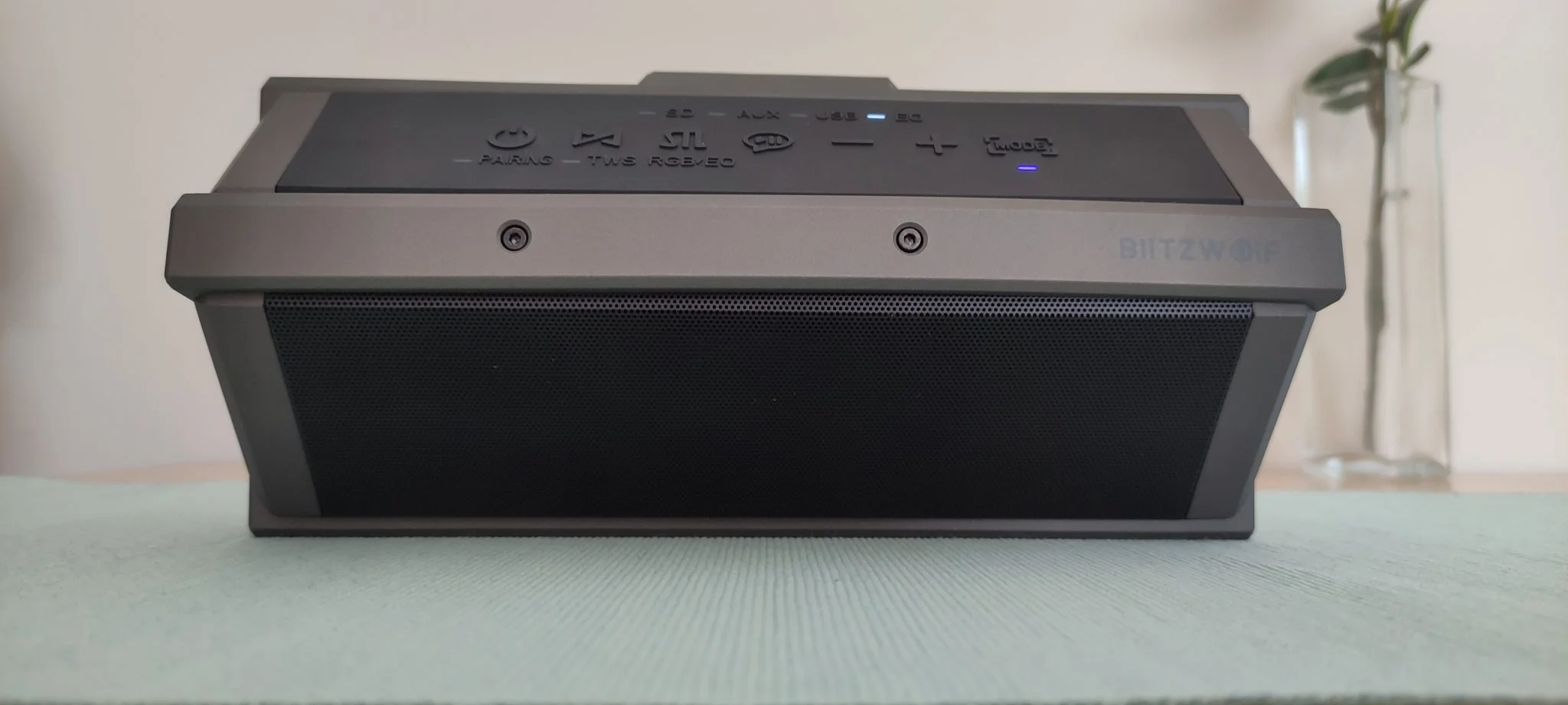 Aztán vannak az olyan extrák, mint hogy a módváltásnál felvillantja a megfelelő kis LED lámpát, hogy tudjátok, éppen a Bluetooth, az USB-A, az SD kártya bemenet vagy az AUX az aktív. Ezenkívül azt is mutatja, ha TWS vagy párosító módban van, így nem fogtok belegabalyodni az állítgatásba. Ezek tipikusan olyan dolgok, amik egy kis odafigyelést igényelnek, de egyáltalán nem vonnak maguk után nagy költséget, szóval a BlitzWolf majdnem tökéletesre vizsgázott. Azért azt sikerült elrontani, hogy nincs egy normális töltöttség kijelzés, az viszont poén, hogy a cucc szélei annyira laposak, hogy az élére fordítva is megáll, egyrészt menőn néz ki, másrészt meg a kezelőszervek így jobban kézre állnak.