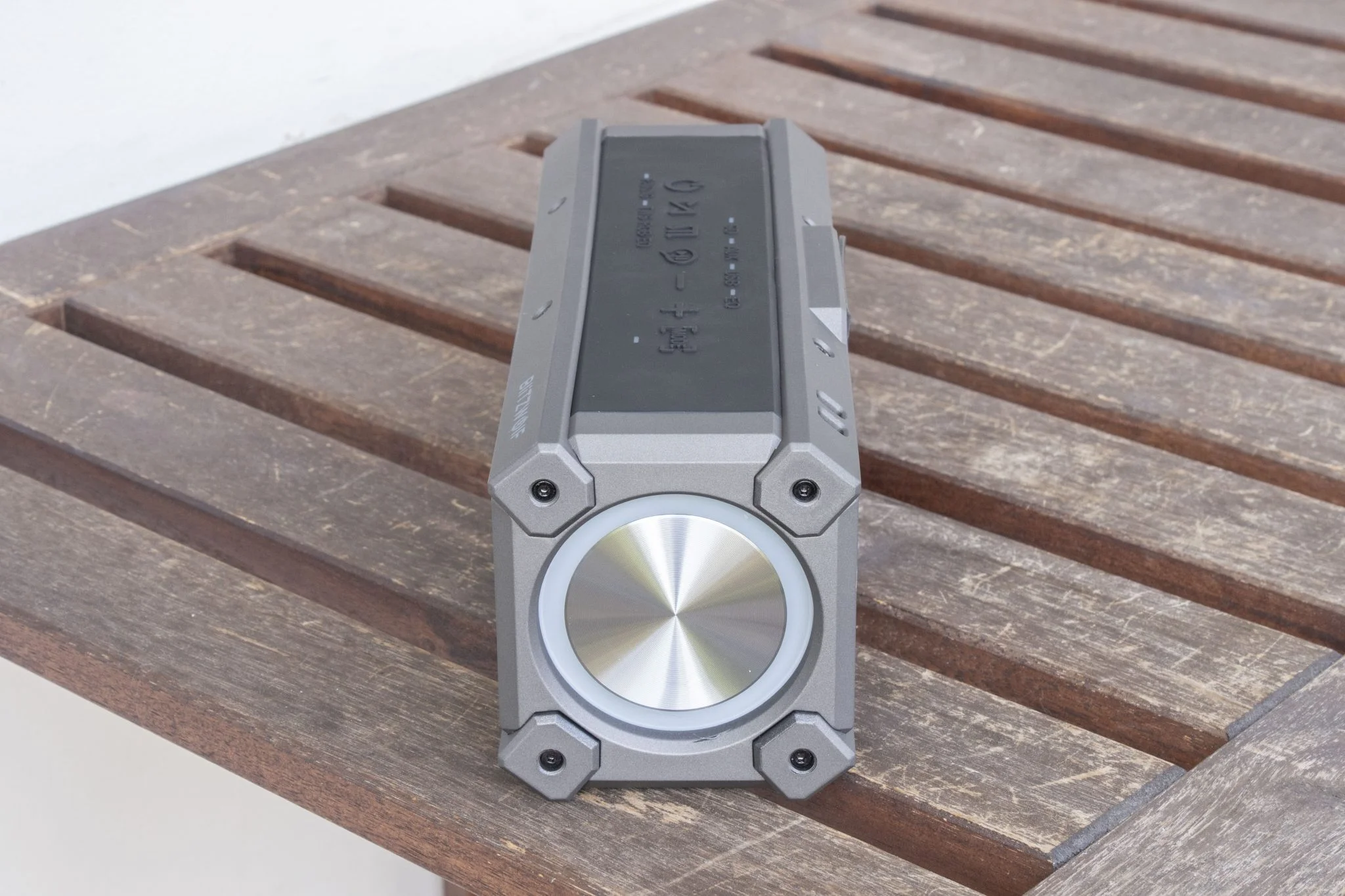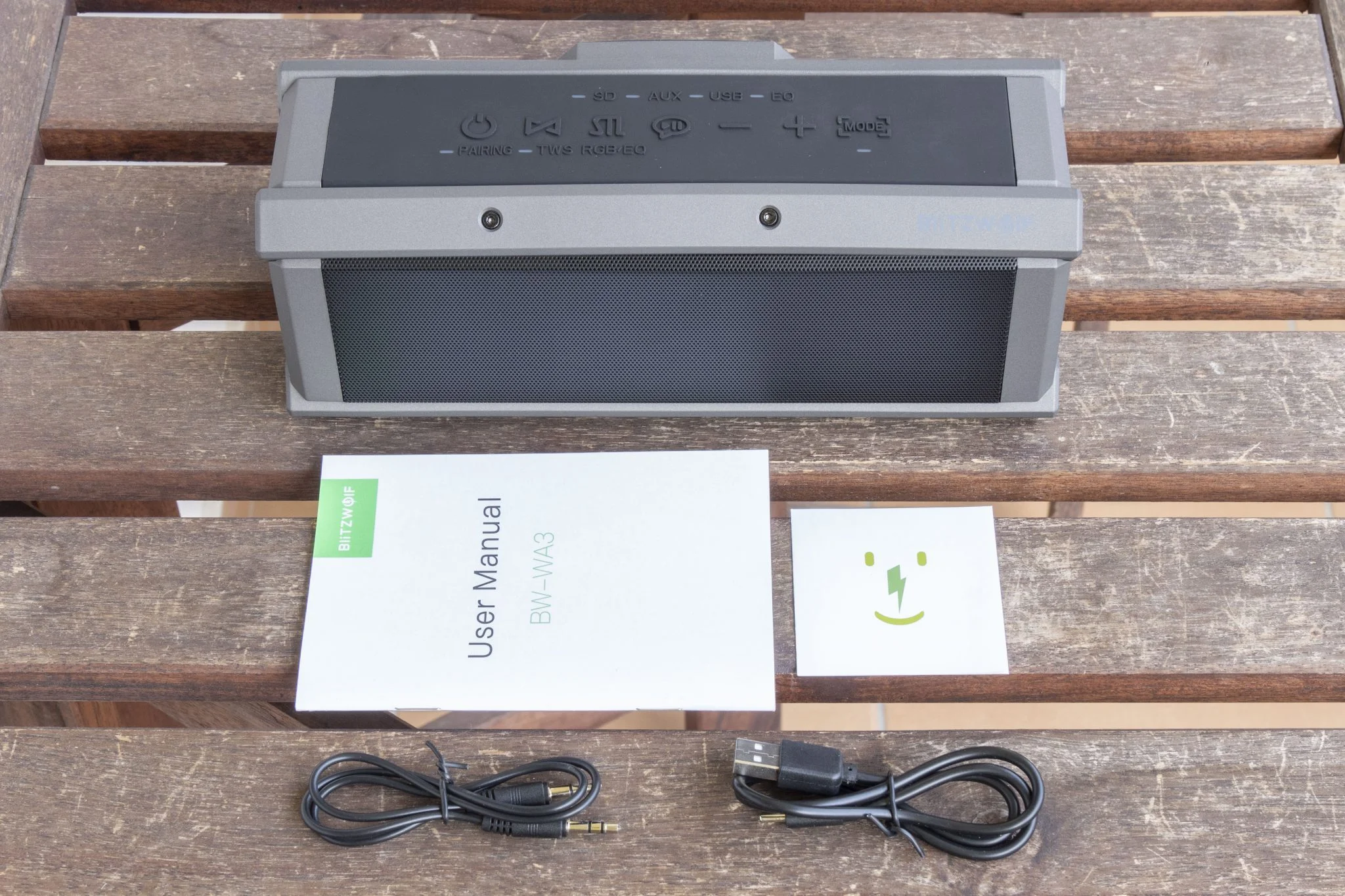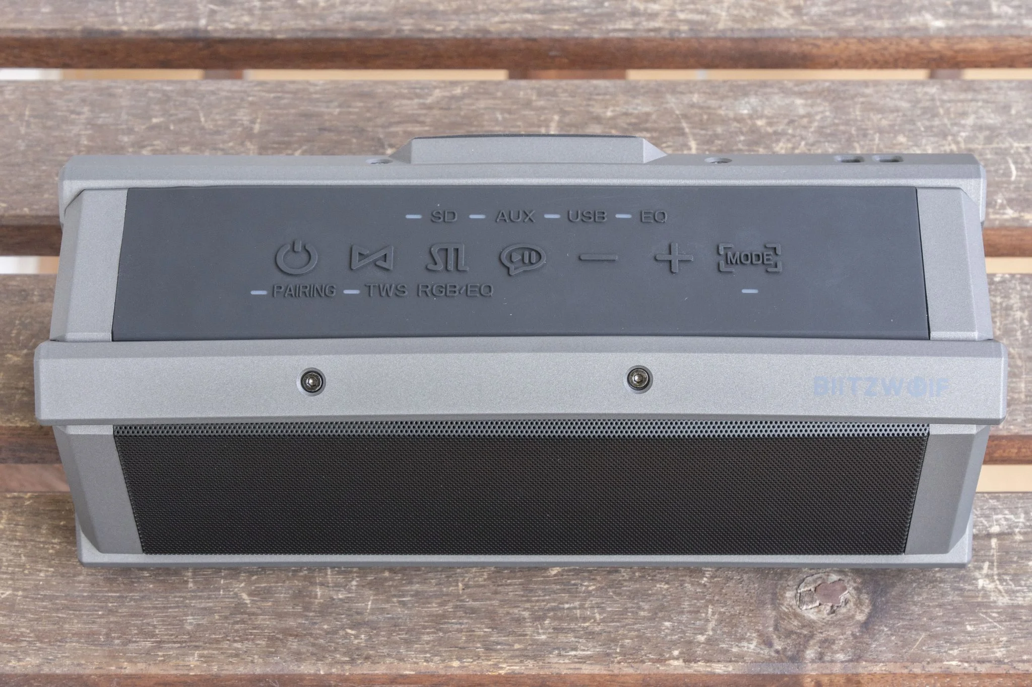 Aztán vannak az olyan extrák, mint hogy a módváltásnál felvillantja a megfelelő kis LED lámpát, hogy tudjátok, éppen a Bluetooth, az USB-A, az SD kártya bemenet vagy az AUX az aktív. Ezenkívül azt is mutatja, ha TWS vagy párosító módban van, így nem fogtok belegabalyodni az állítgatásba. Ezek tipikusan olyan dolgok, amik egy kis odafigyelést igényelnek, de egyáltalán nem vonnak maguk után nagy költséget, szóval a BlitzWolf majdnem tökéletesre vizsgázott. Azért azt sikerült elrontani, hogy nincs egy normális töltöttség kijelzés, az viszont poén, hogy a cucc szélei annyira laposak, hogy az élére fordítva is megáll, egyrészt menőn néz ki, másrészt meg a kezelőszervek így jobban kézre állnak.