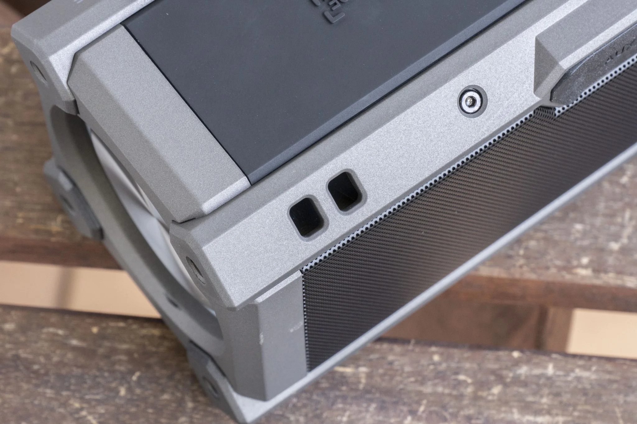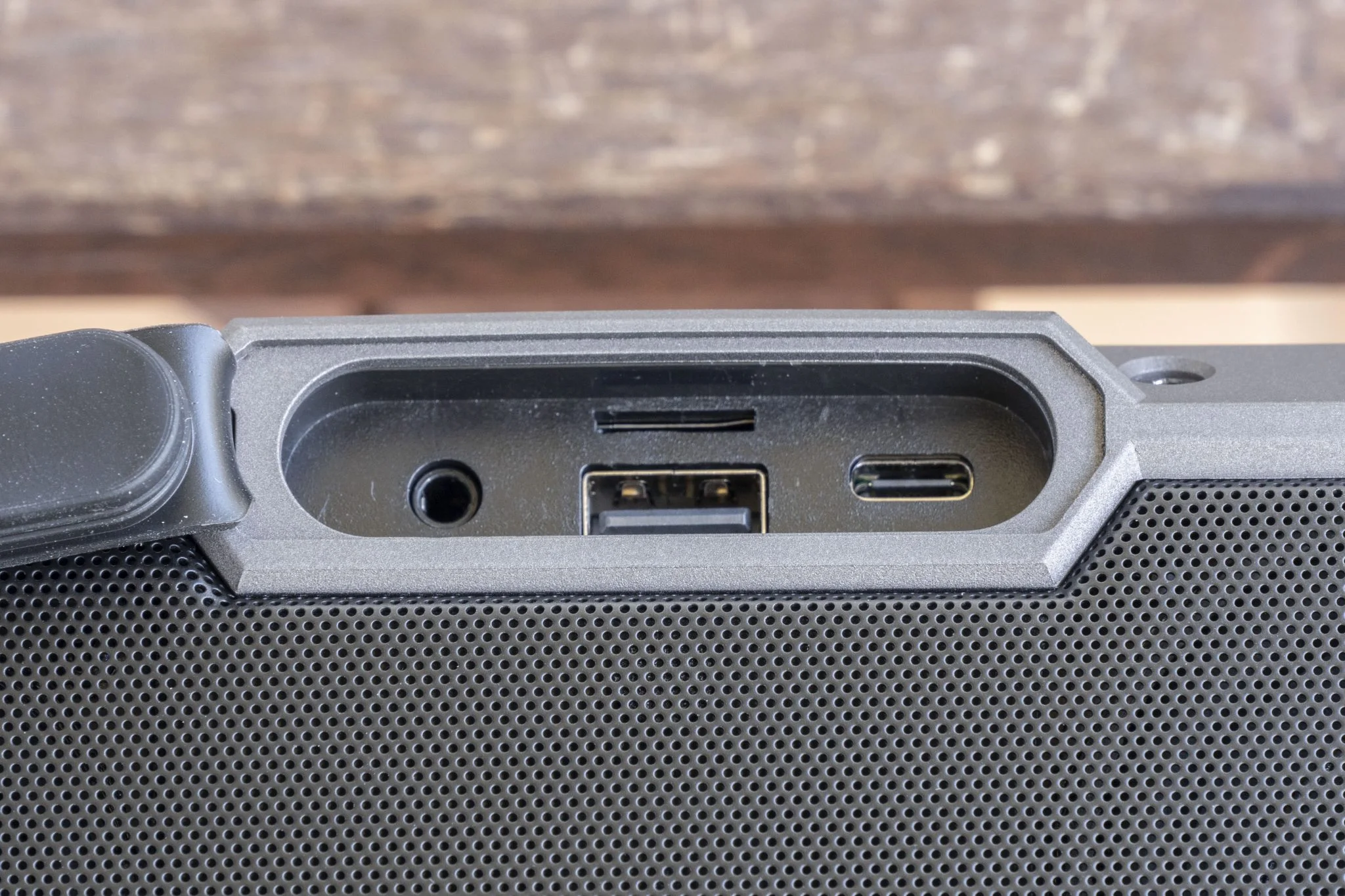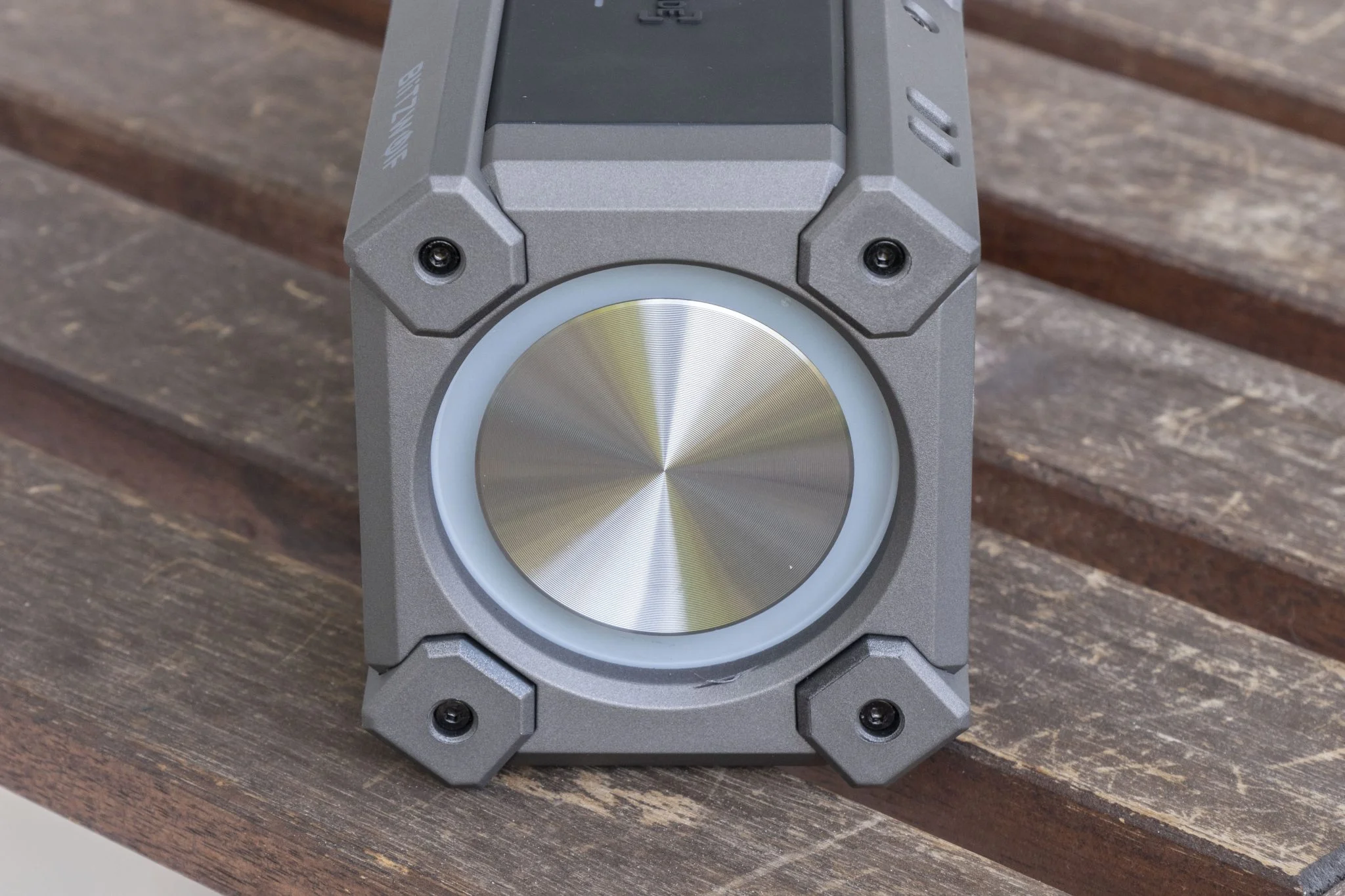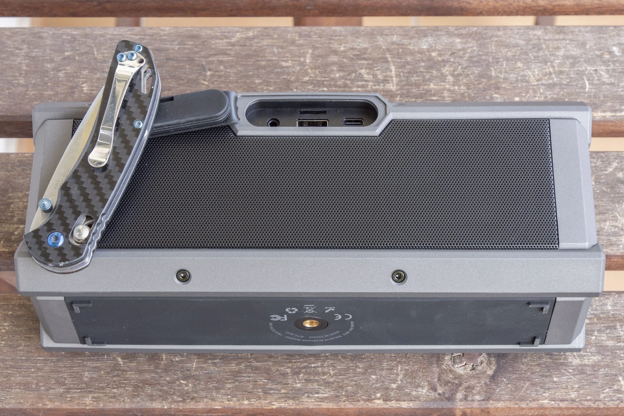 az egyik a bal hátul megtalálható fül, amibe kötelet lehet fűzni és ezzel felrögzíthető a hangláda, viszont ilyesmit nem adnak hozzá a dobozban, csak egy Type-C kábelt, amivel tölteni lehet. A másik, a hason elhelyezkedő tripod mount, ami egy szabványos menet, és a projektorokhoz hasonlóan a hangszórót is állványra lehet szerelni. Ez egyébként egy teljesen jogos elvárás, hiszen fülmagasságban sokkal jobban szólnak az ilyen cuccok, nem is értem, más miért nem alkalmazza a megoldást.