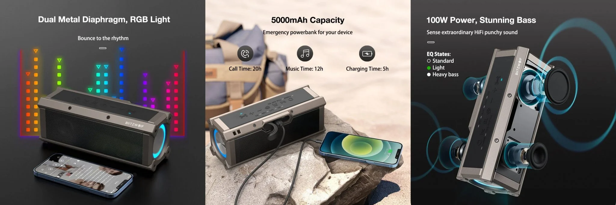 Aki keménynek akar látszani, esetleg túrázó, hegymászó vagy hasonló hobbit űző egyén, az vegyen BW-WA3-at. Meg az is, akinek egy kellemes hangminőségű, jól kezelhető, brutális teljesítményű hangszóróra van szüksége. Két dolog nem tetszett, az egyik, hogy ez a kályhaezüst felület szerintem hajlamos lesz a kopása, a másik, hogy kihangosítóként nagyon gyenge teljesítményt nyújt. De ez kit érdekel, senki nem vesz ezért BT hangszórót. A hangja jó, az üzemideje nem különben, tönkremenni sem fog a masszív cucc. A beépített ekvalizer, a TWS mód és a menet az alján extra, akár állványra is állíthatjátok, van egy csomó csatlakozó rajta, powerbankként is funkcionál, szóval jó kis cucc ez.