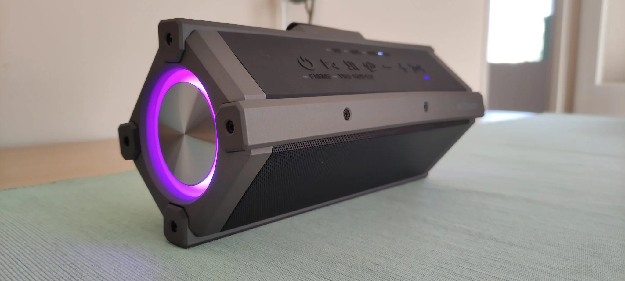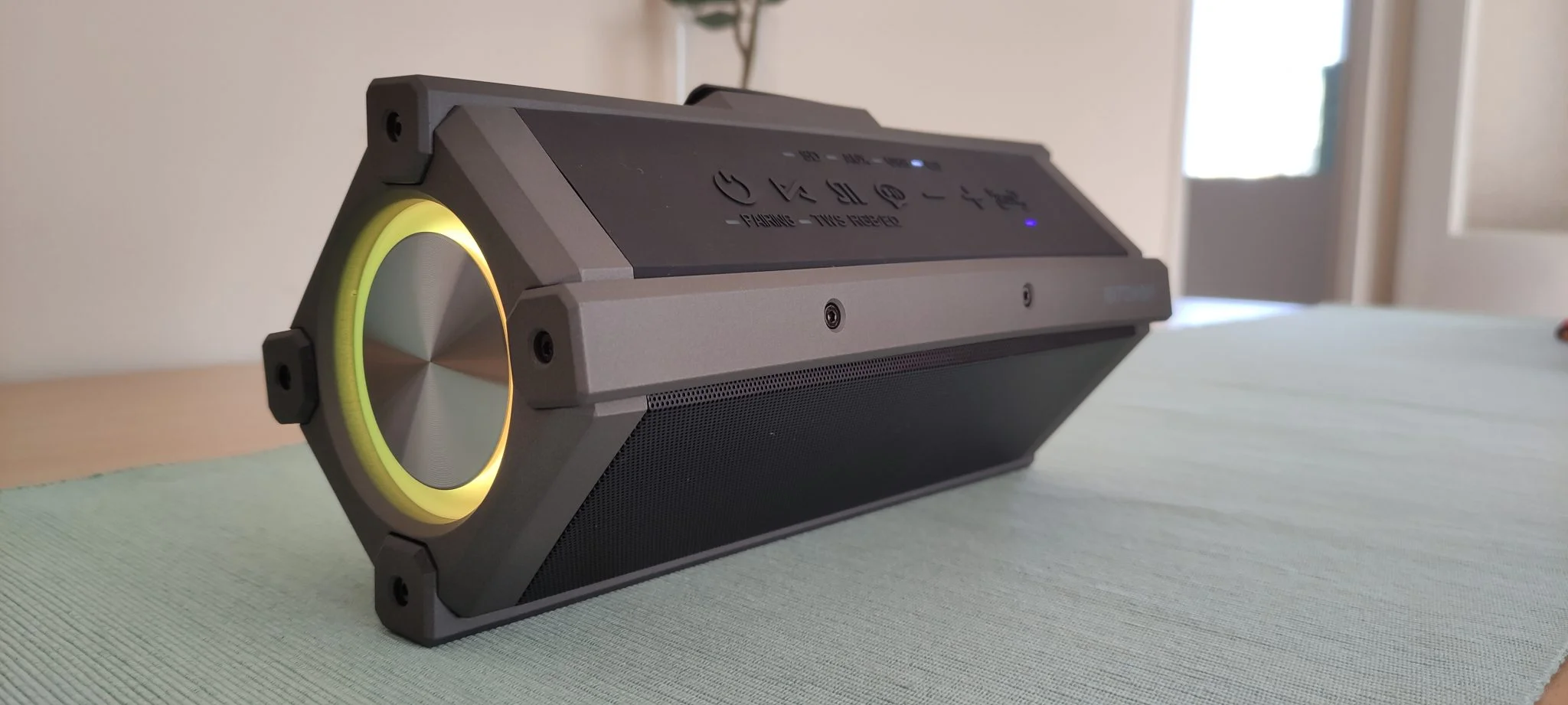 Ahogy már említettem, ez egy TWS képes eszköz, amit nem tudtam kipróbálni, mert csak 1 db-ot kaptam. Ennek lényege, hogy egy másik BW-WA3-mal képes összekapcsolódni és ilyenkor sztereó módban képesek szólni. Erre a gyakorlatban azért nincs igazán szükség, mert 1 db is olyan kegyetlenül hangosan képes szólni, hogy gyakorlatilag elviselhetetlen a hangja a lakásban. Nem tudom, hogy tudja-e a 100 W-ot – valószínűleg nem -, de hát ez úgy ordít, mint az állat. És mivel ez egy tipikusan táborba, a tűz mellé való cucc, ezért ott talán kevésbé hiányzik a sztereó hatás, de mondjuk a 2×100 W jó lehet, ha nagyobb térről és társaságról van szó. Három funkció van még, ami említést érdemel, ez is tudja a szokásos hangasszisztenst, amit kb. itthon senki nem használ, aztán ott van az RGB LED kikapcsolhatósága, amit azonnal meg is tettem, a harmadik pedig a beépített ekvalizer.