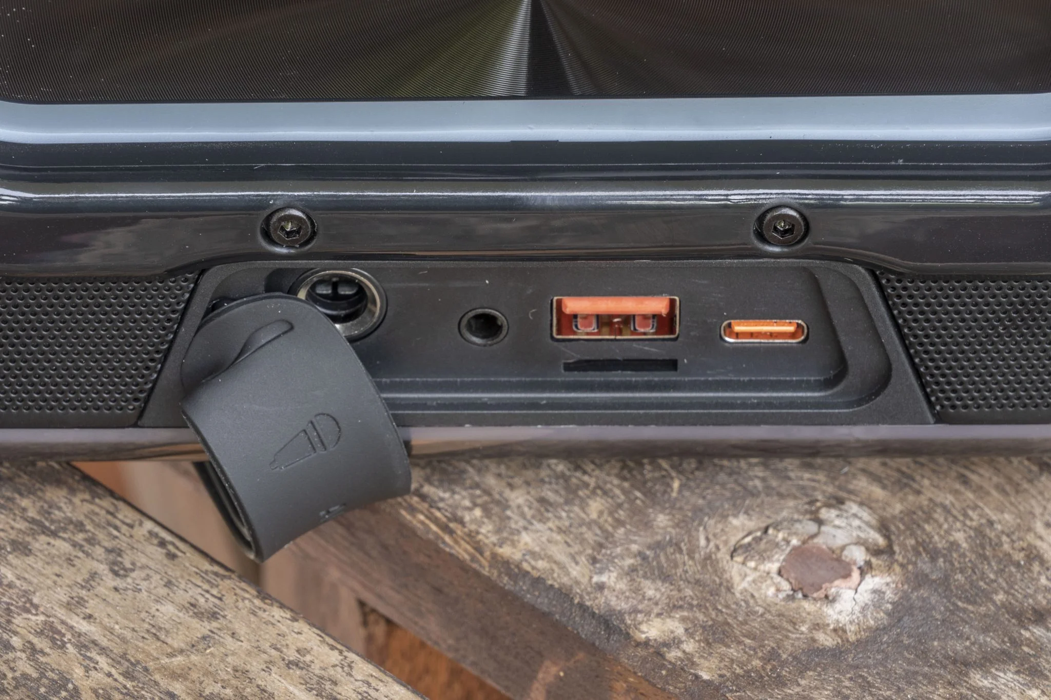 A hátoldalon van egy szilikon fedlap, amivel teljesíti az IPX5 szabványt, ami ma már nem nagy truváj, abból kiindulva, hogy szép számmal vannak a piacon közel vízálló hangszórók is. Cserébe számtalan be- és kimenetet és csatlakozót vonultat fel a BlitzWolf BW-WA6: