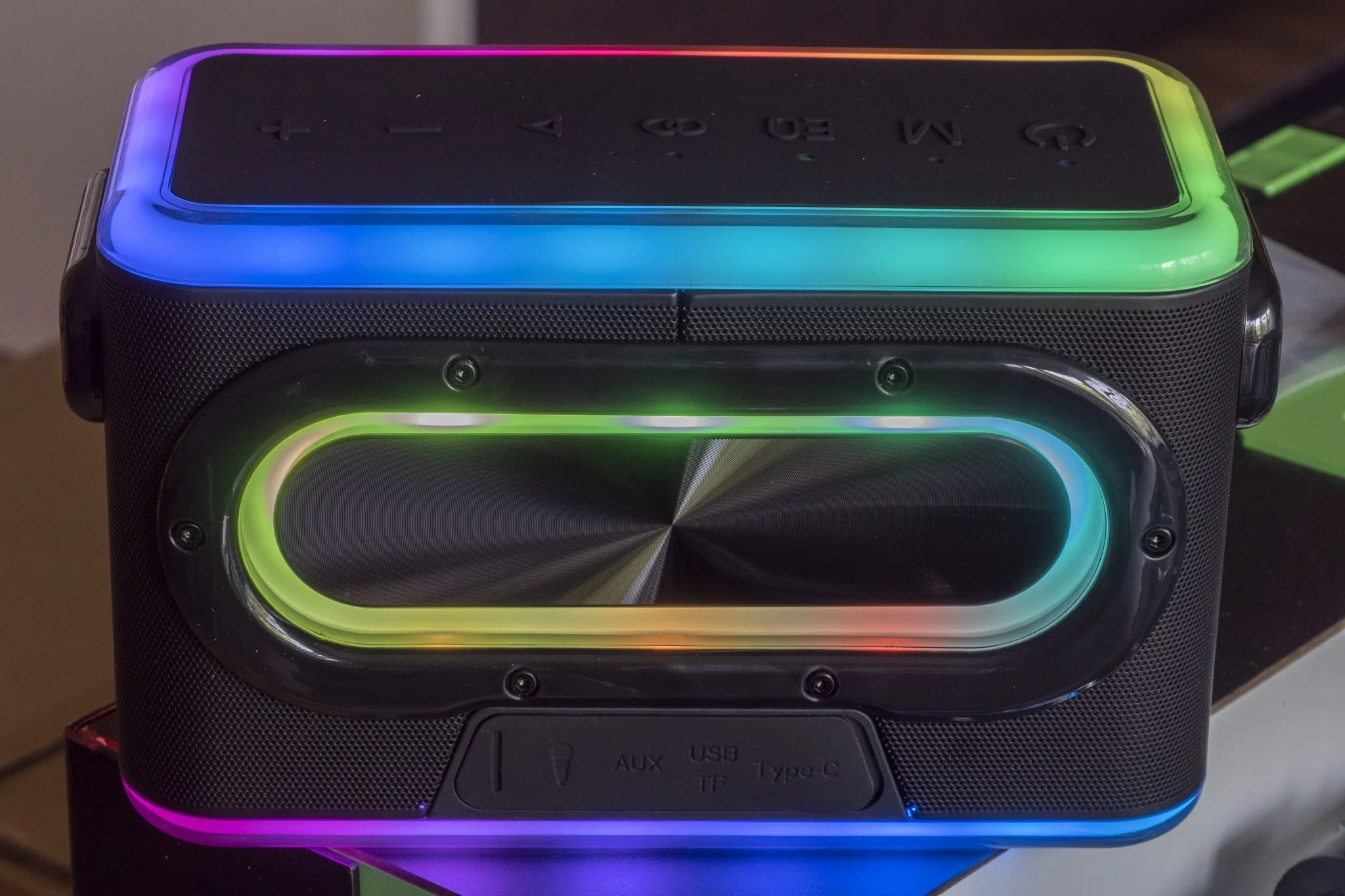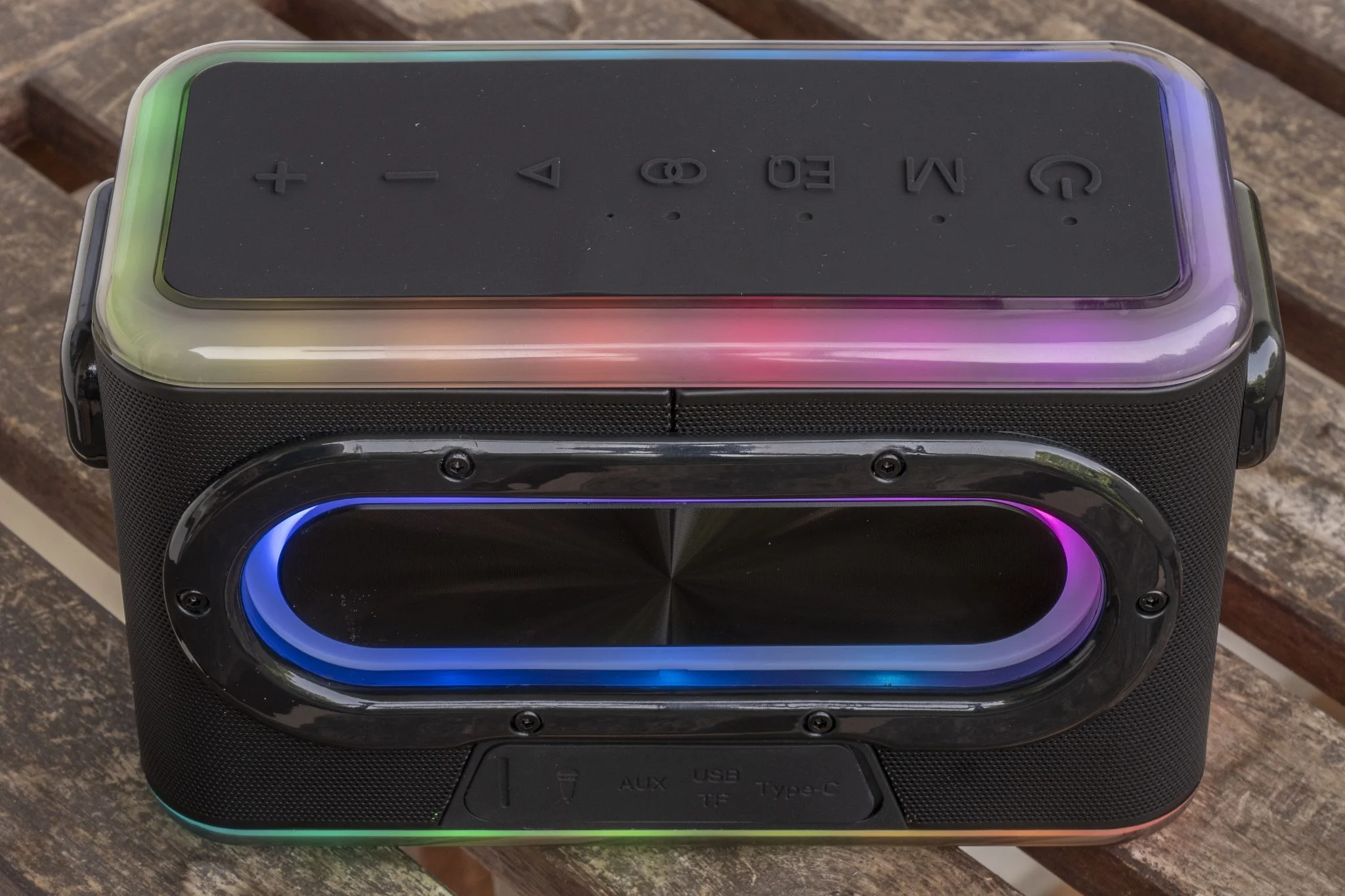Ebből az USB-A nemcsak a pendrive-ok miatt van ott, hanem innen lehet vész power bankként is használni a hangszórót. Ezzel kapcsolatban gyorsan meg is néztem, mekkora akkumulátor van benne, és a 6000 mAh-s kapacitás rendben van, viszont a 3-6, egyes esetekben 7 órányi üzemidő annyira azért nem lelkesítő. Mondjuk, meglepőnek sem mondanám, hiszen 80 W teljesítményről van szó, amit egy RGB LED működtetése fejel meg, ami szerencsére kikapcsolható. Elképesztő, milyen éhesen zabálják fel az elektronokat a fényforrások, ezt tapasztaltuk a Tronsmart termékek kapcsán is, szóval, aki tisztes üzemidőt akar, az lője le a világítást. Nálam 7 órán át bírta, de a BlitzWolf BW-WA6 az asztalomon állt, így nem akartam, hogy az arcomba ordítson. Viszont mikor elfelejtettem a LED-et kikapcsolni, volt, hogy naponta kétszer! is lemerült, ami eléggé kiábrándító.
