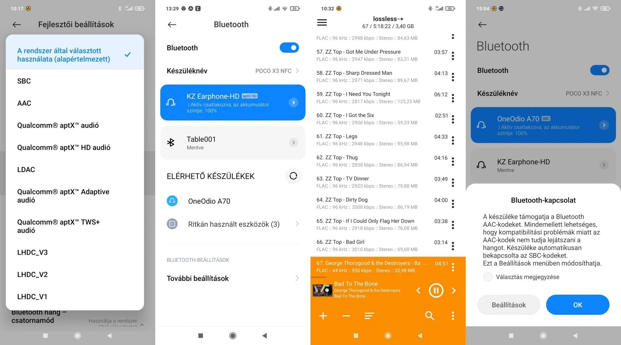 Az SBC kódolás maximum 320 kbps adatot tud átvinni, vagyis ha ennél részletesebb zeneszámot hallgattok, akkor csökkenni fog a részletesség. Ez olyan dolgokban fog megnyilvánulni, mint hogy bizonyos hangszerek hangja tompább lesz vagy elveszik, nem jönnek ki a részletek, de pl. a lemezjátszó tűjének a sercegését sem halljátok majd, és így tovább. Az aptX HD átvitele az SBC-vel szemben 576 kbps, vagyis jóval több minden marad meg az eredeti hangsávból. Persze itt nemcsak a fülhallgatónak kell ismernie a szabványt, hanem az azt lejátszó eszköznek is, szóval az egyáltalán nem biztos, hogy mondjuk a telefonotok is támogatja, de azért jó esély van rá. Ezt egyébként a fejlesztői módba átállított készülékeken meg lehet nézni a „Bluetooth hangkodek” menüpont alatt. Természetesen az aptX HD-nál is vannak nagyobb átviteli sebességű szabványok, mint a Sony által kifejlesztett LDAC, de az ilyen szabványt is támogató fülesekért még többet kell fizetnetek, bár a 1More E1001BT ára nem is olyan vészes.