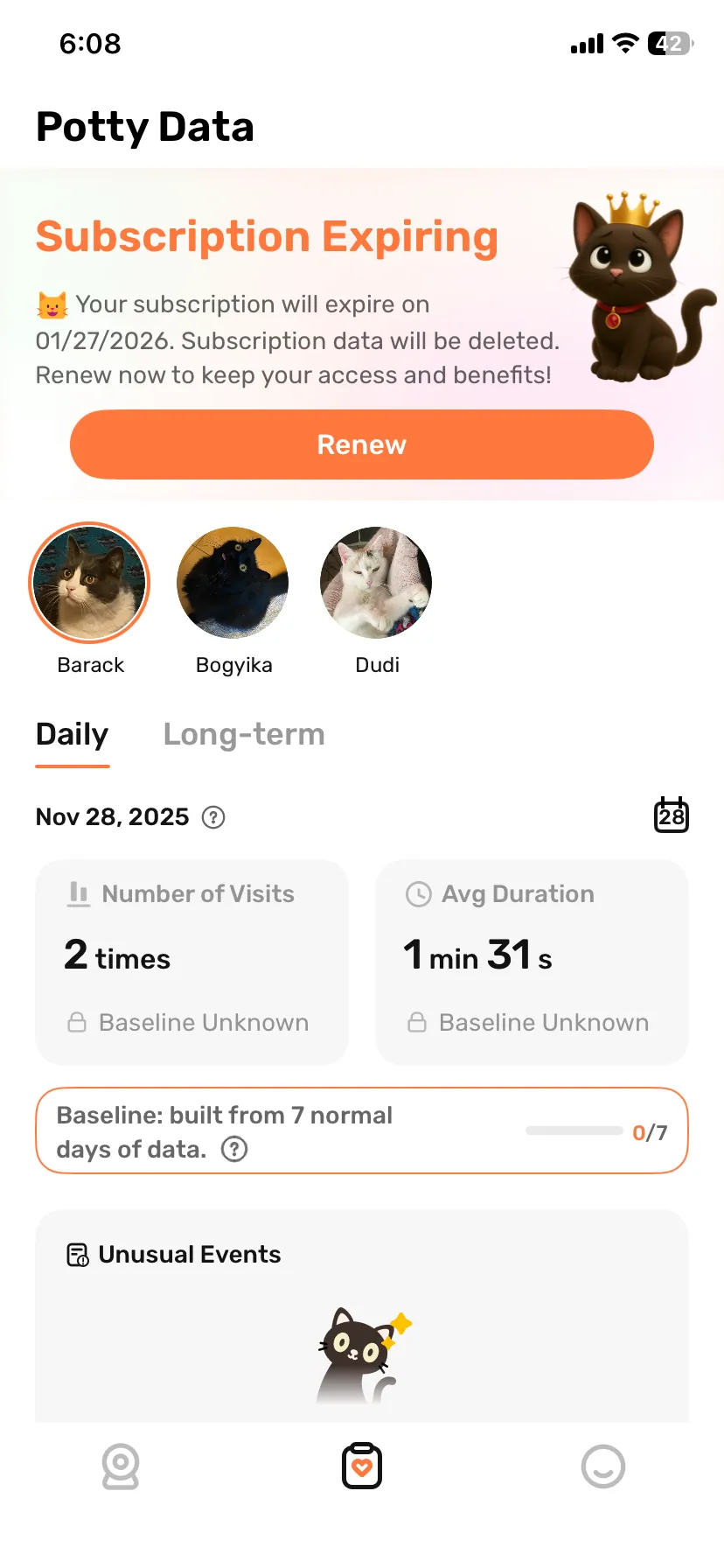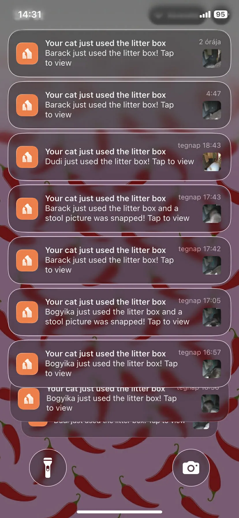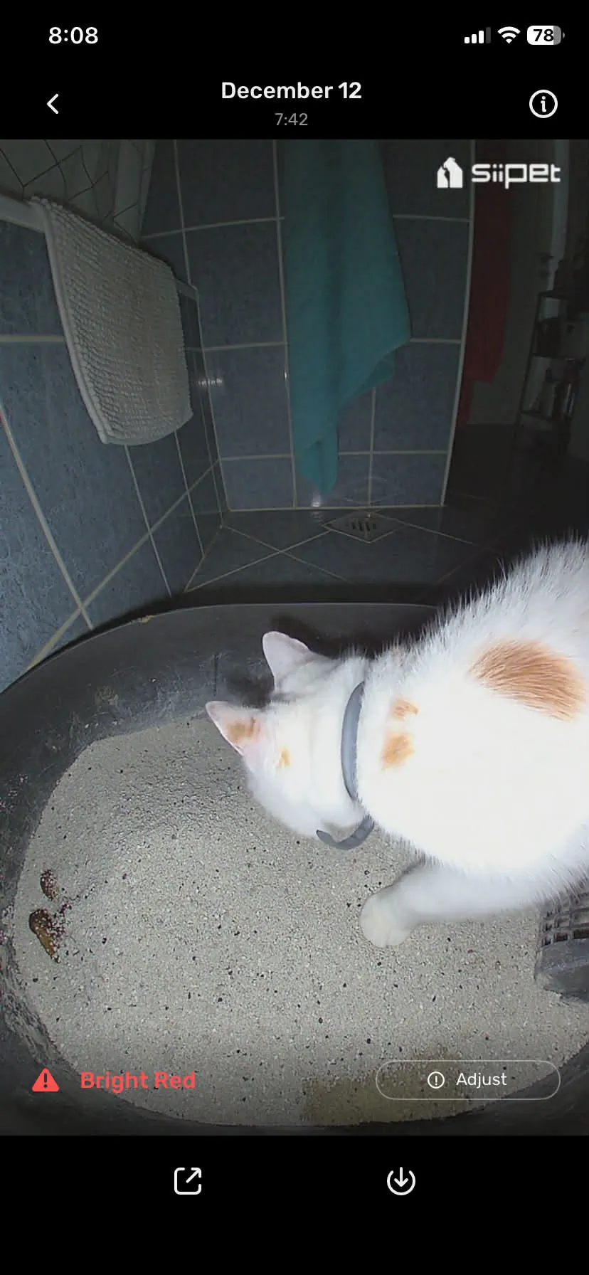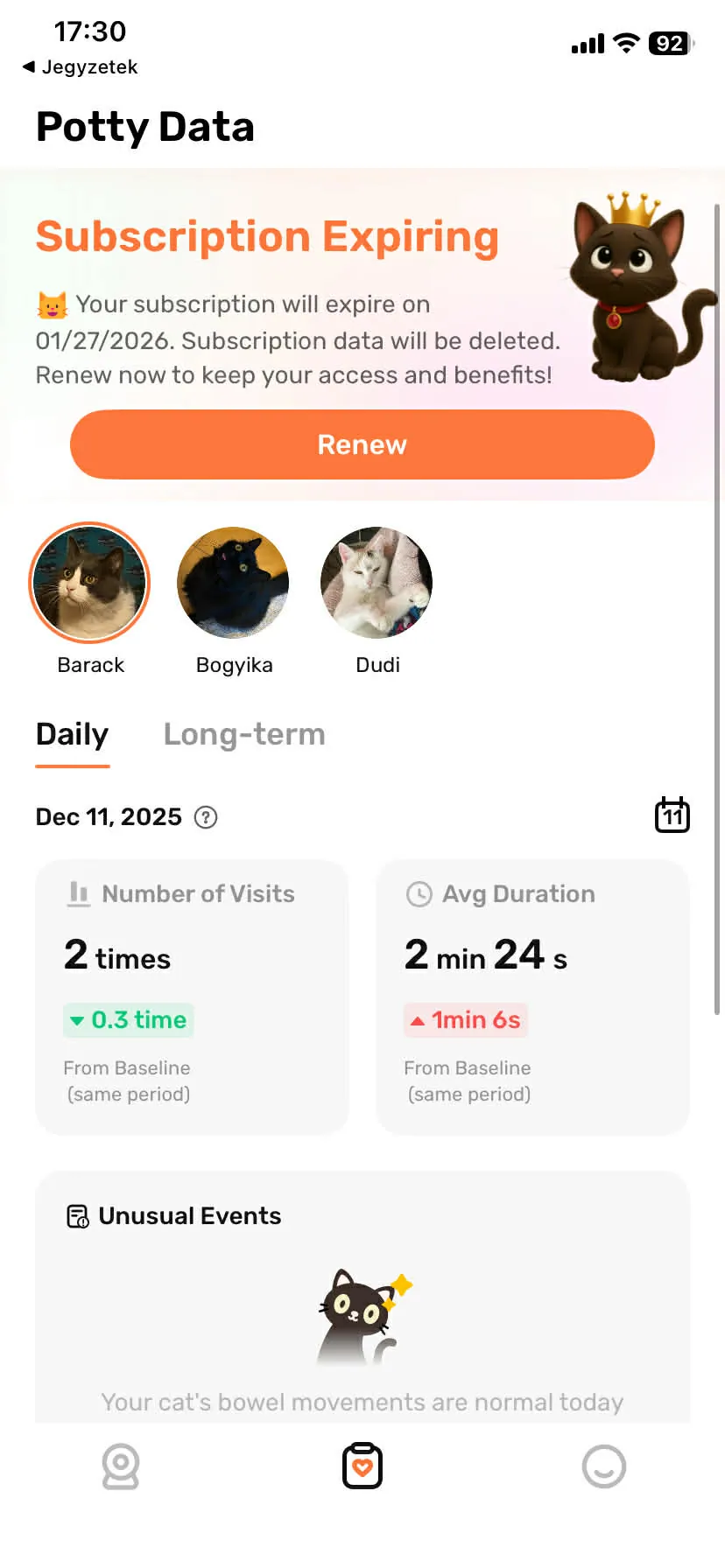 Így ilyenkor a gazdinak saját magának kell kukkolnia és elemezni az alomtálca használatával kapcsolatos szokásokat, ami több napig vagy hétig is eltarthat, főleg akkor, ha valaki nem otthonról dolgozik, és addigra a baj még nagyobb lehet. Szerencsére ilyen riasztásra nem sok példa volt: az első és legdurvább az egyik cica székletével volt kapcsolatos, ugyanis a szokásosnál világosabb barna volt, de ezt a kamera valamiért véresnek látta, így piros színűnek jelezte – csupán vaklárma volt. A másik negatívnak mondható jelzés egy újabb figyelmeztetés volt, ugyanis a LitterLens észlelte, hogy a legidősebb cicám gyakrabban jár az alomra a megszokotthoz képest, viszont félig-meddig ez is vaklárma volt, hiszen a napi átlagos látogatások száma csak eggyel emelkedett.