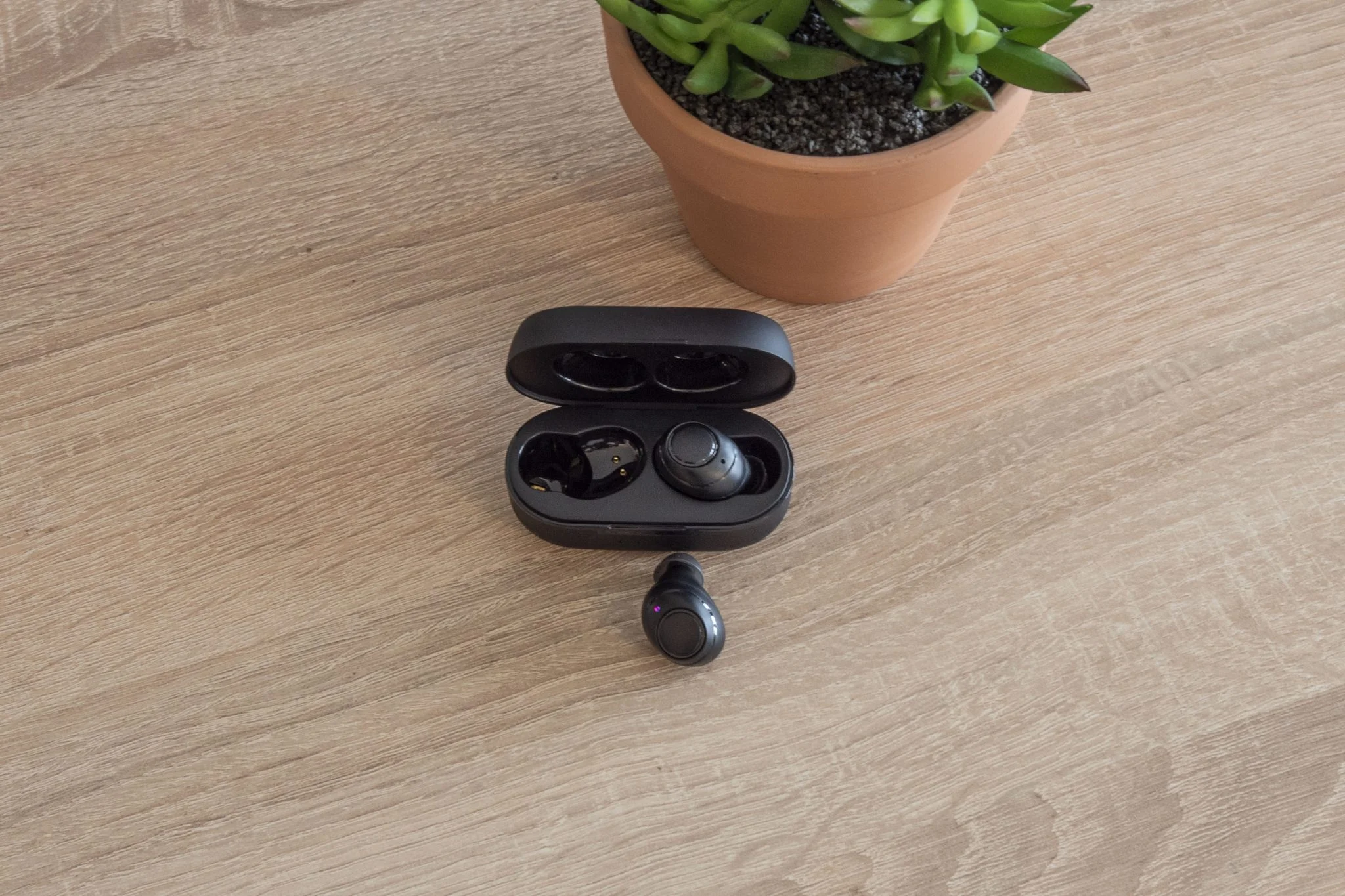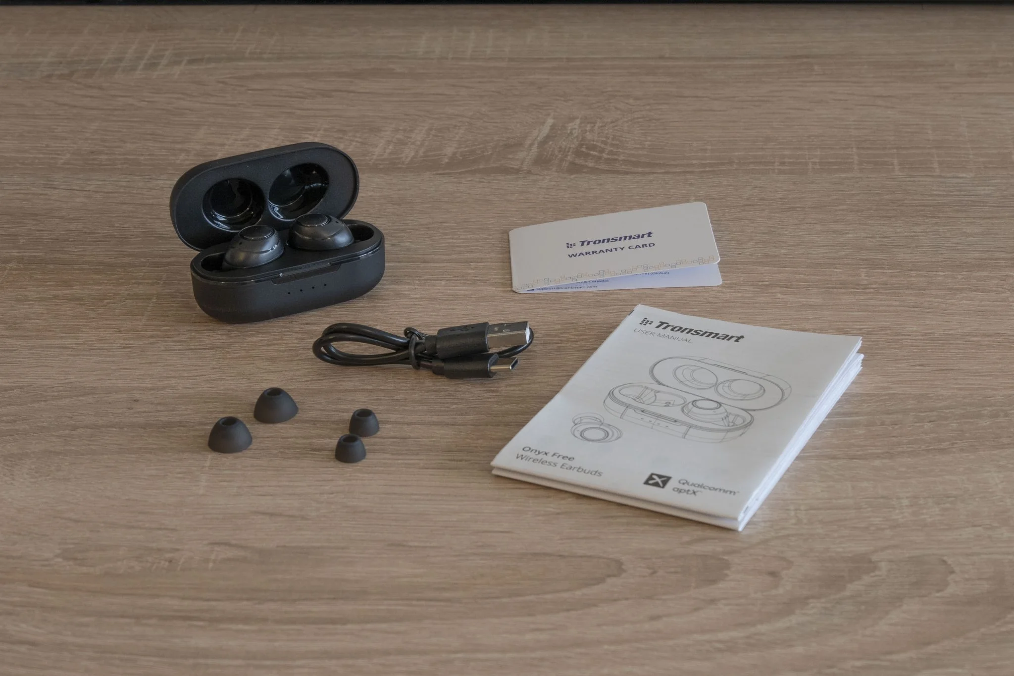 Ebből a sablonos szerepből kell kitörnie a Tronsmart Onyx Free-nek és erre minden esélye is megvan, bár ezt a következtetést nem az egyen csomagolásból vontam le. Az összeállítás minden Tronsmart terméknél szolid, töltőkábel, bölcső, 3 pár gumiharang, leírás, szóval a szokásos dolgok. A külalak is eléggé átlagos, két fekete bogyó, egy-egy fizikai gombbal, kicsit jellegtelen, de alapvetően ezzel nincsen baj.