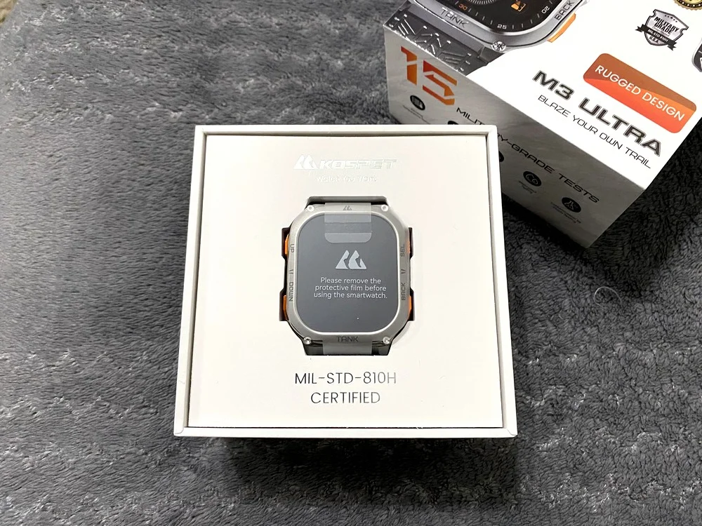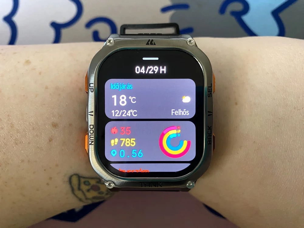 A Kospet Tank M3 Ultra okosórán érezhető a cég elköteleződése, hiszen nem egy akármilyen modellről van szó. Masszív, dizájnos dobozát kinyitva egyből az órával találtam szemben magamat, alatta pedig csak egy kis leírás és a mágneses töltője volt, sajnos az ígért üvegfólia lemaradt. A gyári, szilikon óraszíjat nem volt nehéz felcsatolni, de a minőségét tekintve egyszerűen nem méltó az óratesthez. Puha műanyagból készült és olyan könnyedén hajlik, mintha egy gyerekeknek szánt karóráról szedtem volna le, de szerencsére a gyártó oldalán többféle kiegészítőből lehet válogatni.