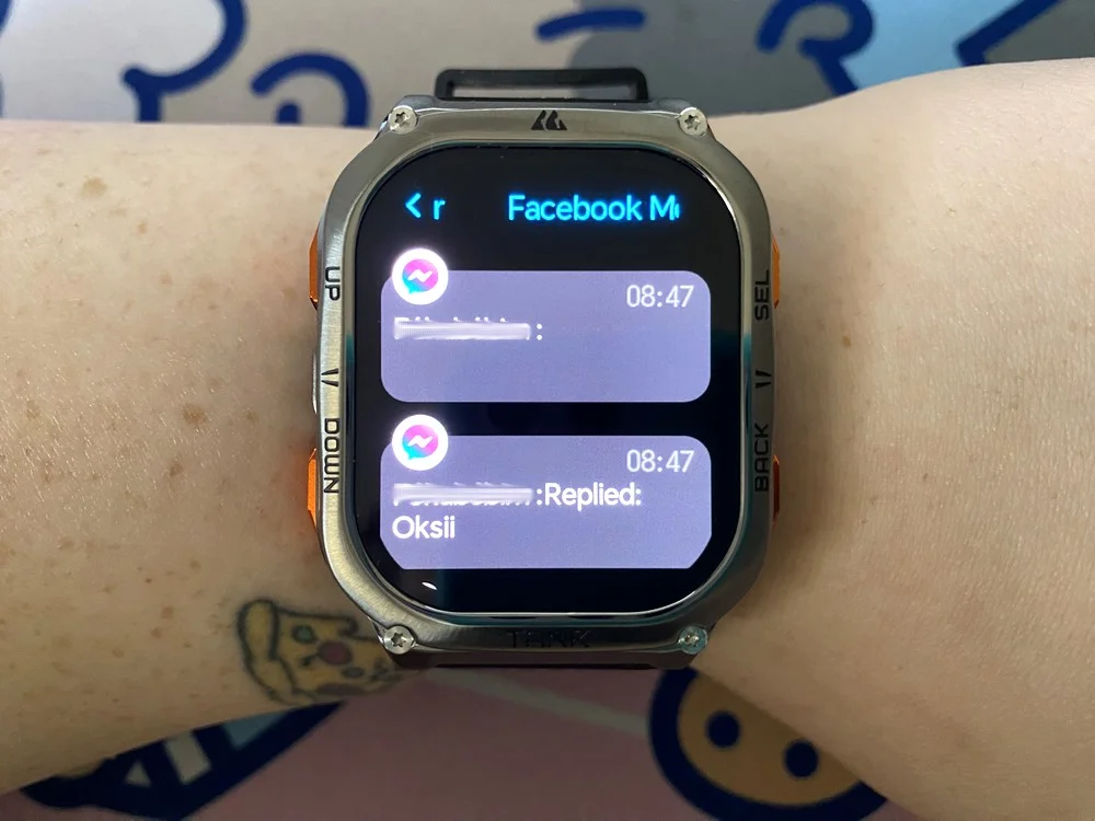 A képernyőt lentről felhúzva „parancsikon kártyákat” találsz, legalábbis az óra így nevezi. Ez is teljesen személyre szabható, én az alábbi sorrendet állítottam be: időjárás, napi tevékenység, pulzusszám, véroxigénszint, stressz, alvás és barometrikus magasságmérő, de még itt is elhelyezhetsz például stopperórát vagy időzítőt. Jobbra találod a komplett menüt, balra pedig az értesítéseket, amik furcsa módon nem voltak szinkronban a telefonommal, mert amit az órán kitöröltem, azt a telefonon is ki kellett és ez fordítva szintén igaz volt. Az értesítéseknek egyébként csak egy része olvasható, válaszolni pedig nem tudsz rá és nem is jön át minden applikációból. Persze a Facebook Messenger adott, de mondjuk Slack értesítésből egy darabot sem jelenített meg.
