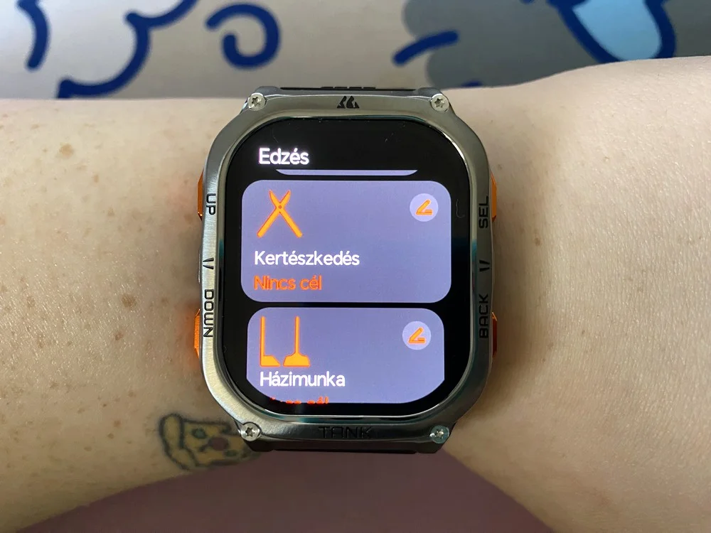 Ezek egyszerre sokkoltak és hálával töltöttek el, hogyha már legalább néhány férfi nem is, de ez az okosóra megérti, hogy a komoly házimunka igenis felérhet egy edzéssel. A több, mint 170 módból hatot automatikusan fel kellene ismernie (futás, séta, biciklizés, elliptikus tréner, evezőgép és állás), de az én esetemben a kerékpározásnál nem így történt, manuálisan kellett elindítanom a programot. Egyébként szinte az összeshez beállítható egyéni cél, méghozzá idő, távolság és elégetett kalória szempontjából. További érdekesség, hogy az Apple Watch Ultra 2-höz hasonlóan az órába építettek egy barométert is, ami meg tudja határozni a tengerszint feletti magasságot, ez túrázóknak vagy hegymászóknak lesz érdekes adat, illetve iránytűt szintén találsz benne.