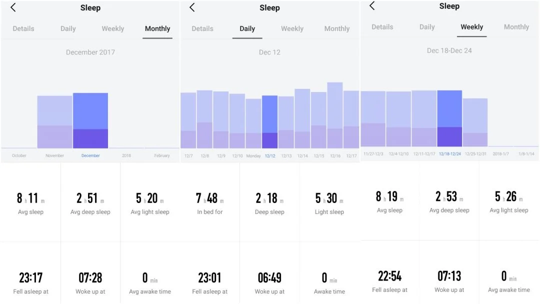 Aki szeret órában aludni, annak hasznos lesz az alvás monitorozása is, melyből nagyon jó kis statisztikákat rak össze az Amazfit. Láthatjuk, hogy átlagosan mennyit töltöttünk alvással, ebből mennyi volt mély, mikor szenderültünk álomra és mikor keltünk, illetve az lappangó alvajárók még arról is értesülhetnek, hogy hány percet kóboroltak éjszaka.