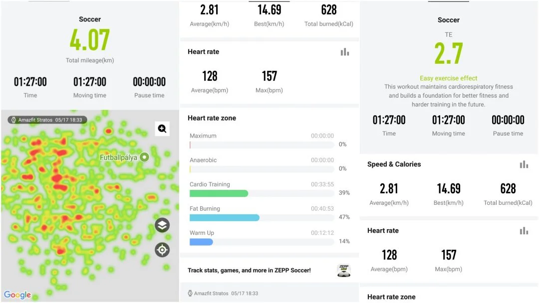 Különösen örültem, mikor az első frissítés alkalmával a futball is a választható aktivitások közé került, ezt is kipróbáltam egy műfüves, nyitott pályán. Teremben valószínűleg sok hasznát nem vesszük majd, de a GPS itt is működik, szóval szépen kirajzolja, hogy merre futkorásztunk.