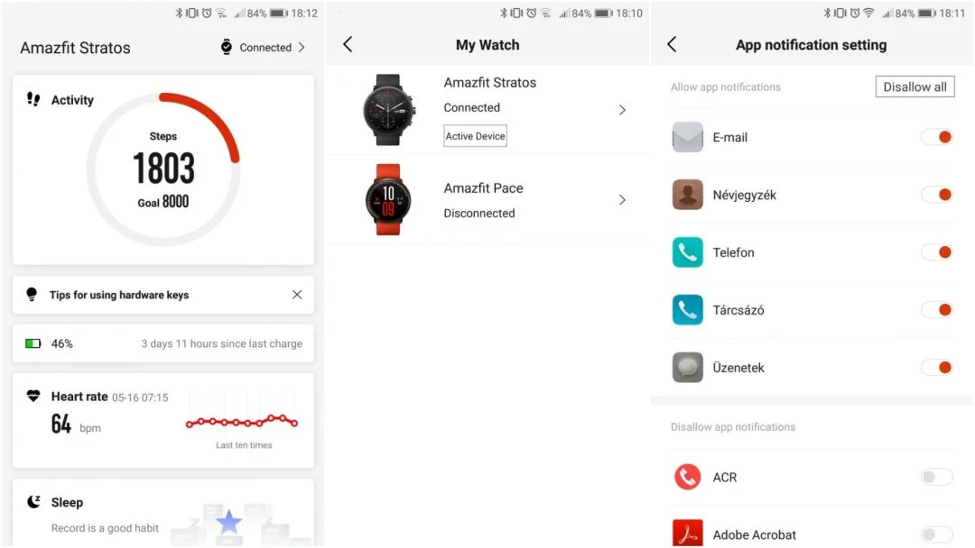 A menüben továbbra is elérhető a felemelésre működésbe lépő háttérvilágítás, de a nappali fényben erre nem igazán lesz szükségünk, hisz a világ legparádésabb, kültéri használatra tervezett kijelzője került bele. A működéséről röviden annyit, hogy minél több fény esik be, annál fényesebben látjuk mi is, tehát egy szikrázó napon szinte kiveri a szemünket még extra fény nélkül is, ezért érdemes automata módban használni. Az applikációhoz történő csatlakozás végtelenül egyszerű: a letöltés után a kameránk segítségével kell beolvasnunk az órán megjelenő QR kódot. Nagyon örültem neki, hogy mindkét Amazfit egyszerre lehet párosítva a telefonhoz, és ki tudjuk választani, hogy éppen melyik legyen az aktív eszköz. Az átköltözés nem tartogatott meglepetések, nem veszített adatot a telefonos app, így ott tudtam folytatni mindent, ahol abbahagytam.