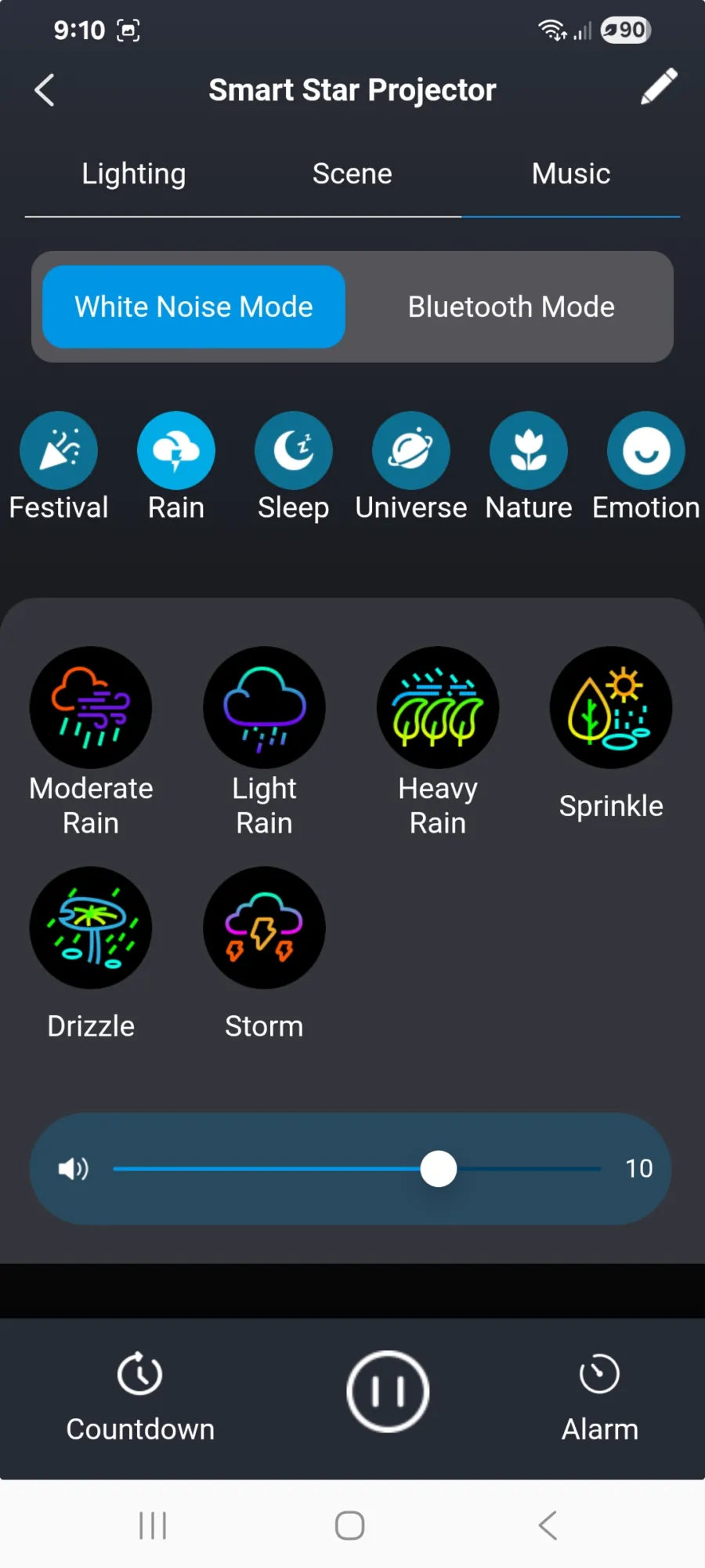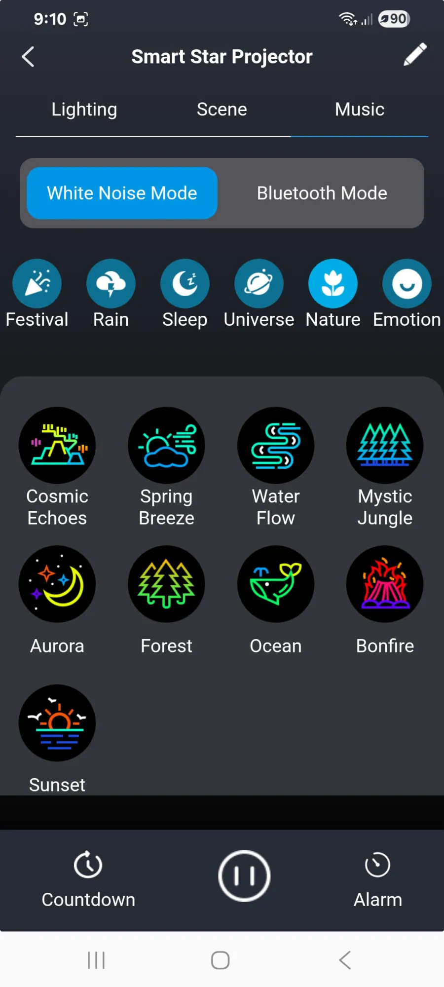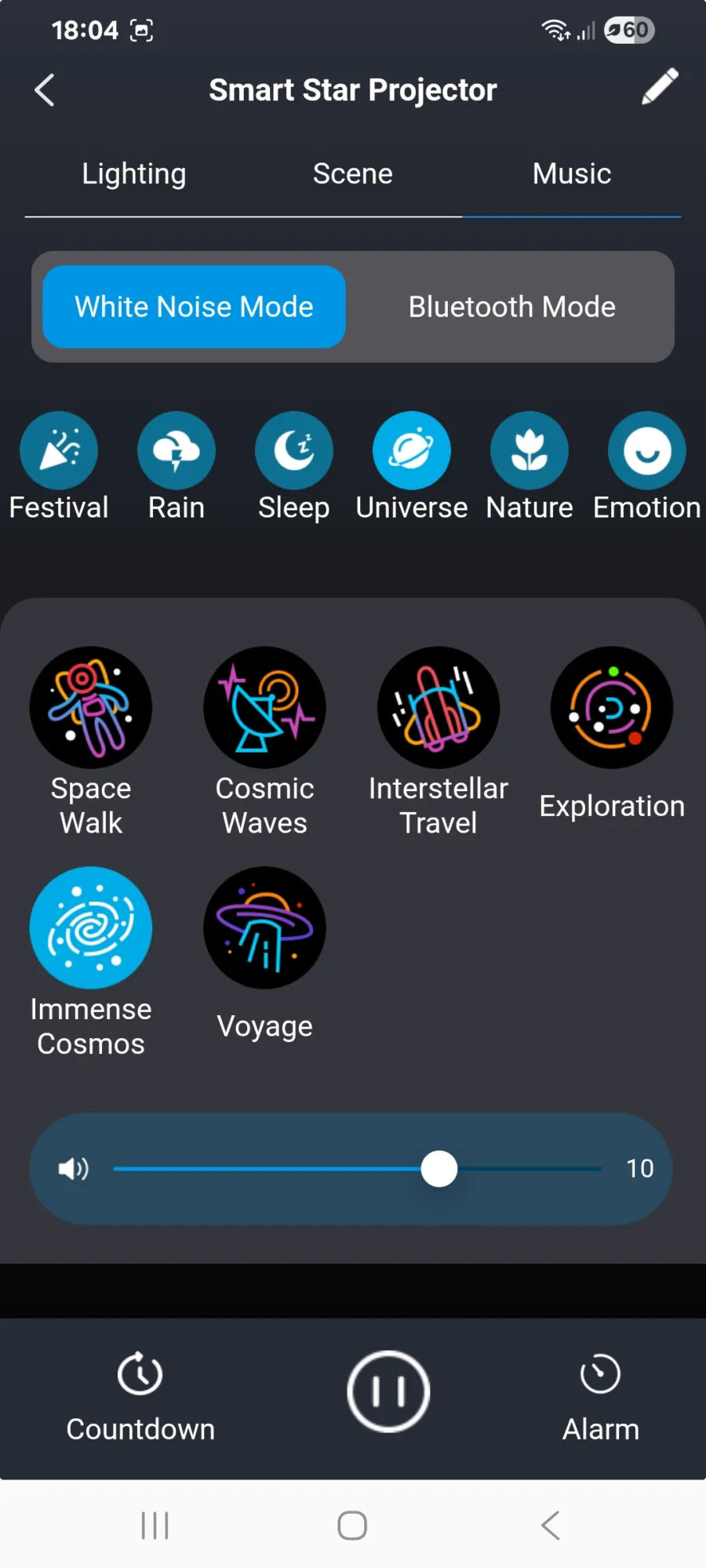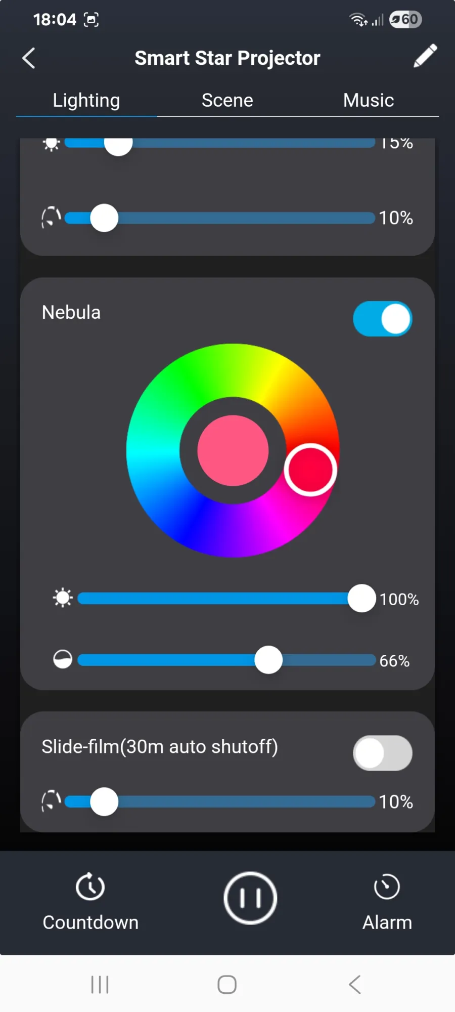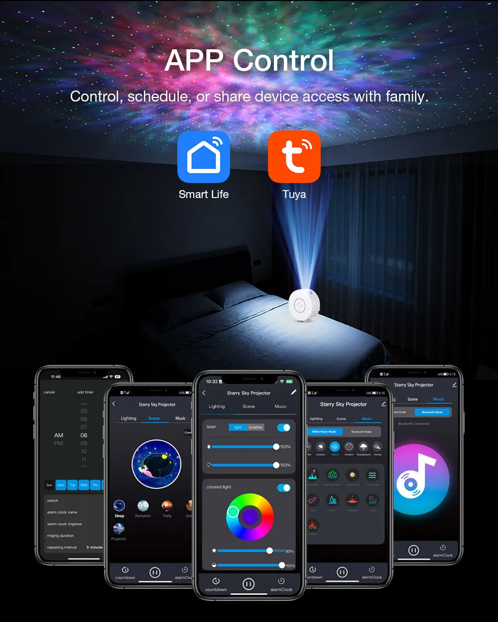 Ébresztőóraként szintén működik (igaz az időt nem jelzi, csak elkezd a kiválasztott hangon zenélni, amikor eljött az idő), és az appban minden funkció elérhető – távirányító nincs a dobozban, de a mobilod a SmartLife alkalmazással teljes értékűen helyettesíti azt. Innen állítható a fényerő, a színek, a forgás sebessége, valamint külön szabályozható a nebulák és a csillagok fényereje is.